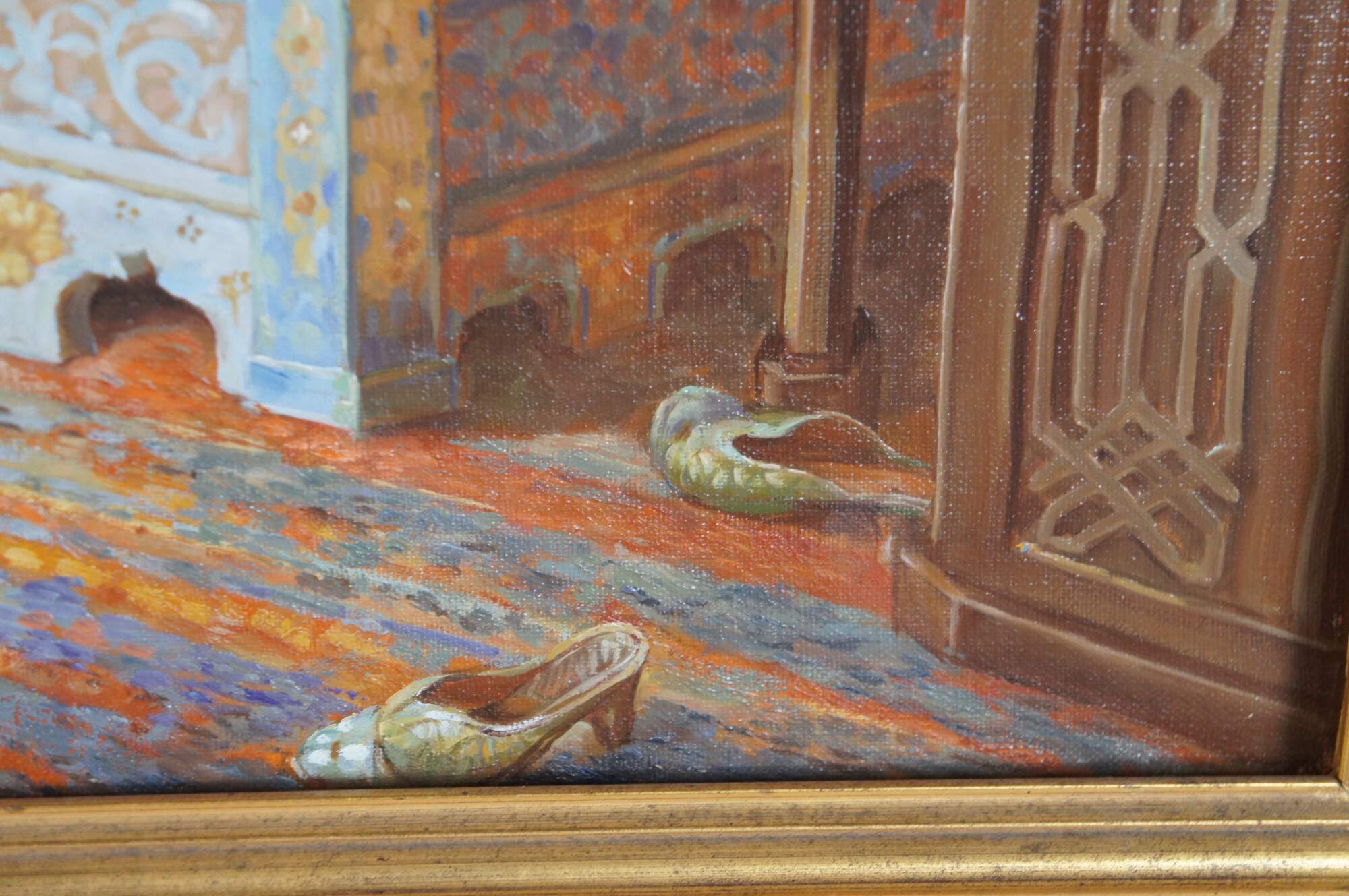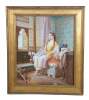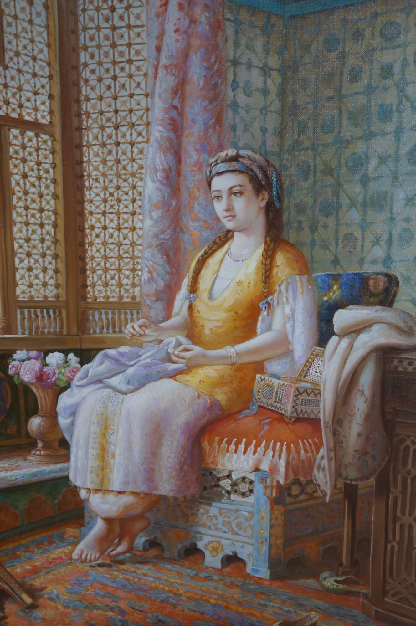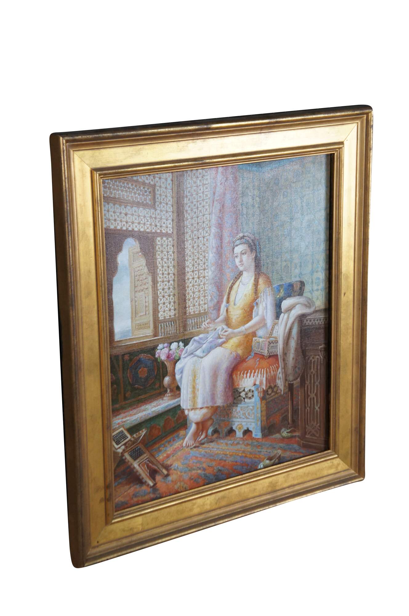 Dreaminess" was created by the British artist Dorofield Hardy (1882–1920). The artwork depicts a woman in traditional Ottoman-style dress seated in an ornately decorated room embroidering.. The setting features classic Orientalist elements, including intricate lattice windows, a wool rug, tiled windows and colorful furniture. This contemporary example was painted at the end of the 20th century. Framed in wood with a gold finish.