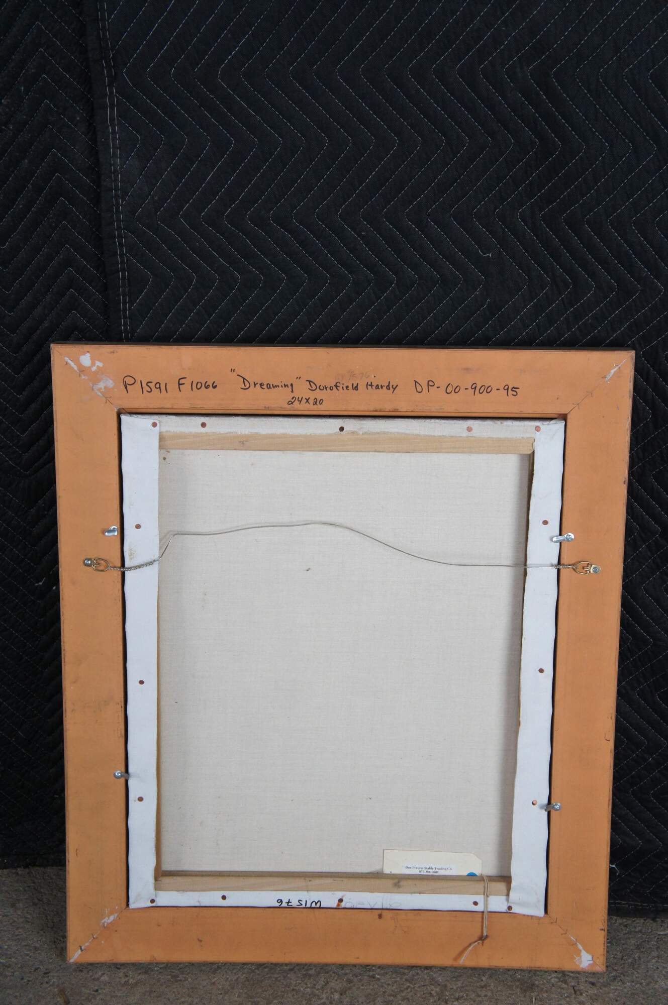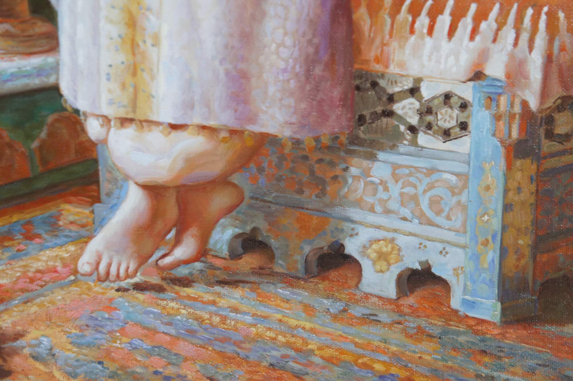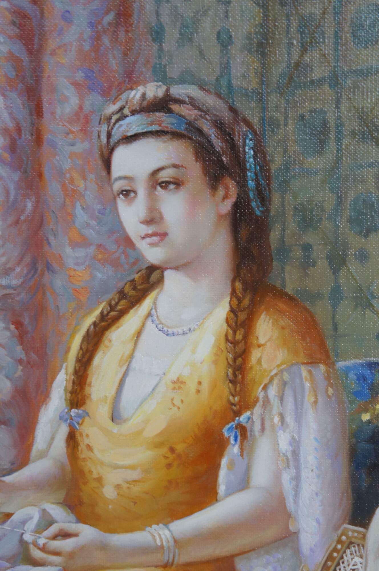 Dreaminess" was created by the British artist Dorofield Hardy (1882–1920). The artwork depicts a woman in traditional Ottoman-style dress seated in an ornately decorated room embroidering.. The setting features classic Orientalist elements, including intricate lattice windows, a wool rug, tiled windows and colorful furniture. This contemporary example was painted at the end of the 20th century. Framed in wood with a gold finish.