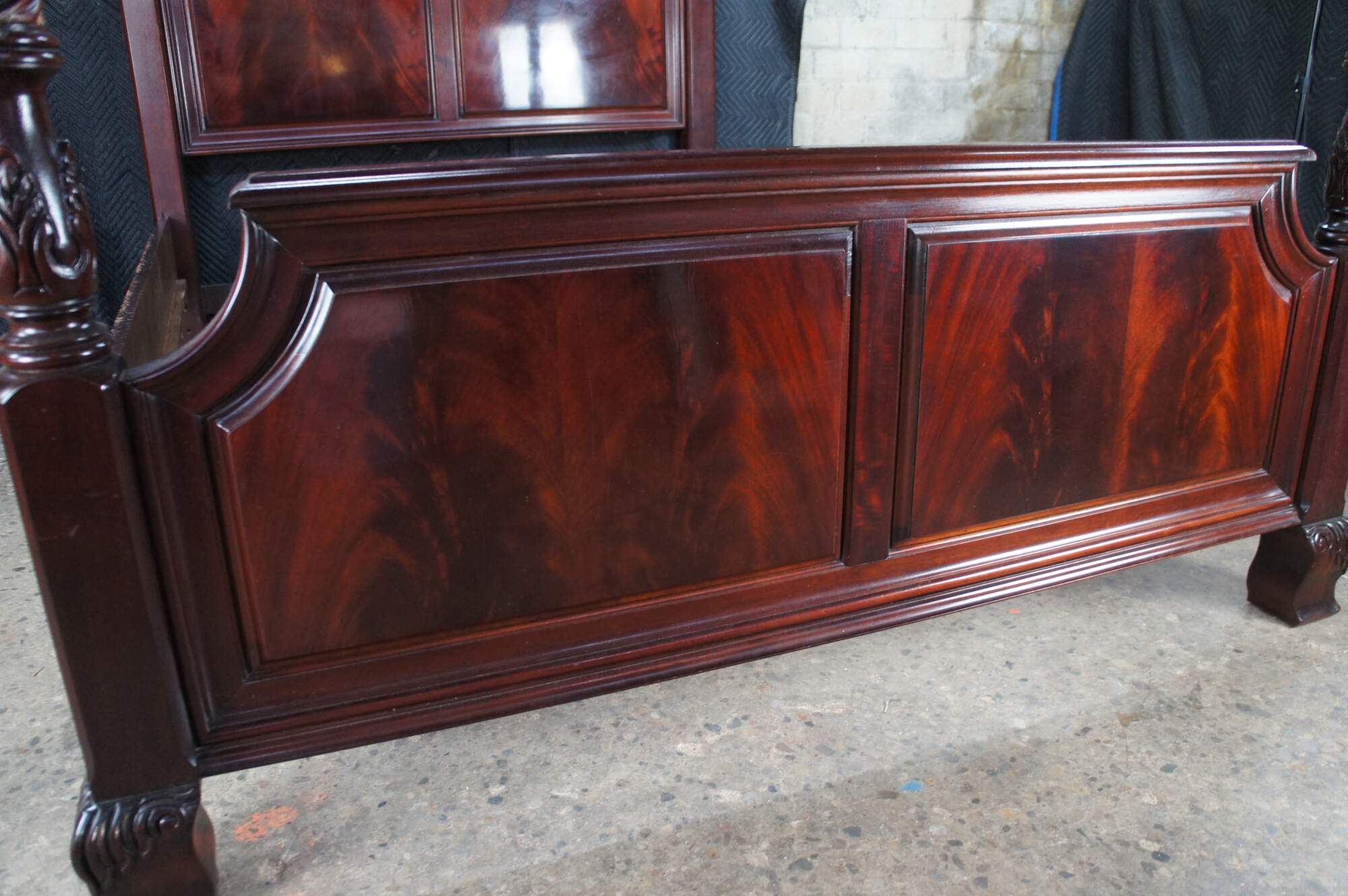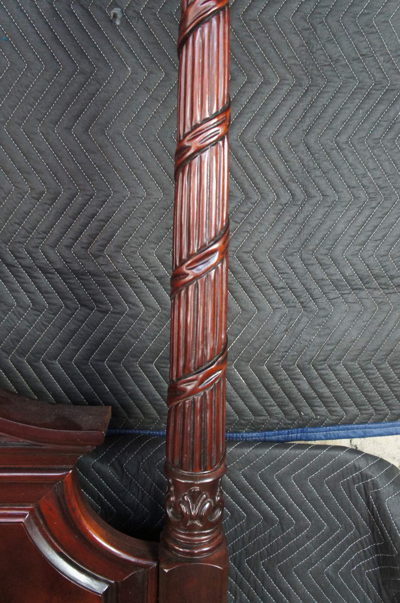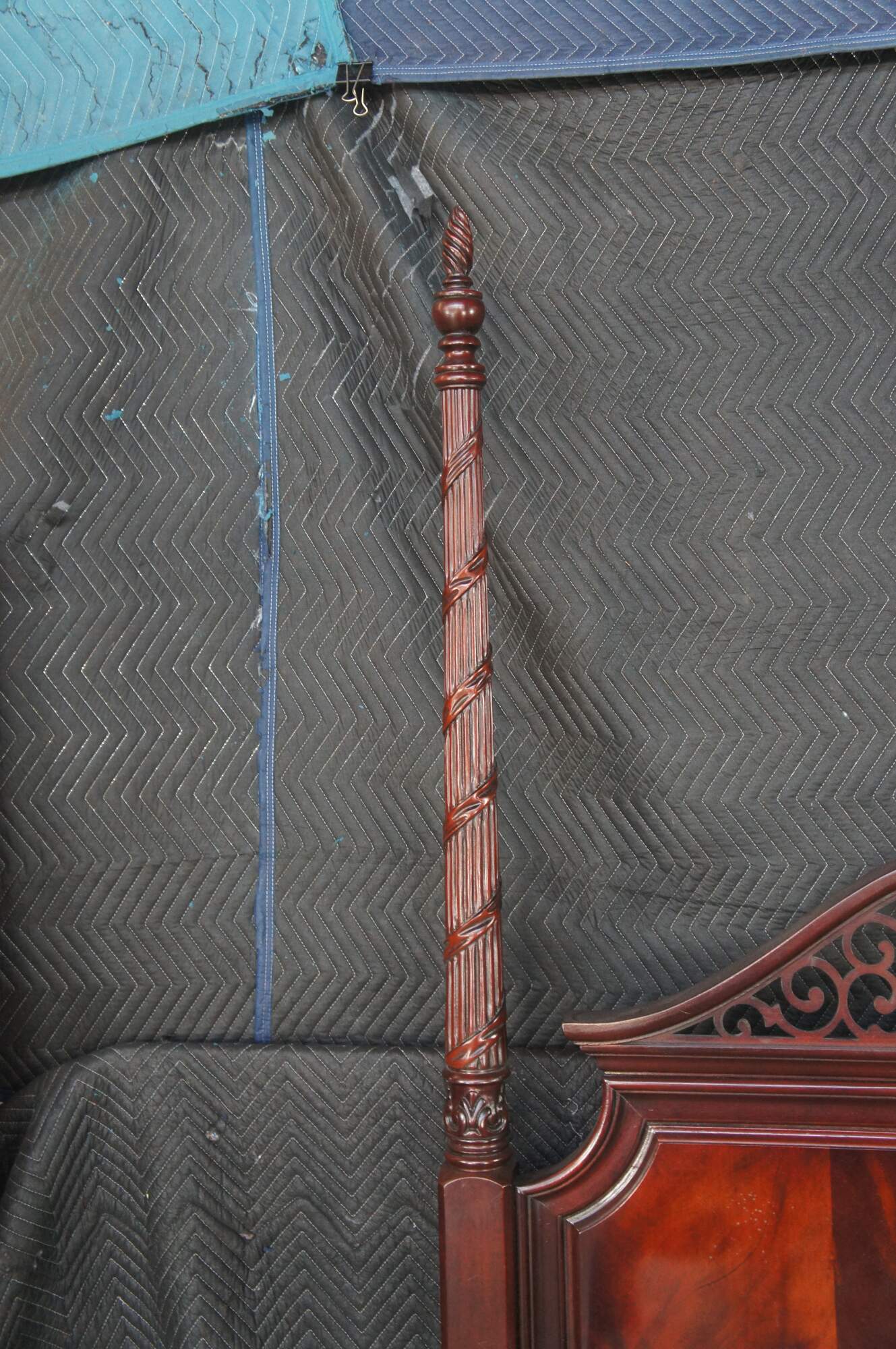 Vintage Thomasville English Chippendale / Georgian style king-size poster bed. Made from mahogany featuring a pierced / reticulated fretwork design with serpentine open pediment, flame grain panels, and tall fluted posts with acanthus accents