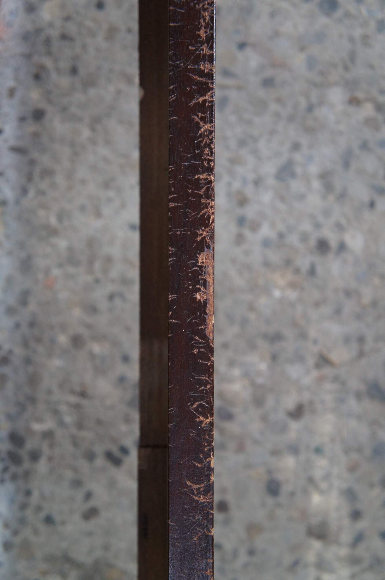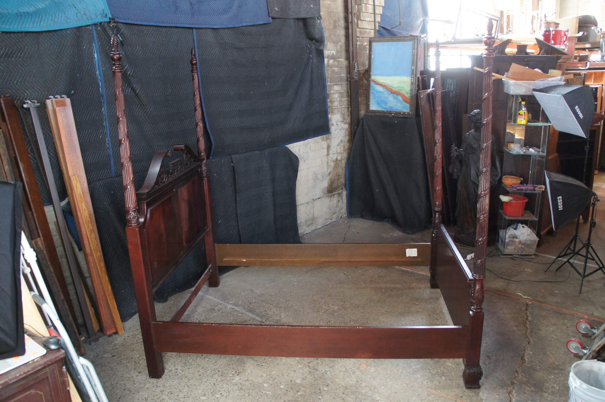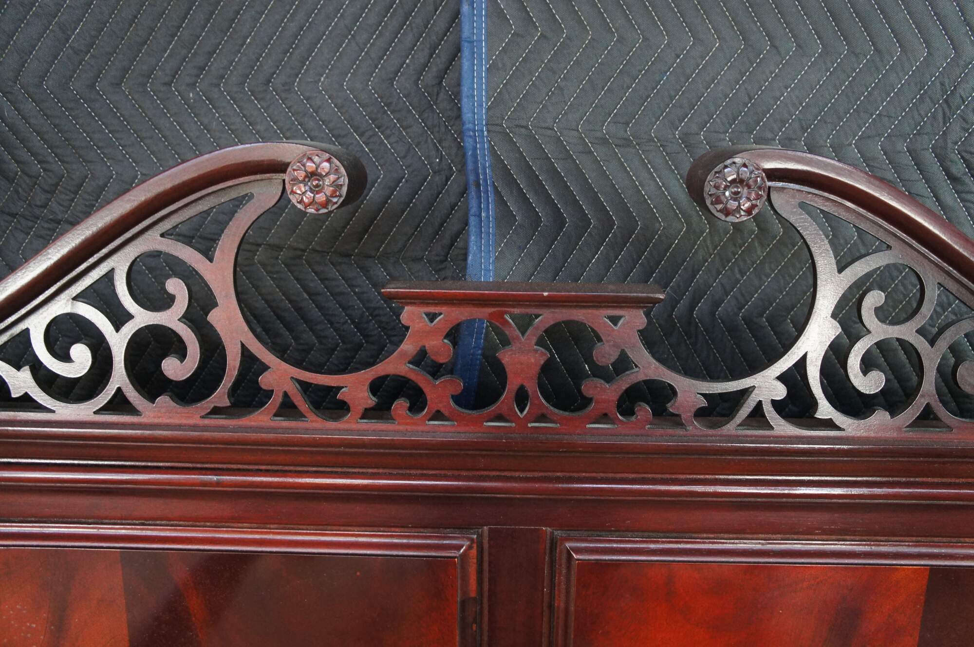 Vintage Thomasville English Chippendale / Georgian style king-size poster bed. Made from mahogany featuring a pierced / reticulated fretwork design with serpentine open pediment, flame grain panels, and tall fluted posts with acanthus accents