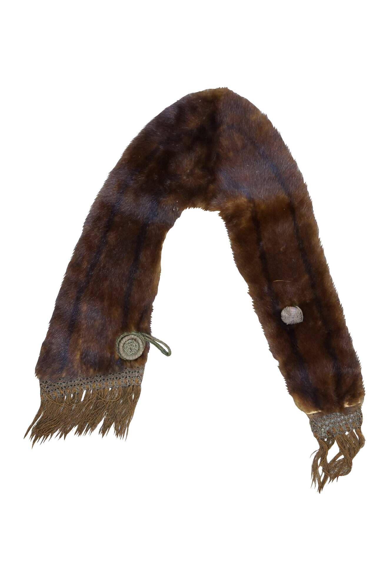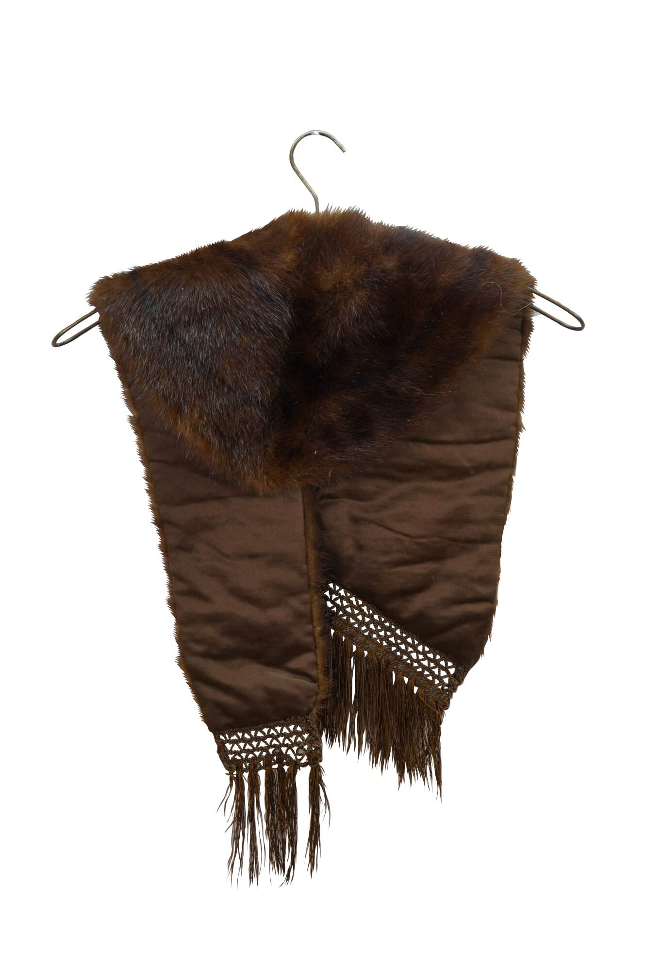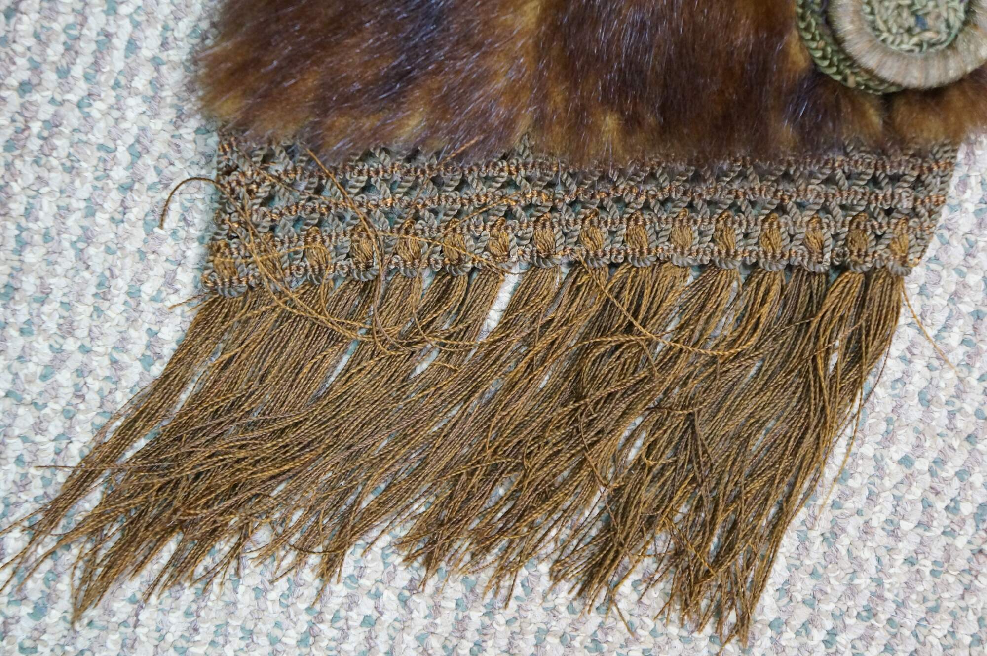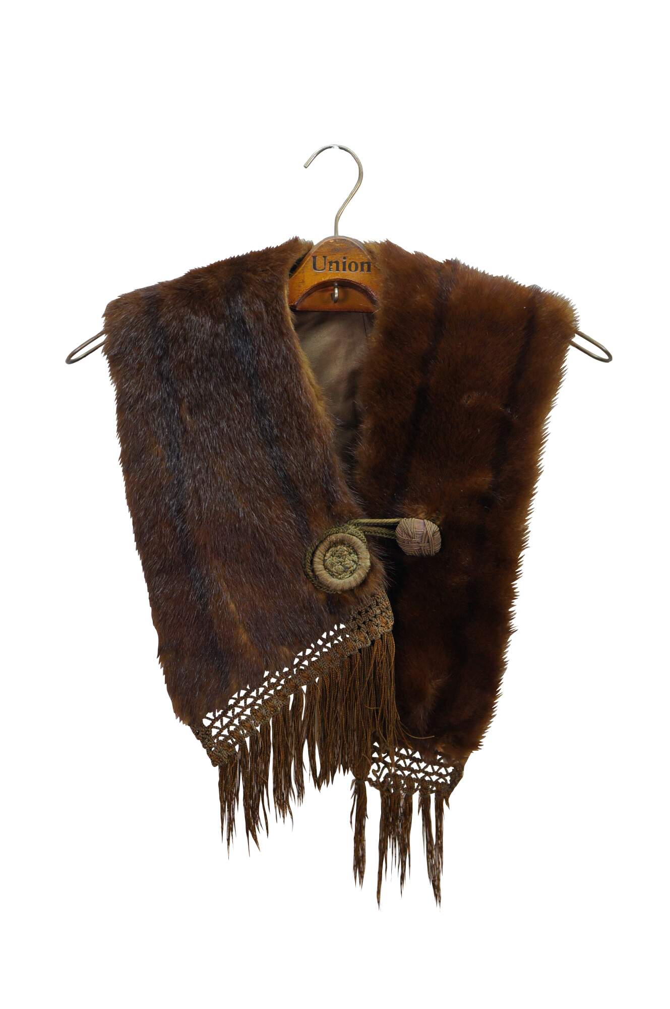 Vintage brown mink fur stole featuring a decorative button closure and fringed edges. Includes antique union folding coat hanger.