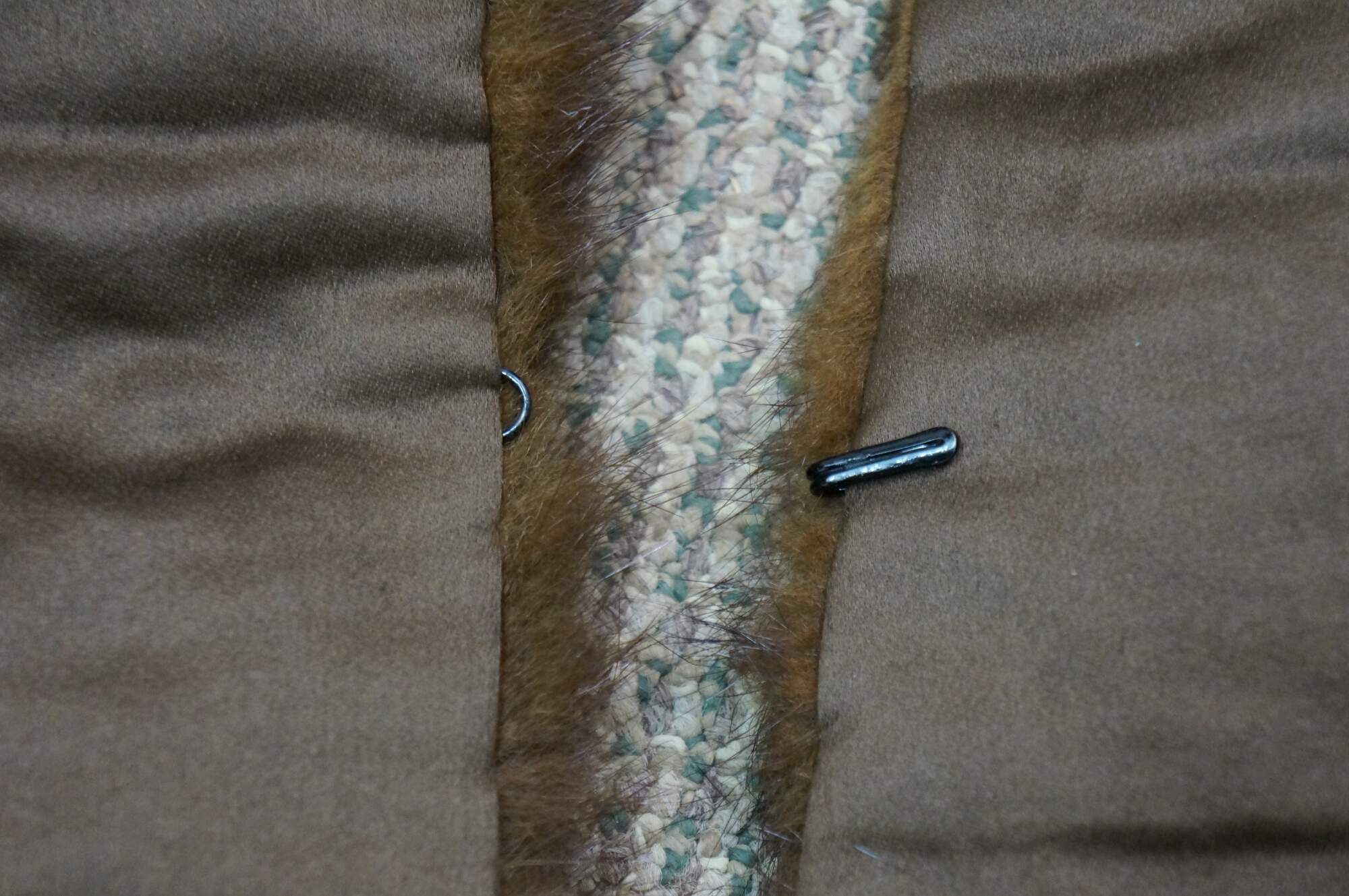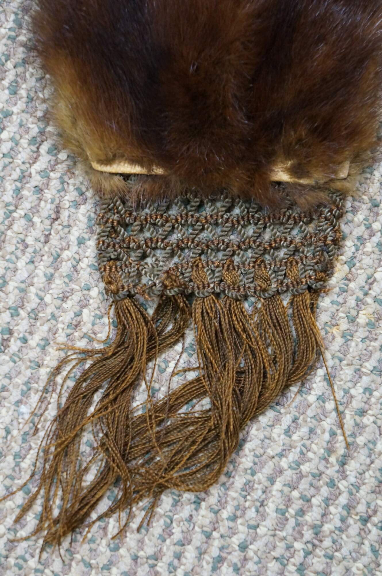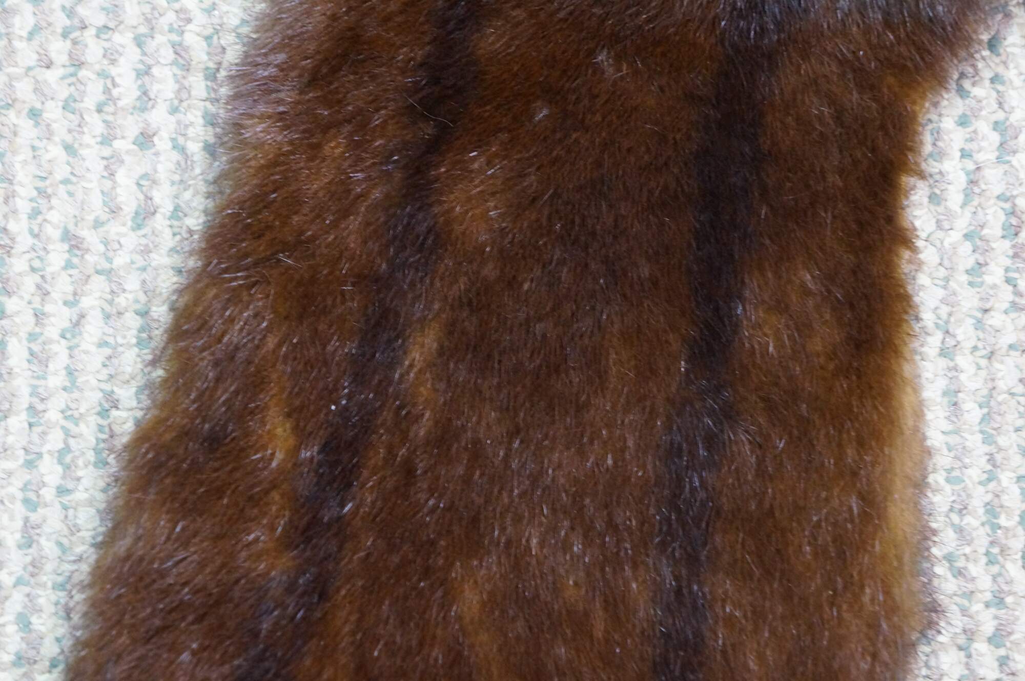 Vintage brown mink fur stole featuring a decorative button closure and fringed edges. Includes antique union folding coat hanger.