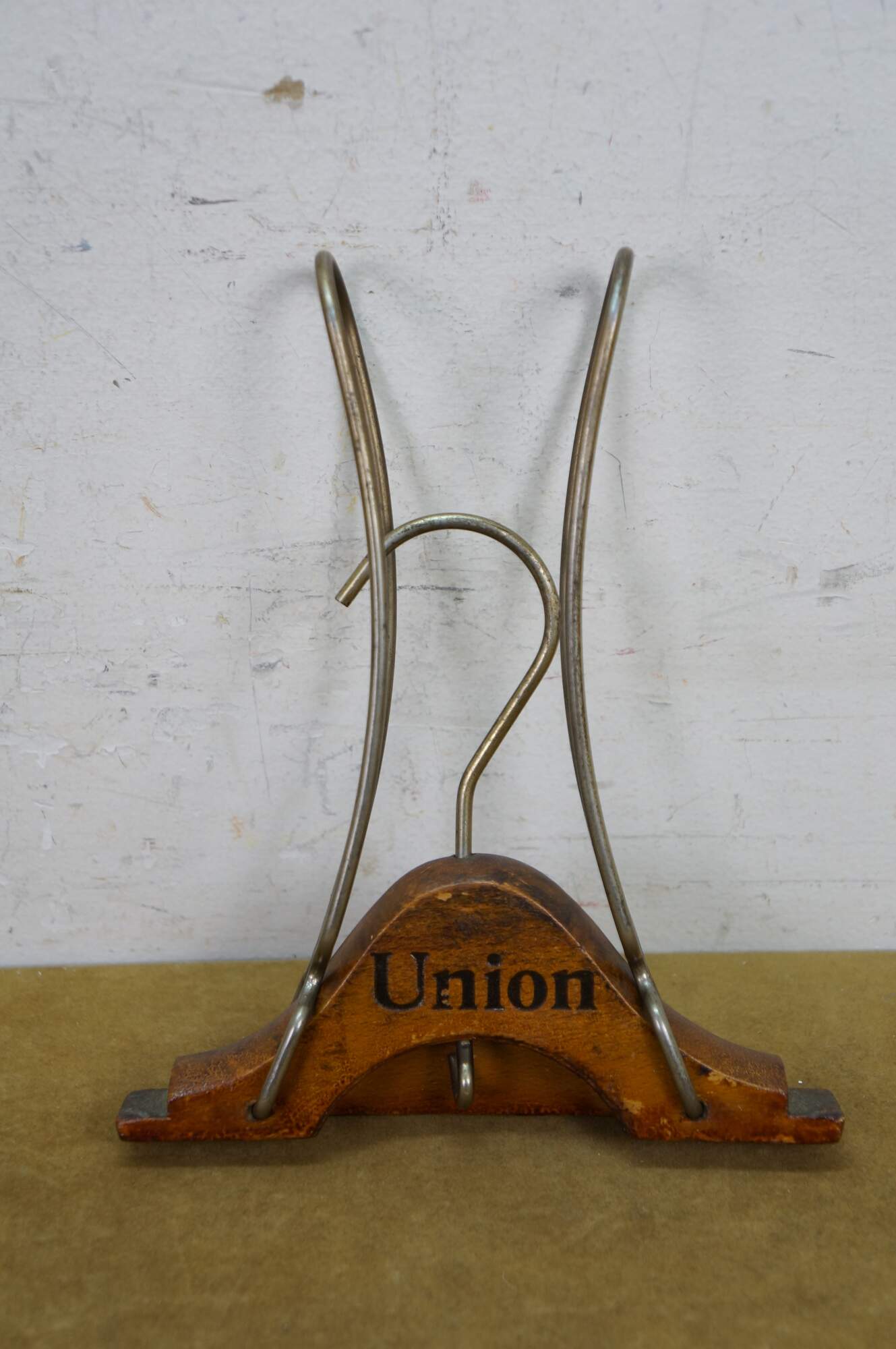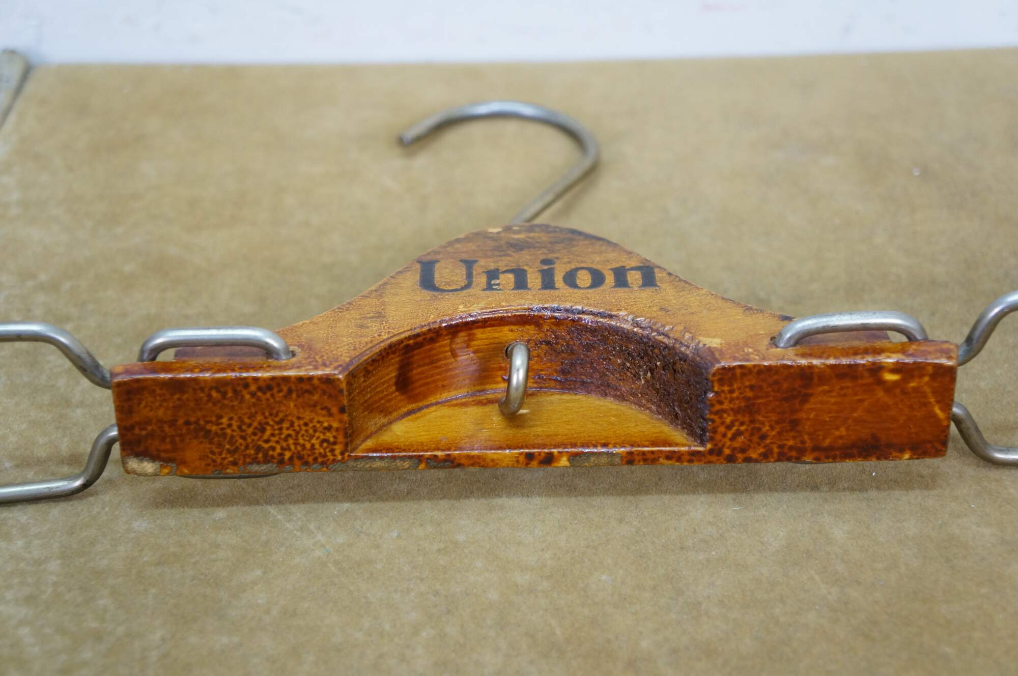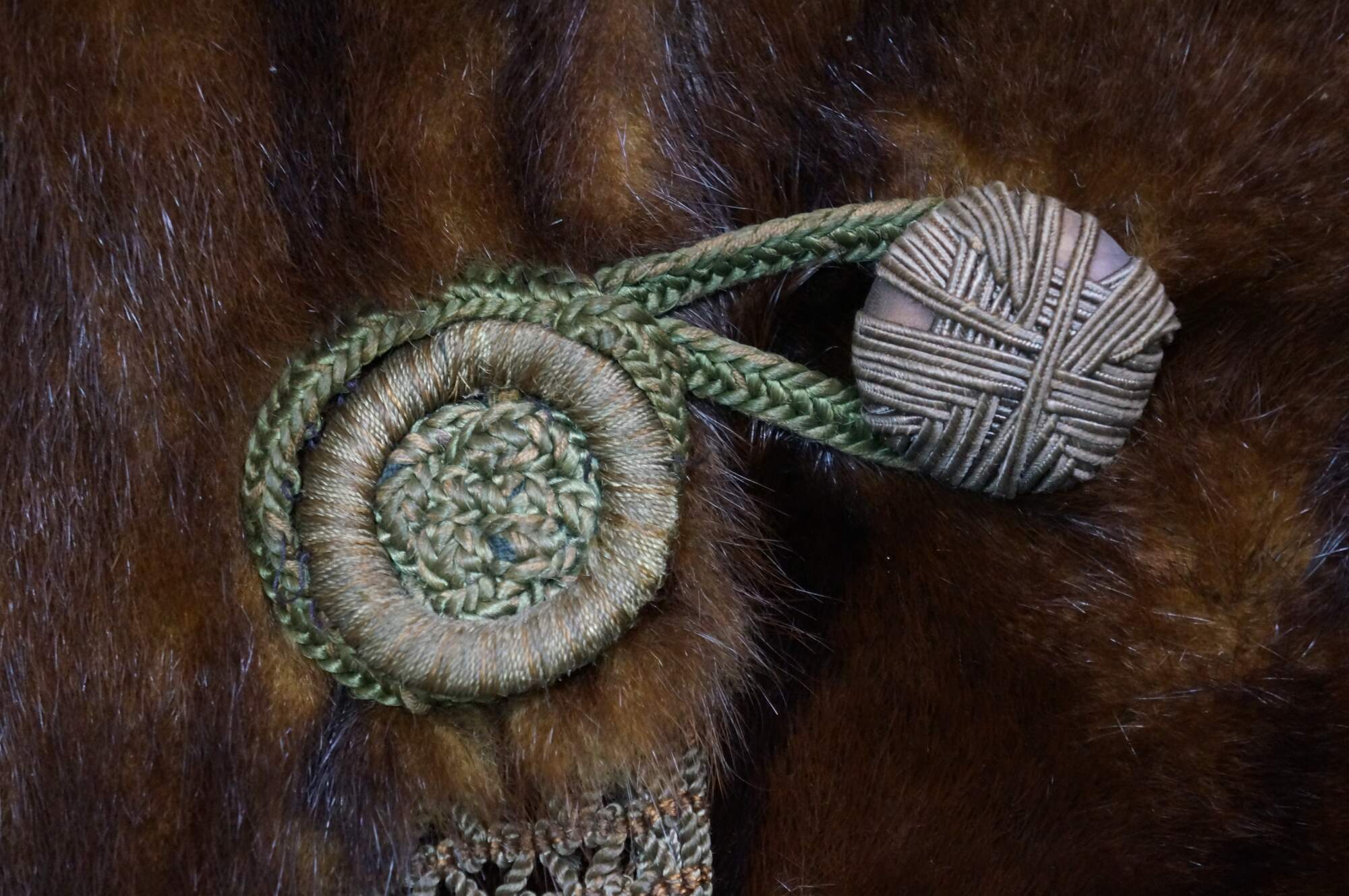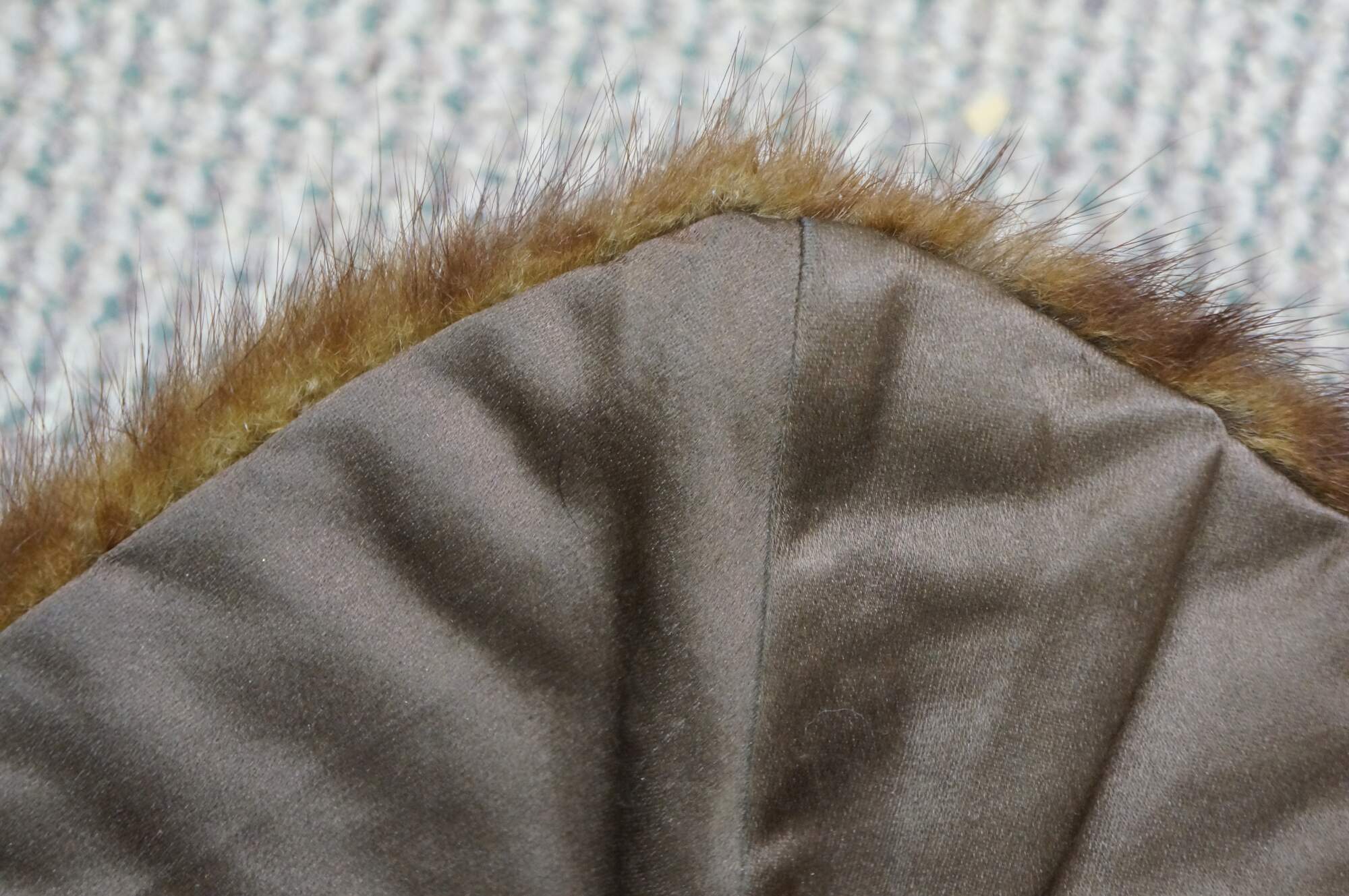 Vintage brown mink fur stole featuring a decorative button closure and fringed edges. Includes antique union folding coat hanger.
