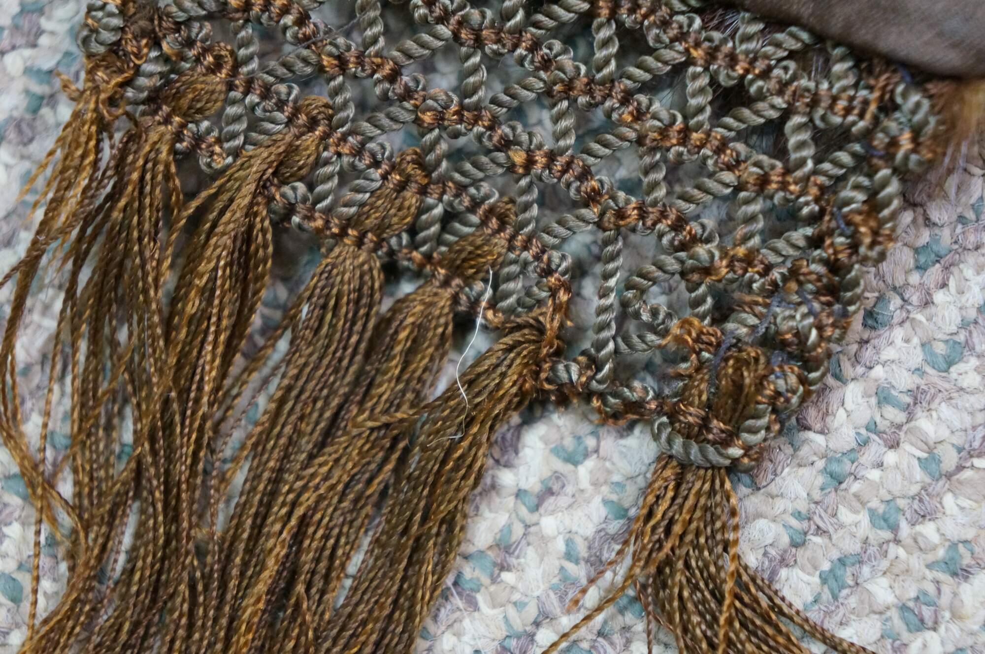 Gentle wear; some discoloration to decoration, missing tassel/trim