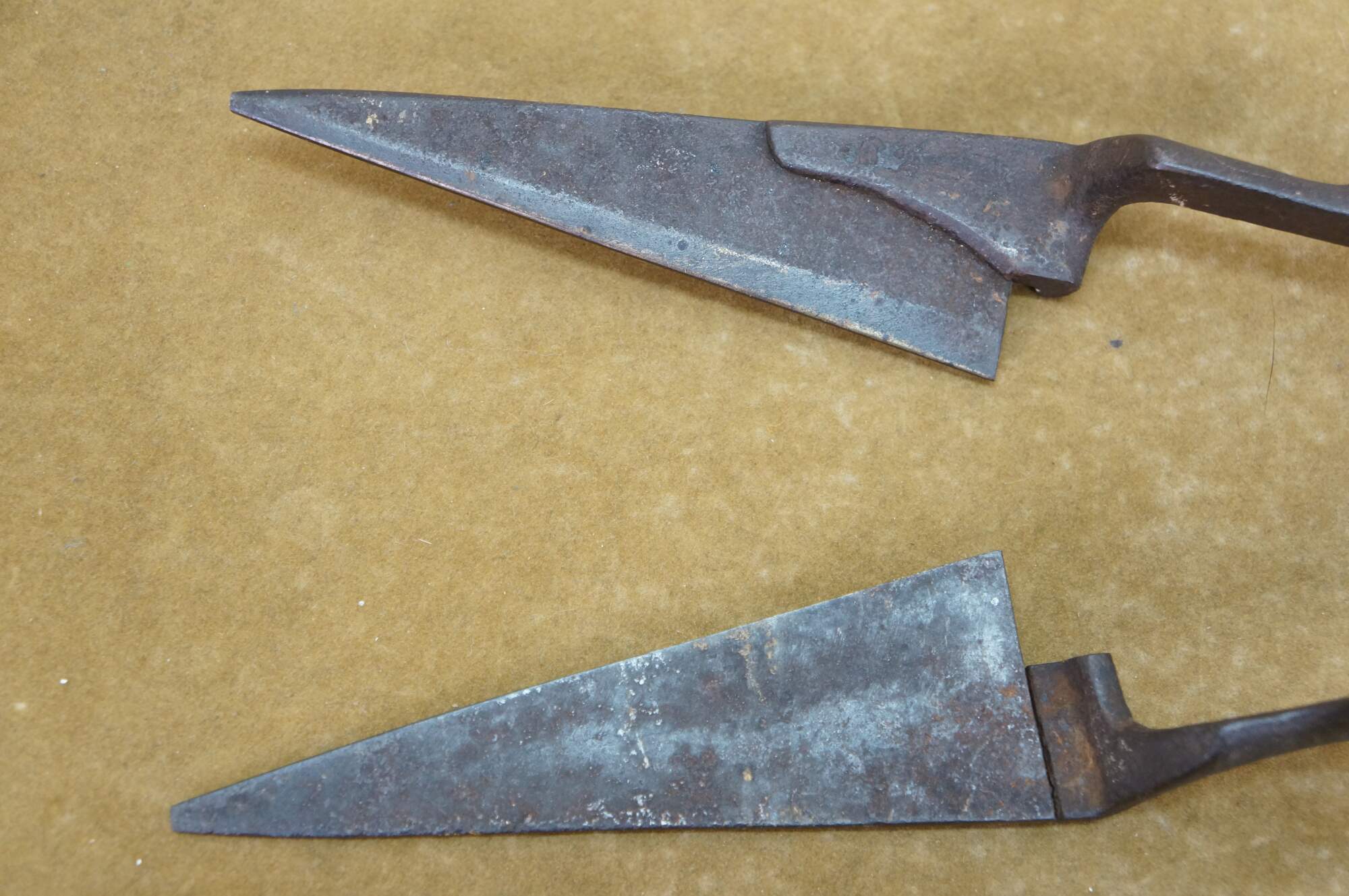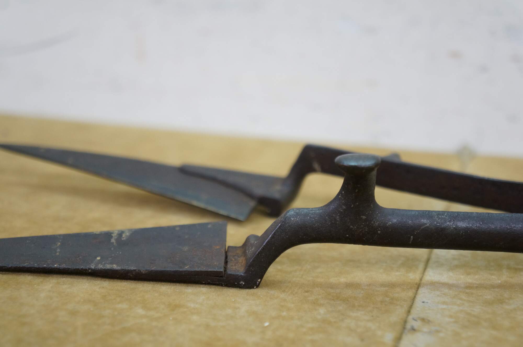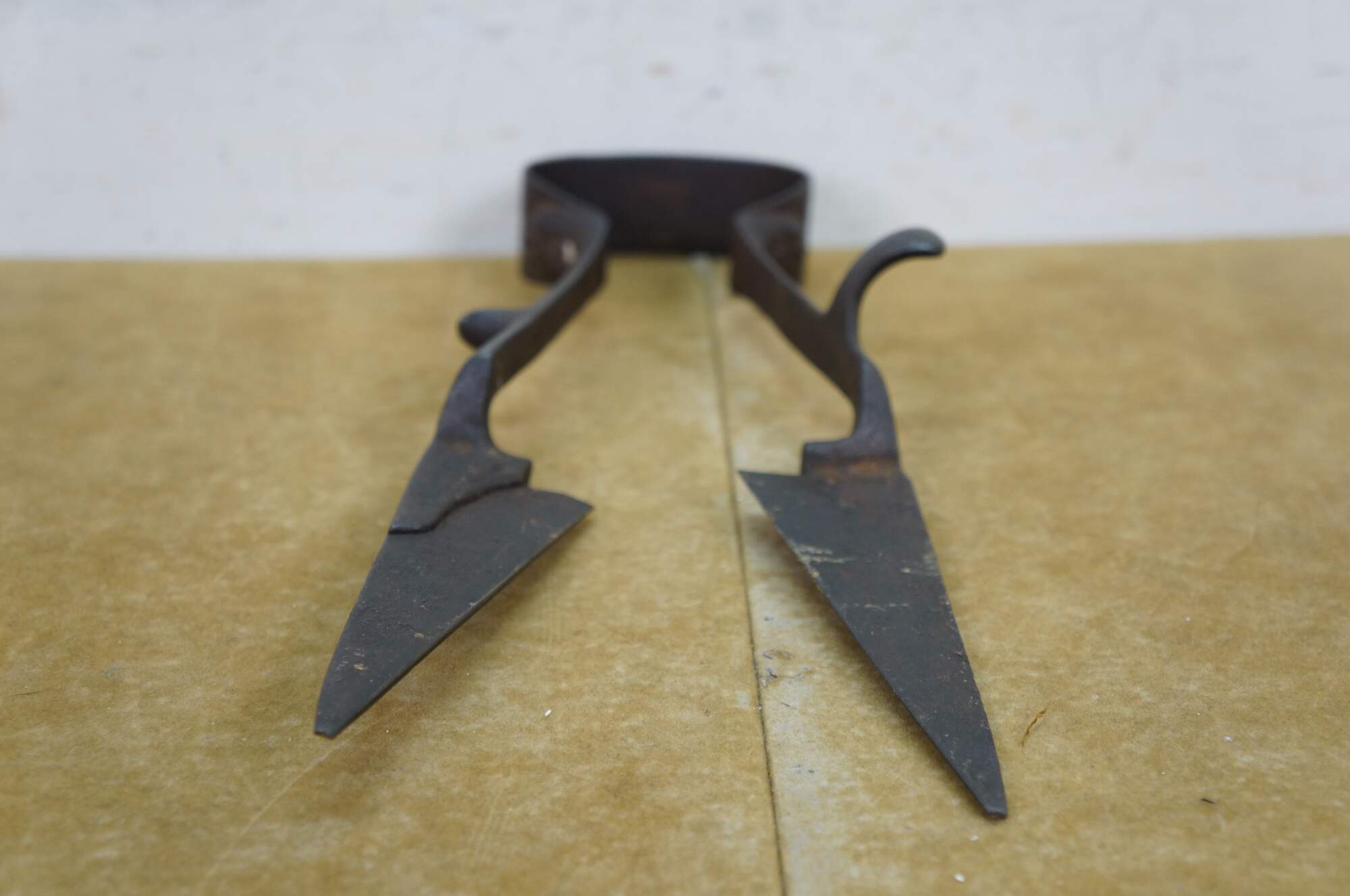 Antique primitive wrought iron industrial farmhouse shears / scissors, historically used for manually shearing wool from sheep. Features a bow-shaped spring handle and long, pointed blades. Likely H. Boker & Company.