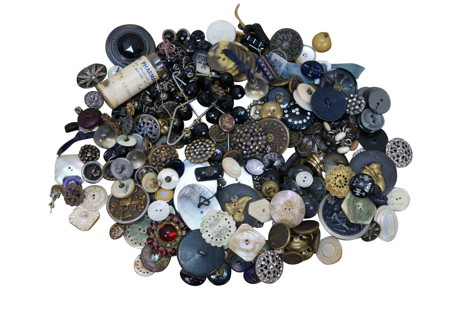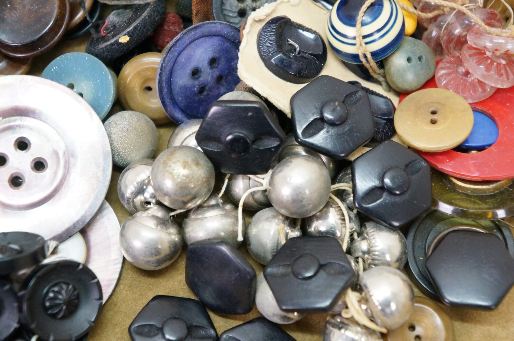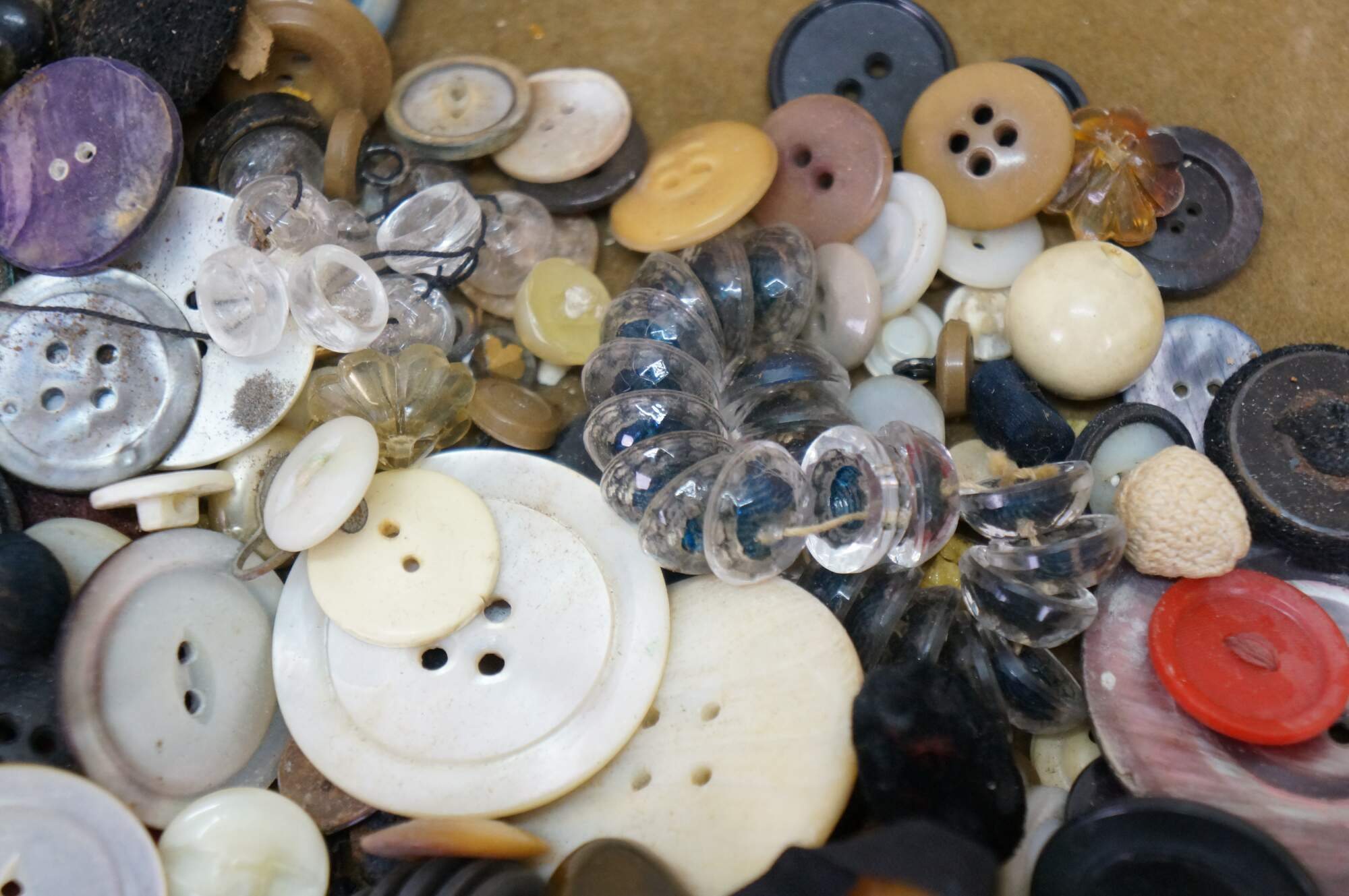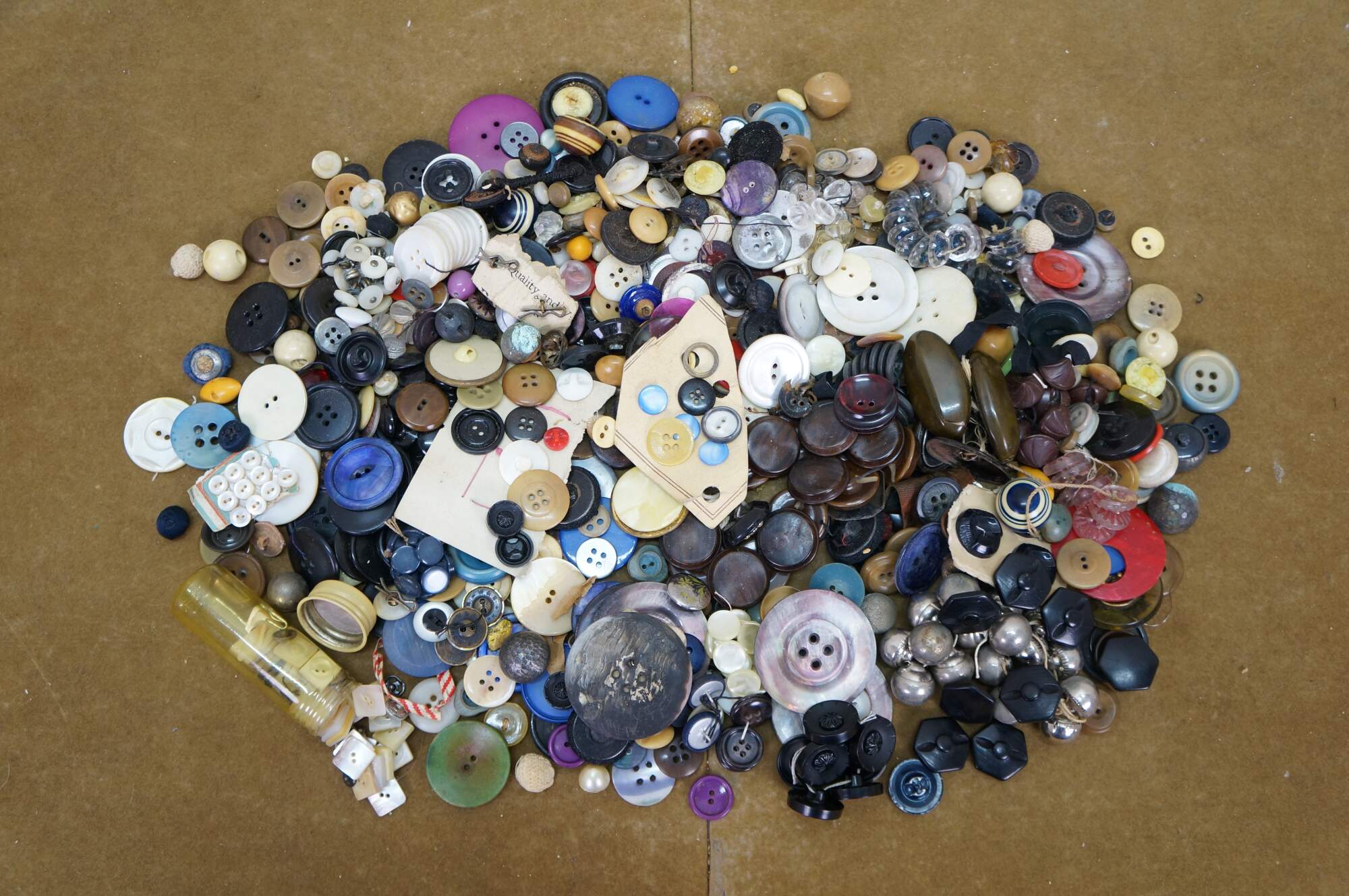 Antique and vintage button lot consisting of a large, assorted collection spanning various materials, sizes, and colors. Materials include a diverse mix including celluloid, bakelite, Lucite, glass, metal, and mop (mother-of-pearl).