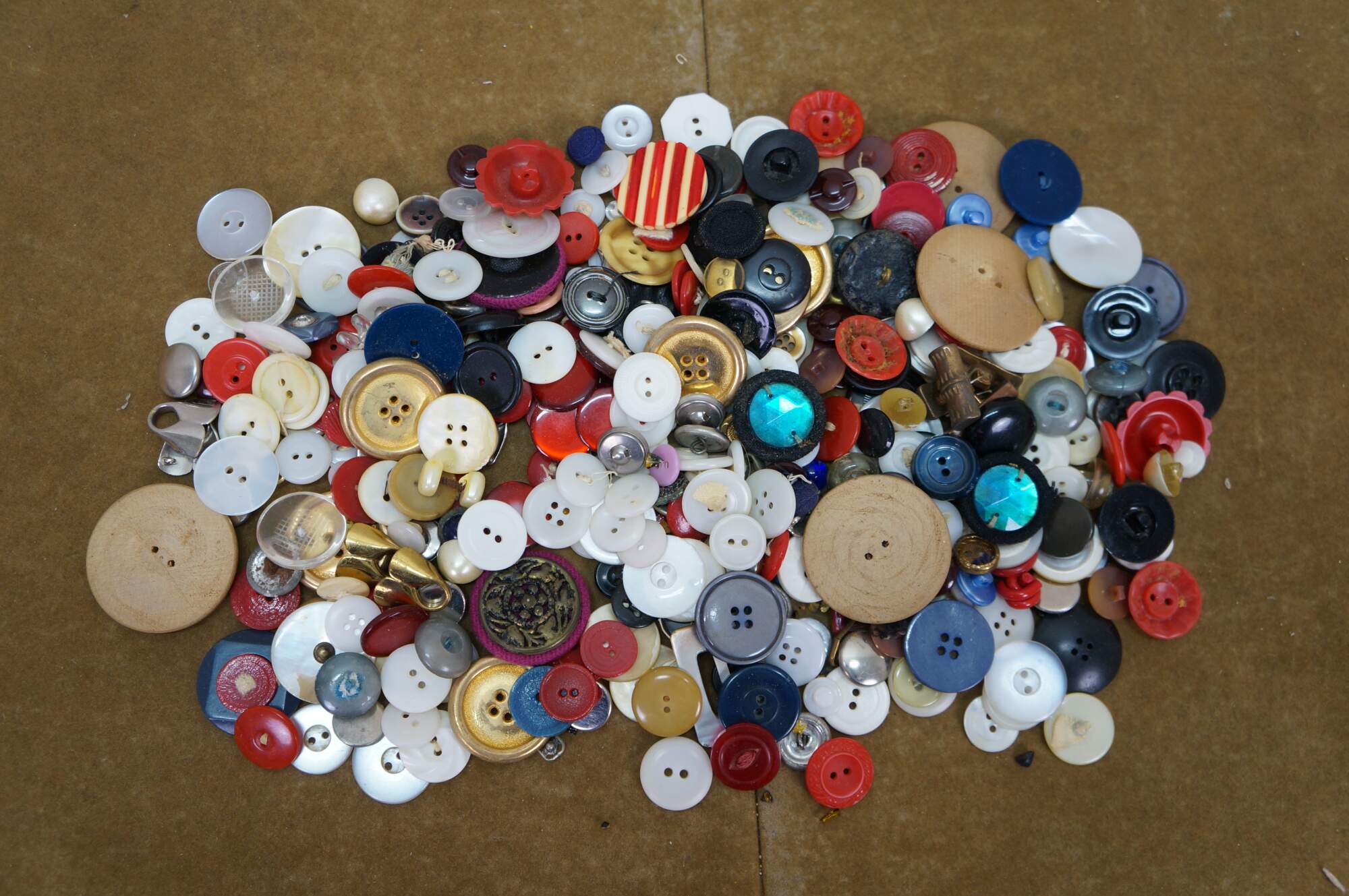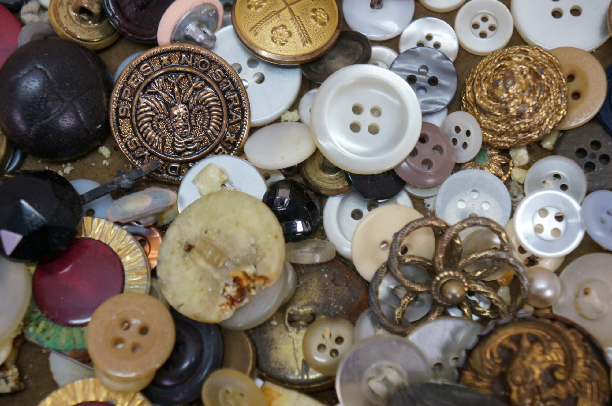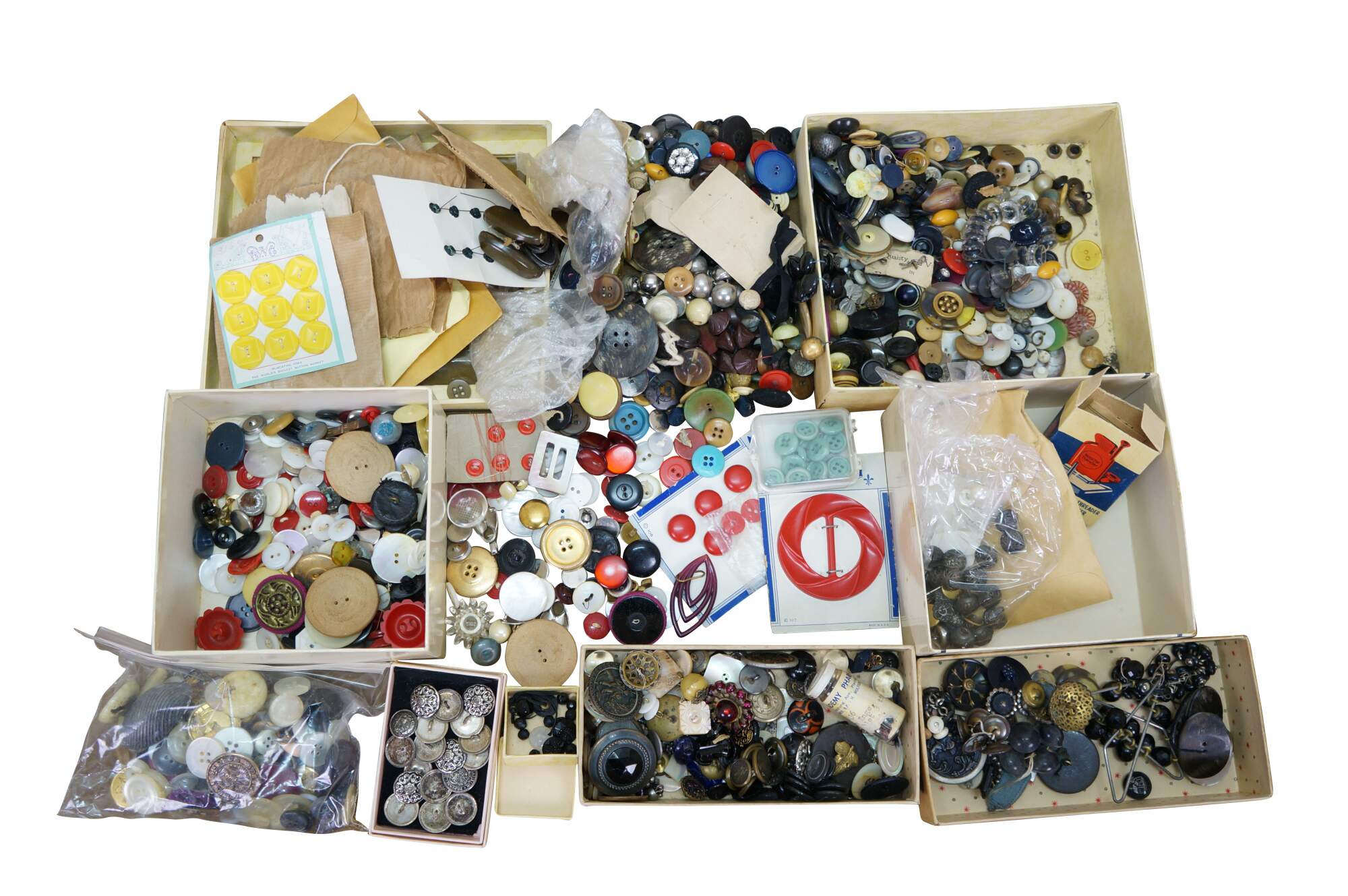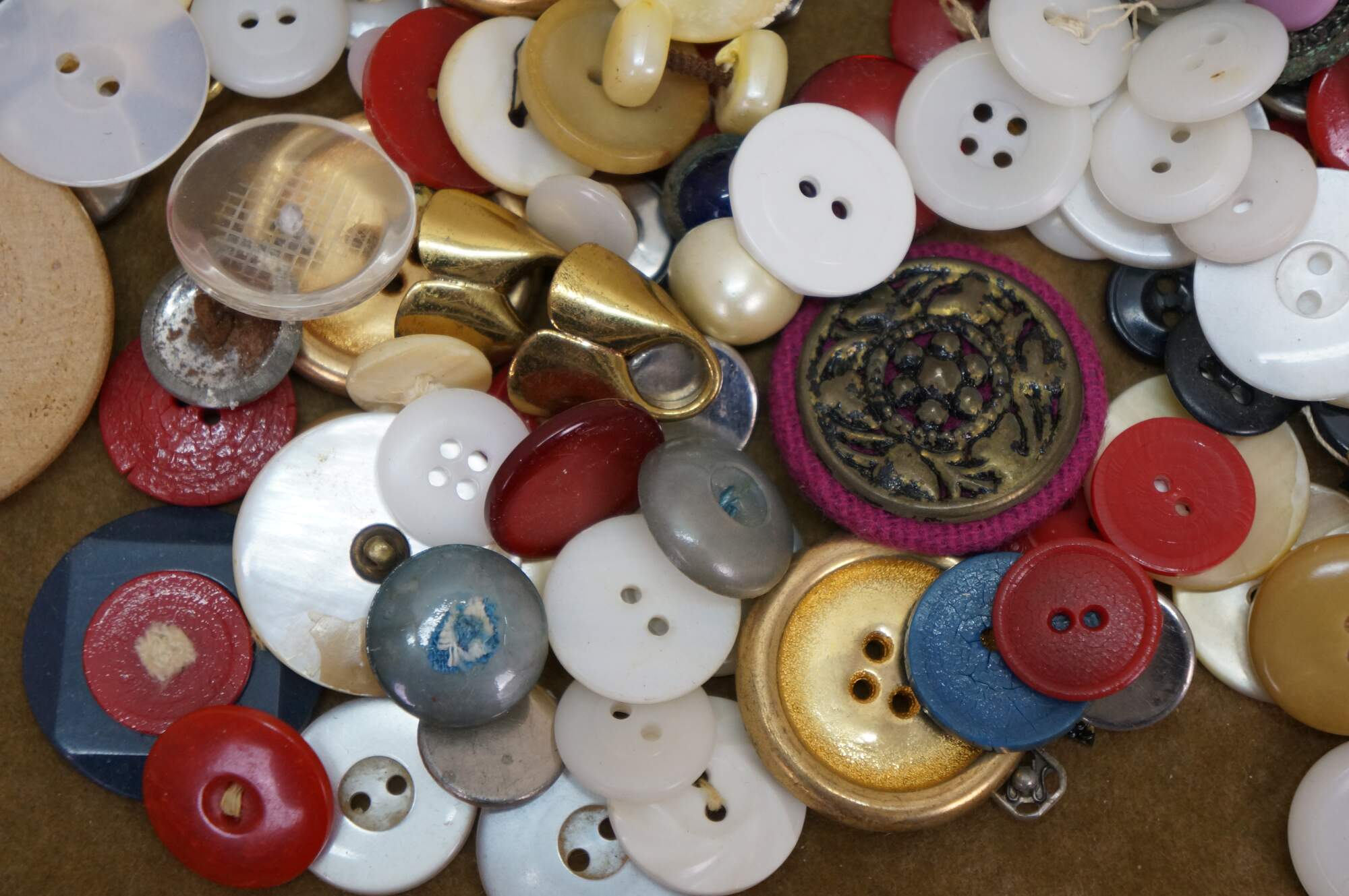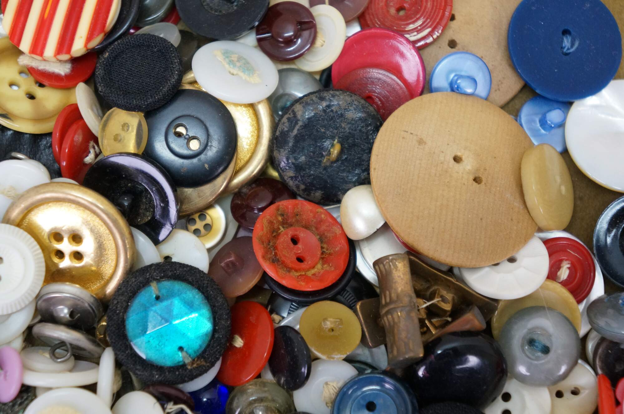 Antique and vintage button lot consisting of a large, assorted collection spanning various materials, sizes, and colors. Materials include a diverse mix including celluloid, bakelite, Lucite, glass, metal, and mop (mother-of-pearl).