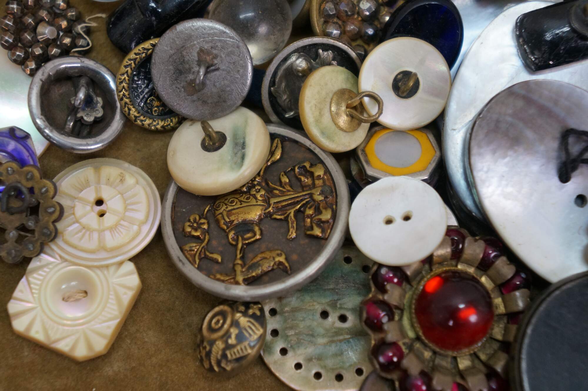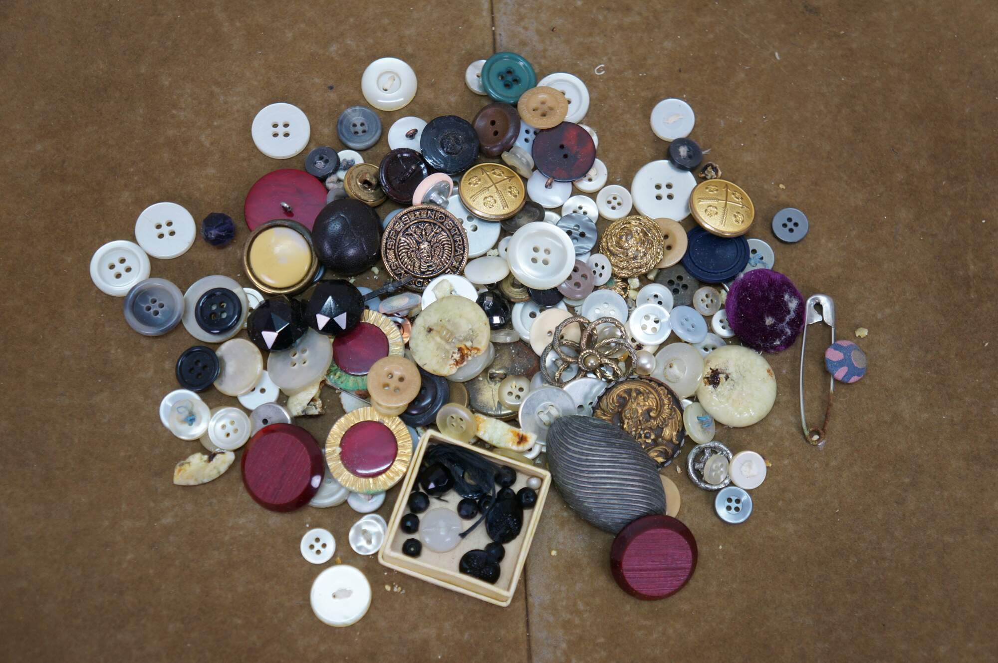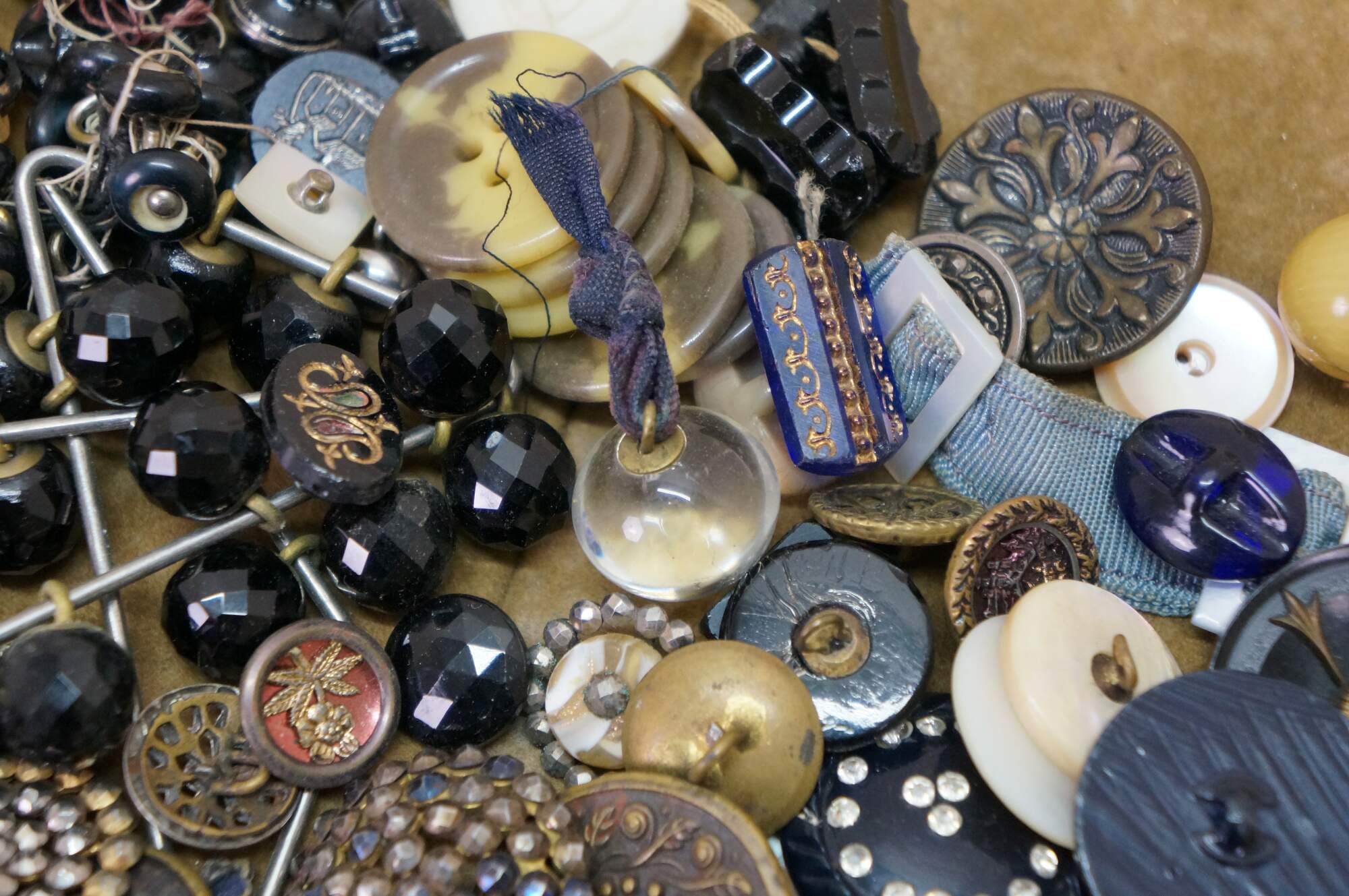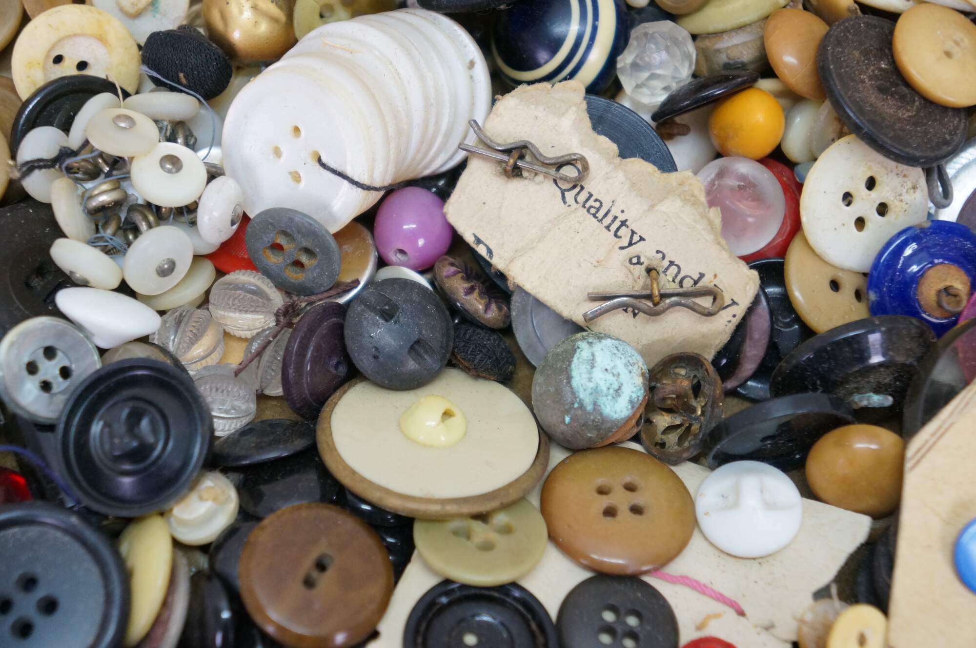 Antique and vintage button lot consisting of a large, assorted collection spanning various materials, sizes, and colors. Materials include a diverse mix including celluloid, bakelite, Lucite, glass, metal, and mop (mother-of-pearl).