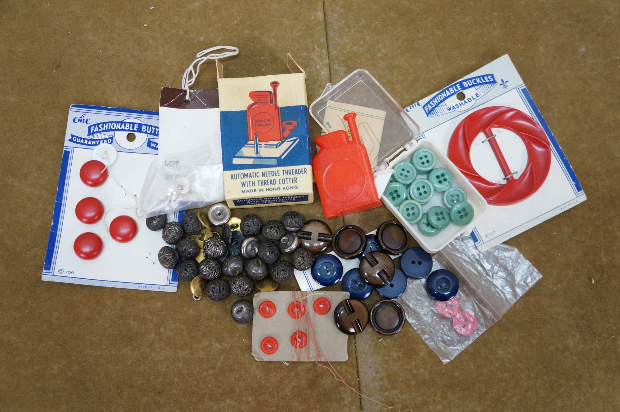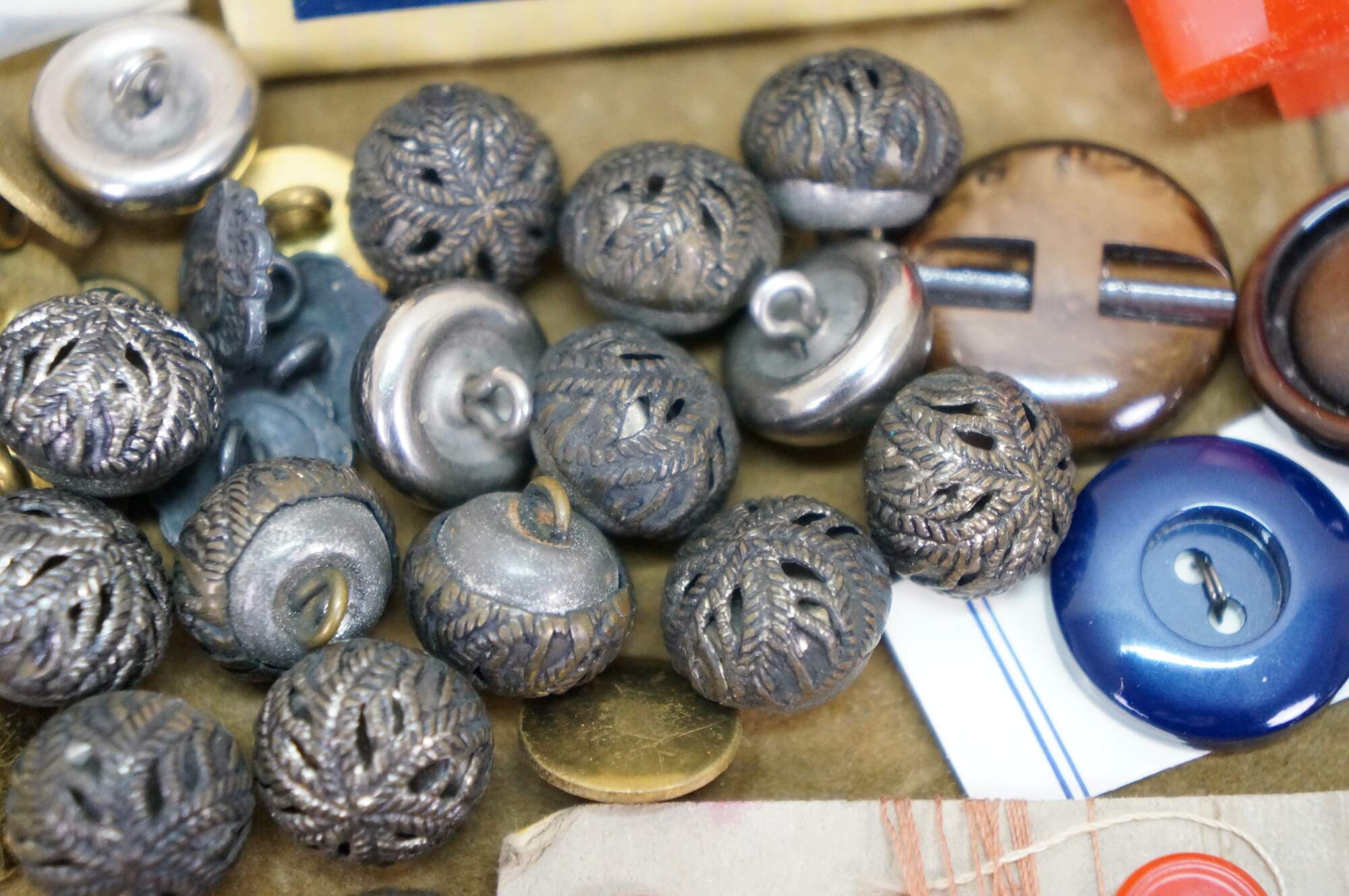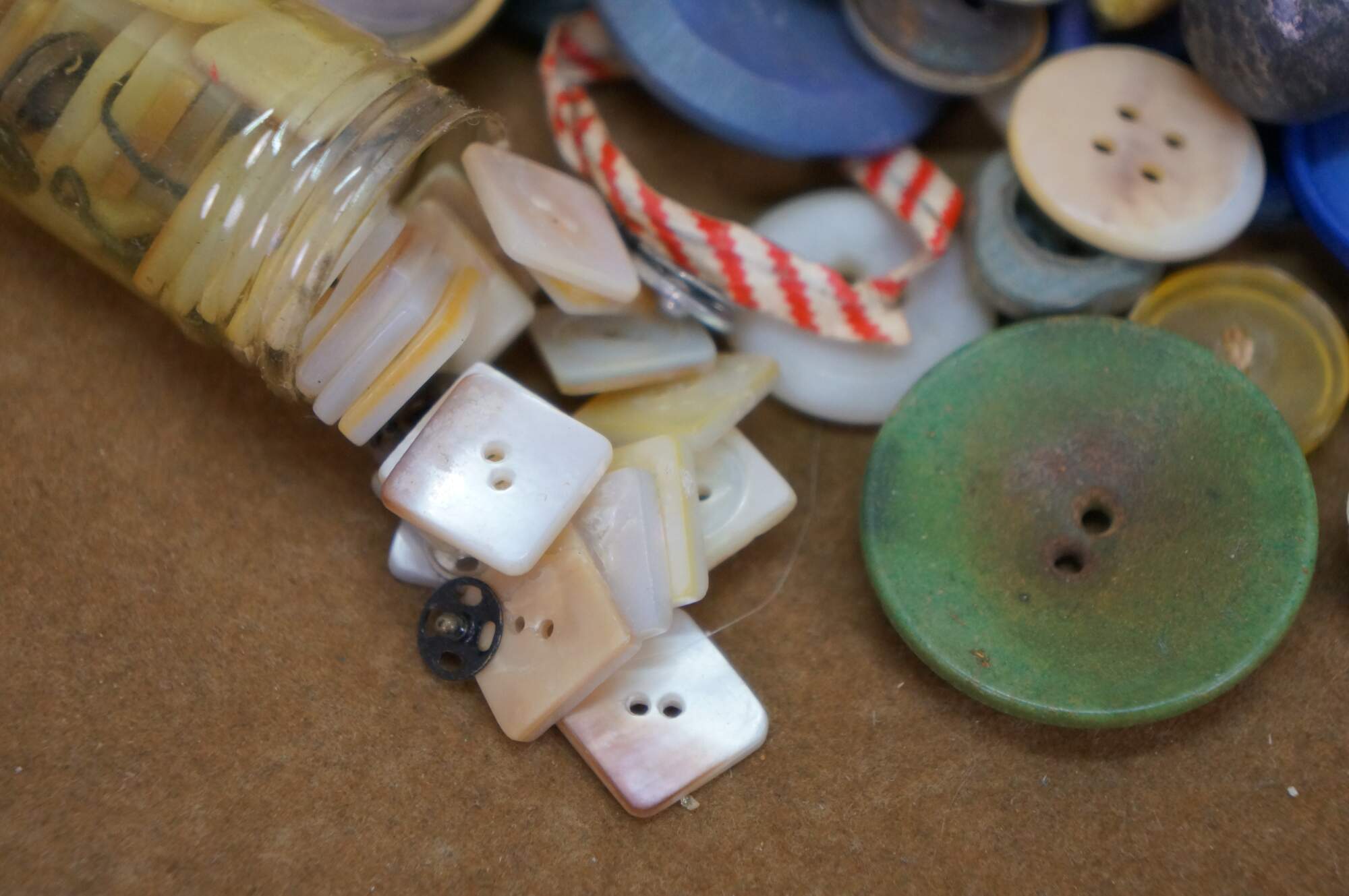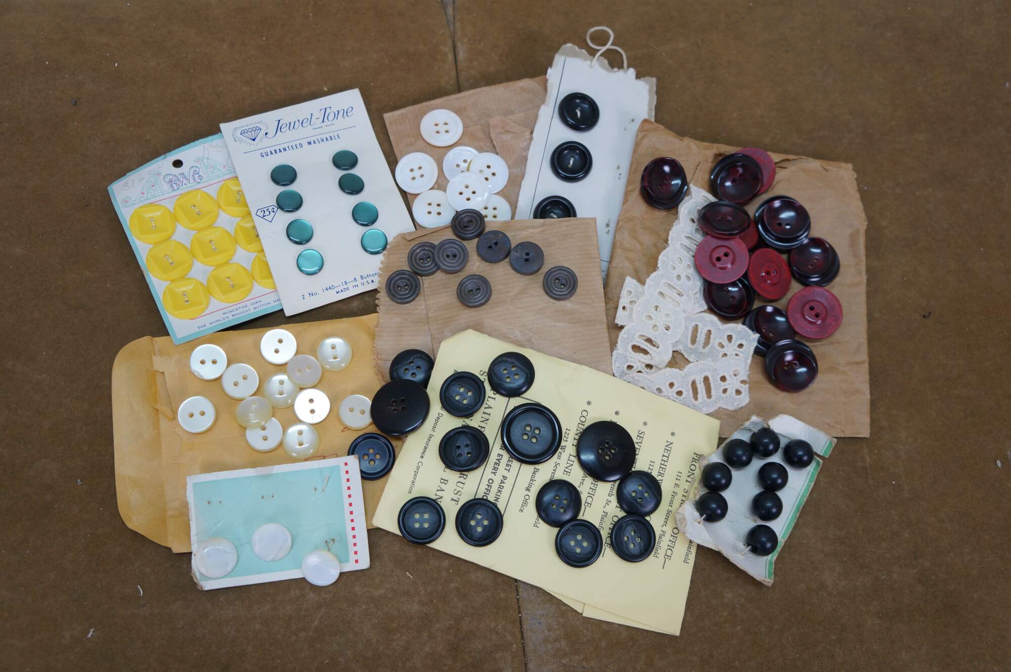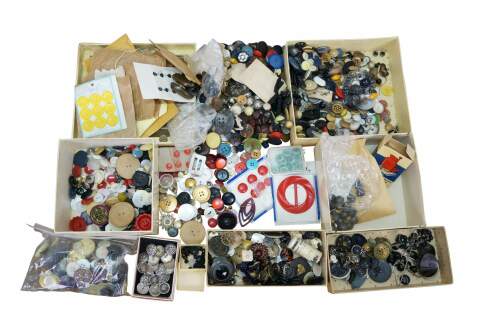 Antique and vintage button lot consisting of a large, assorted collection spanning various materials, sizes, and colors. Materials include a diverse mix including celluloid, bakelite, Lucite, glass, metal, and mop (mother-of-pearl).