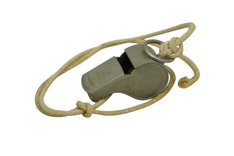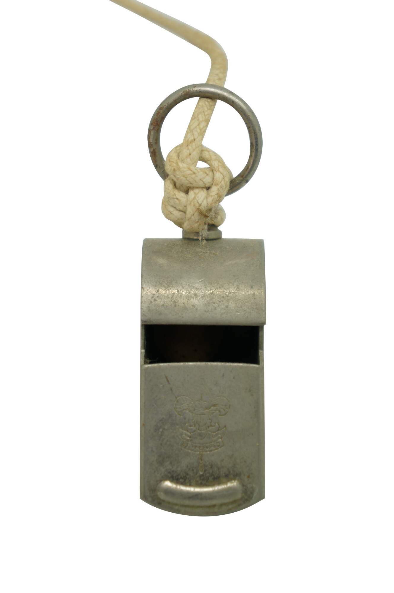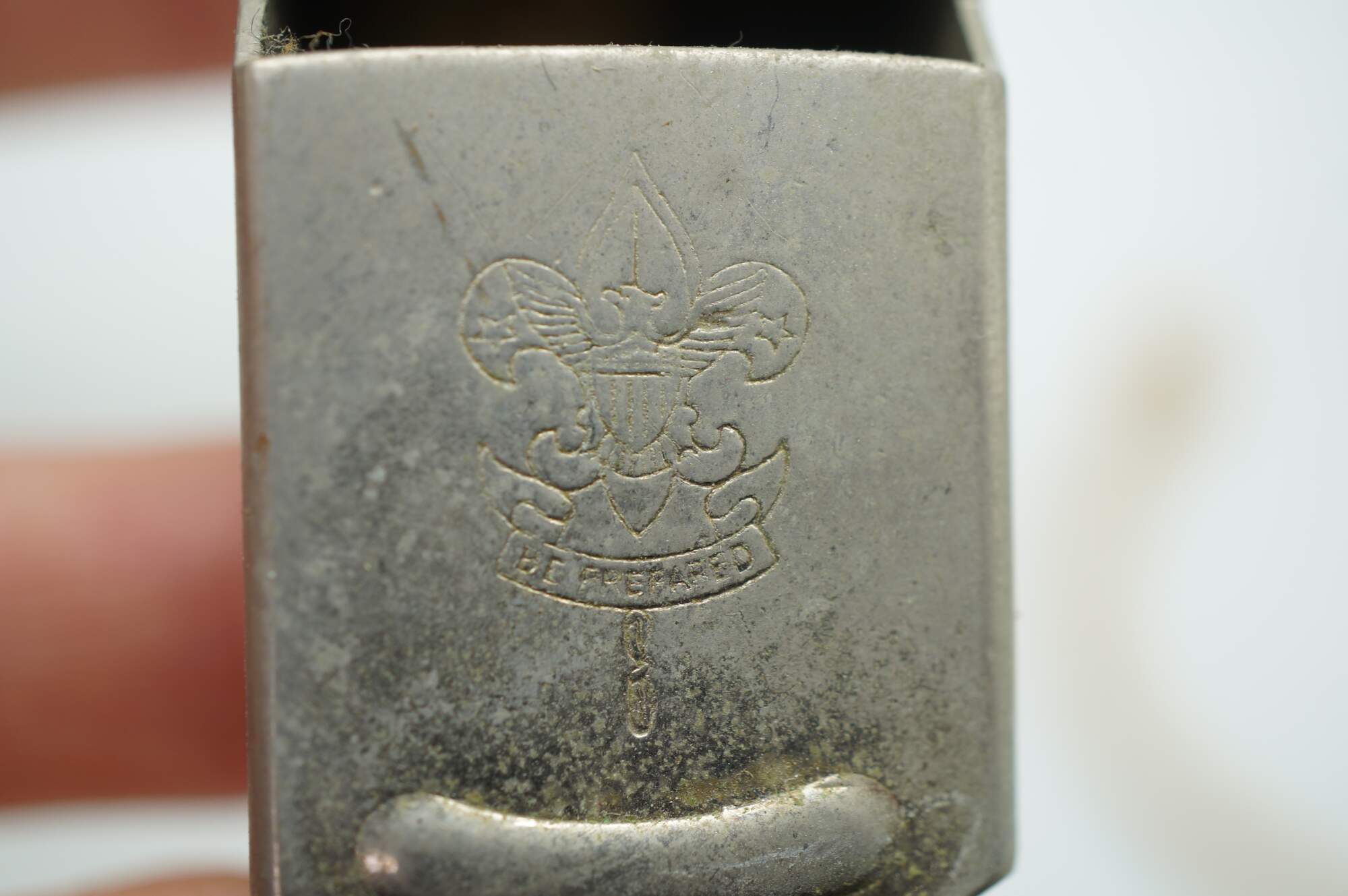 Vintage Boy Scouts of America whistle featuring the scouting fleur-de-lis emblem and the "Be Prepared" motto.