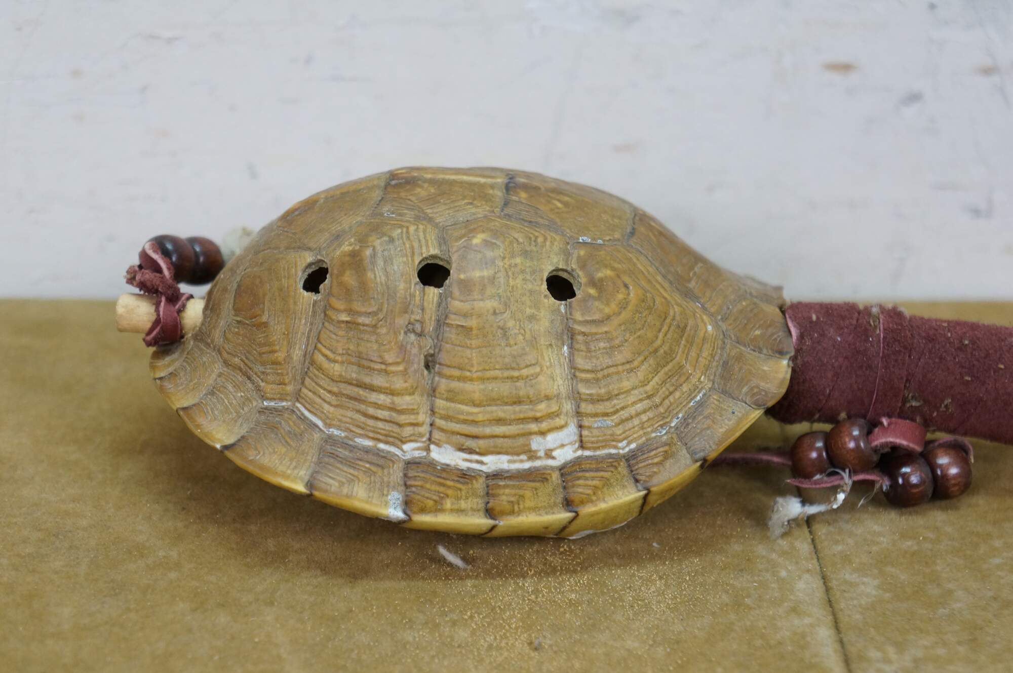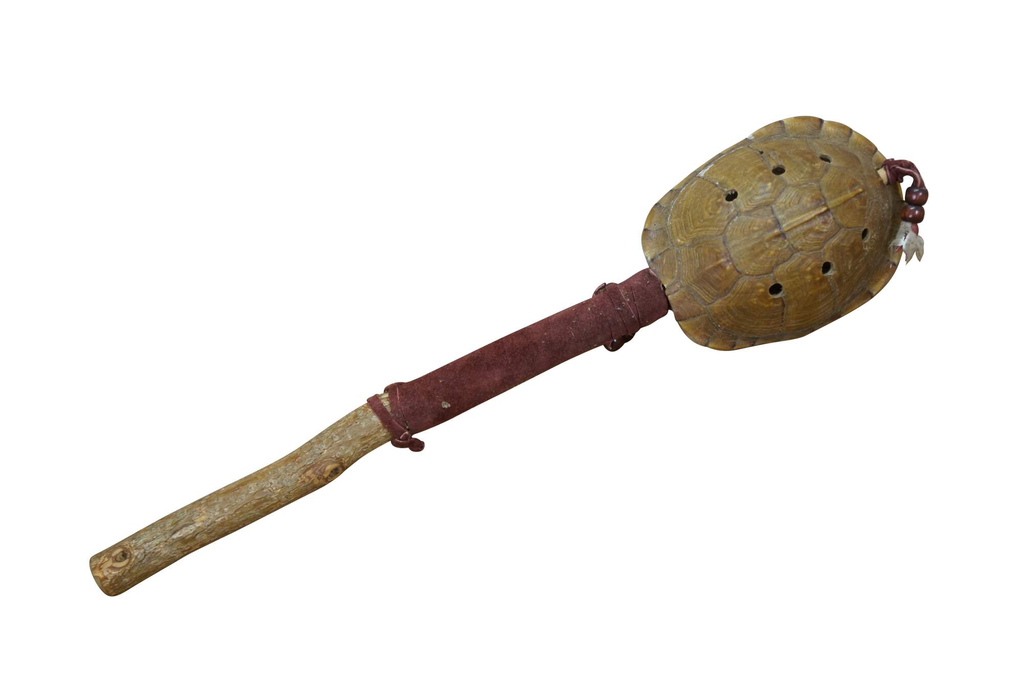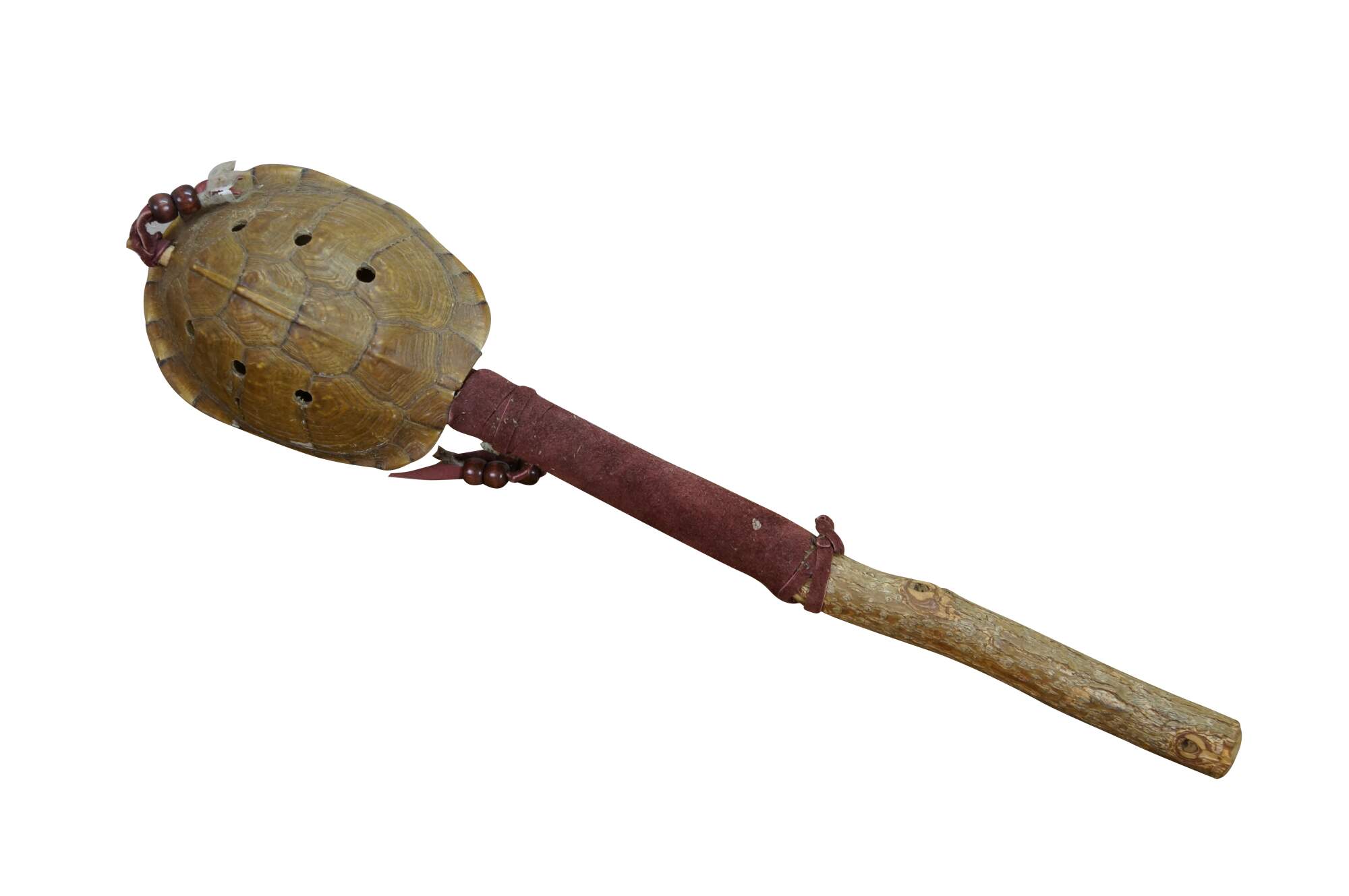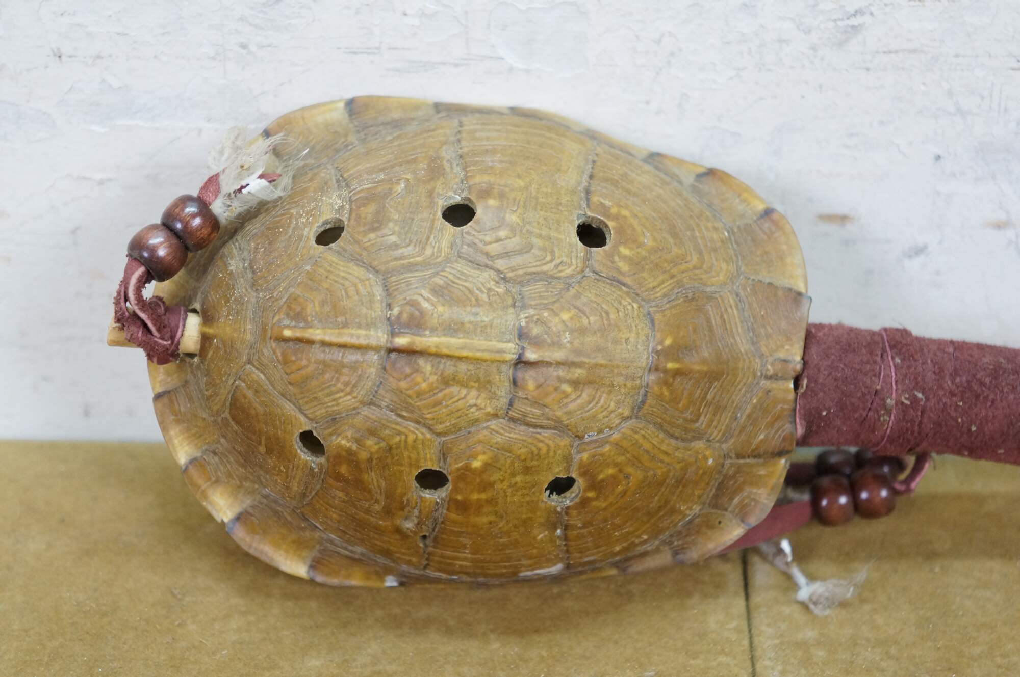 Vintage Native American ceremonial rattle / shaker fashioned out of the shell of a box turtle on a wooden stick, accented with a red wrap and beads.