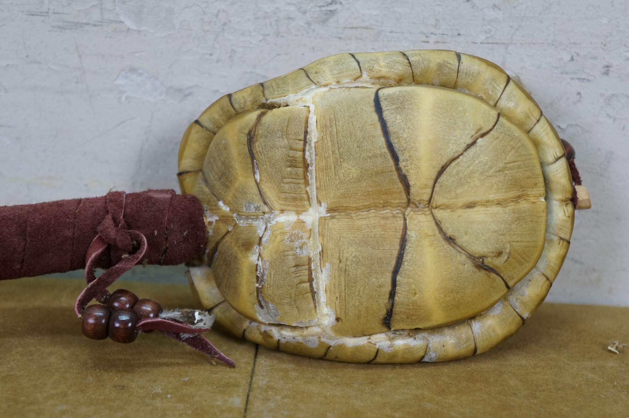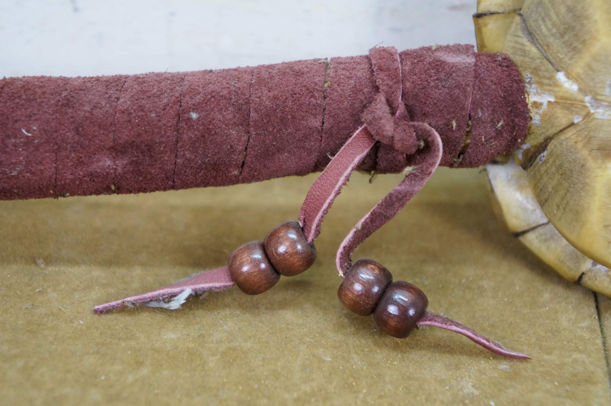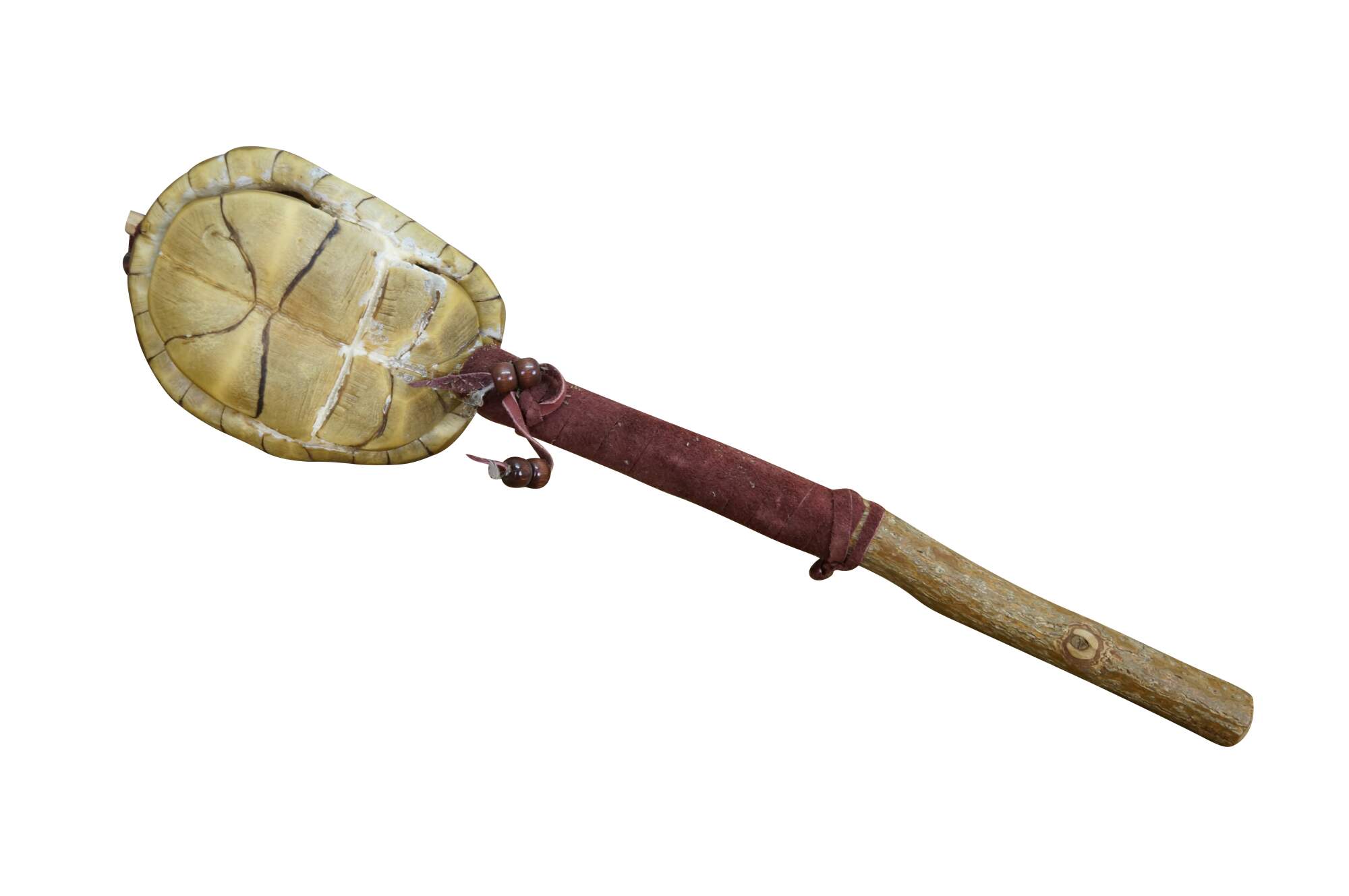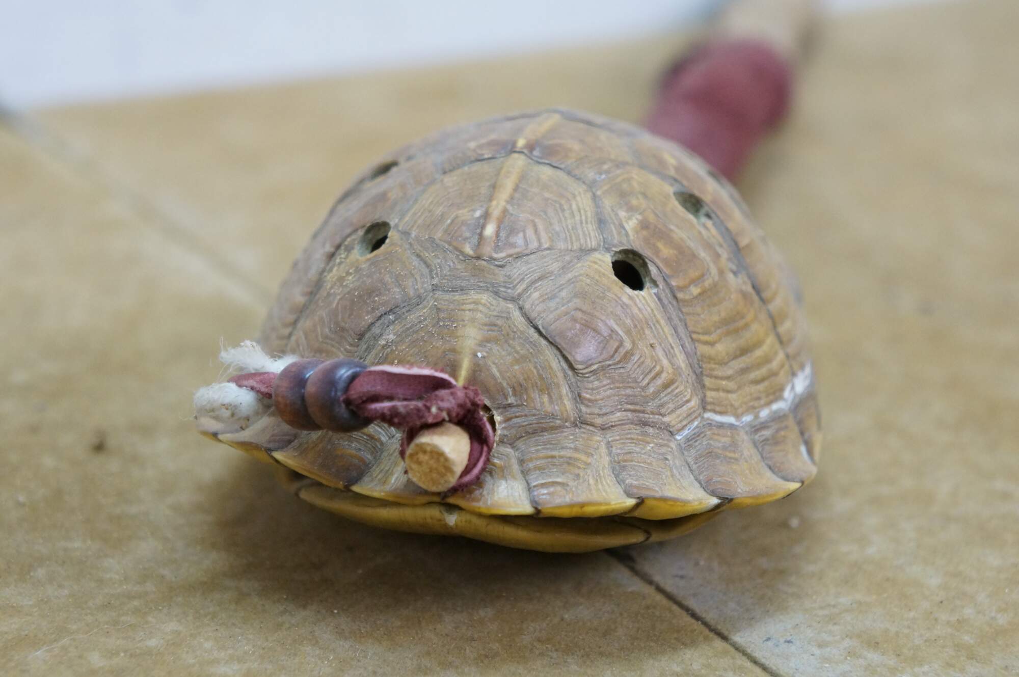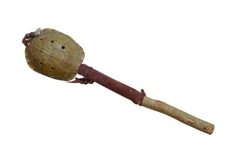 Vintage Native American ceremonial rattle / shaker fashioned out of the shell of a box turtle on a wooden stick, accented with a red wrap and beads.