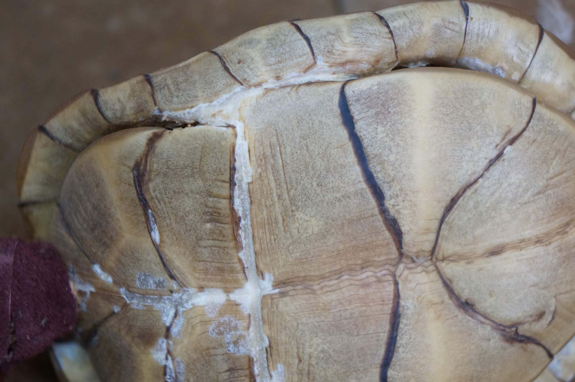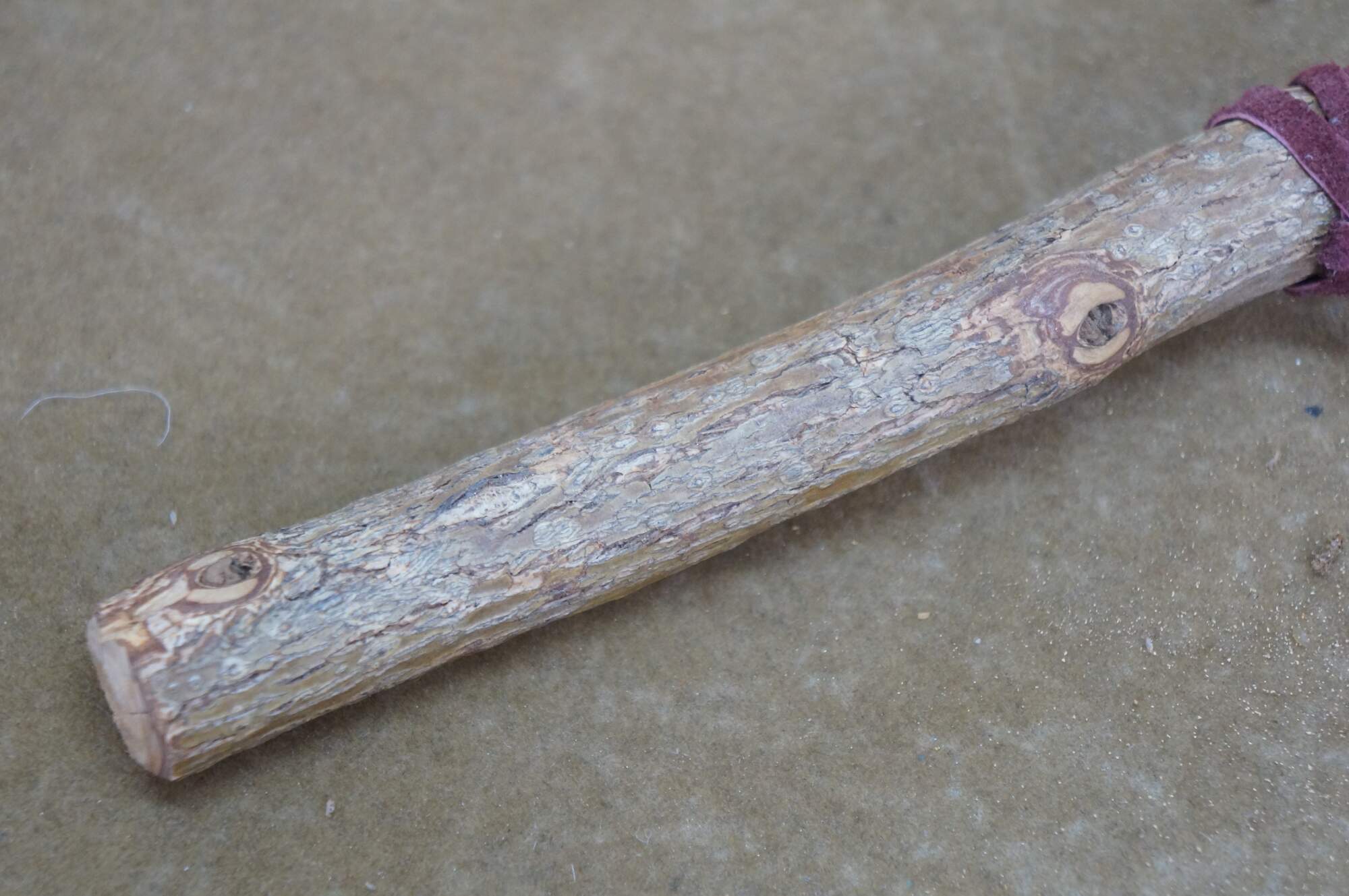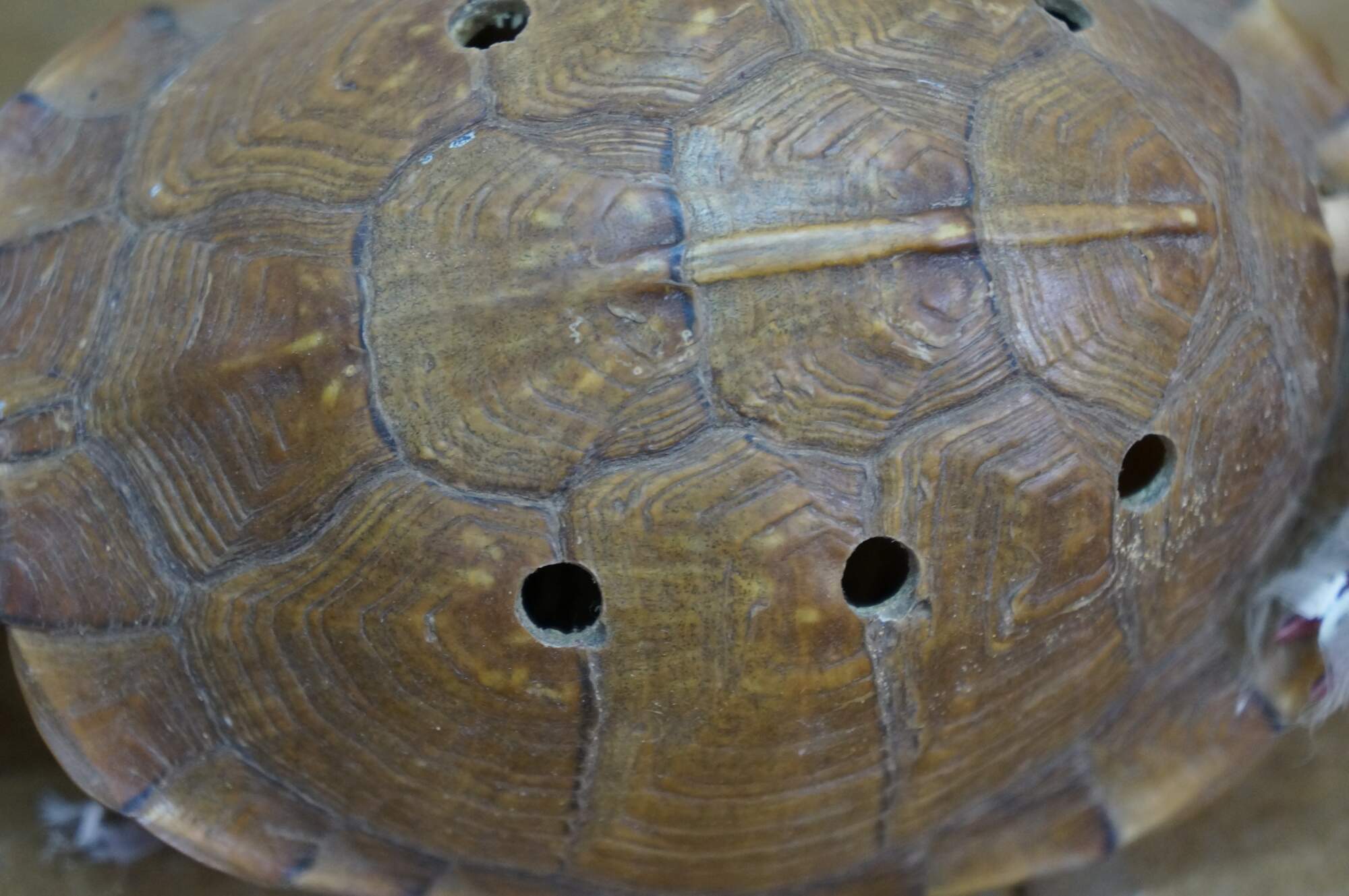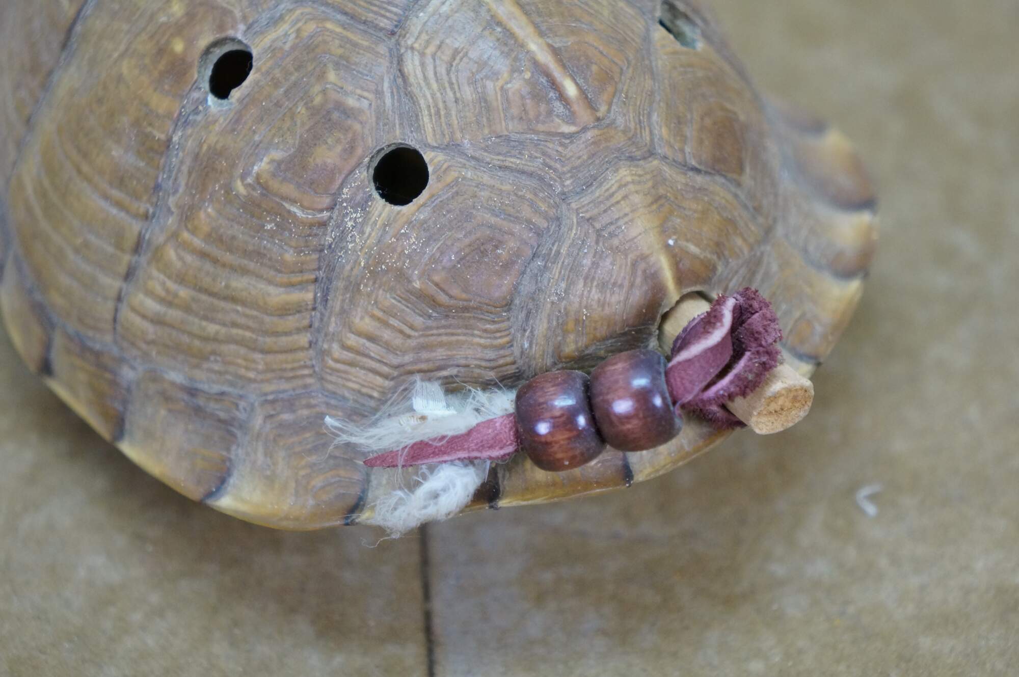 Vintage Native American ceremonial rattle / shaker fashioned out of the shell of a box turtle on a wooden stick, accented with a red wrap and beads.