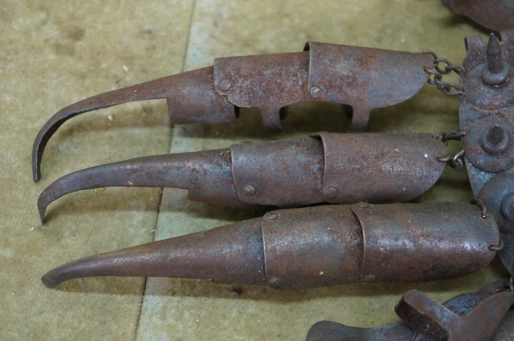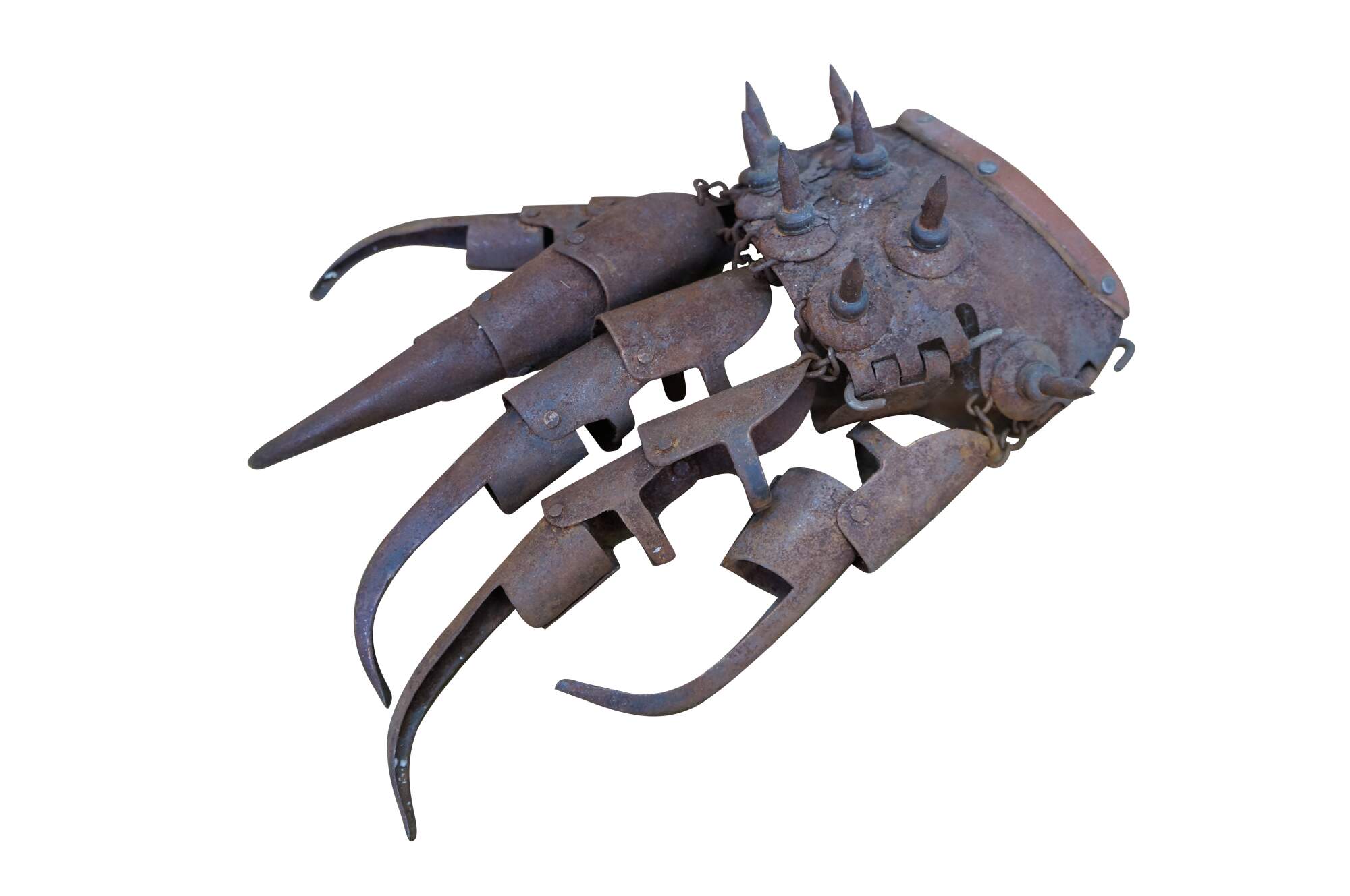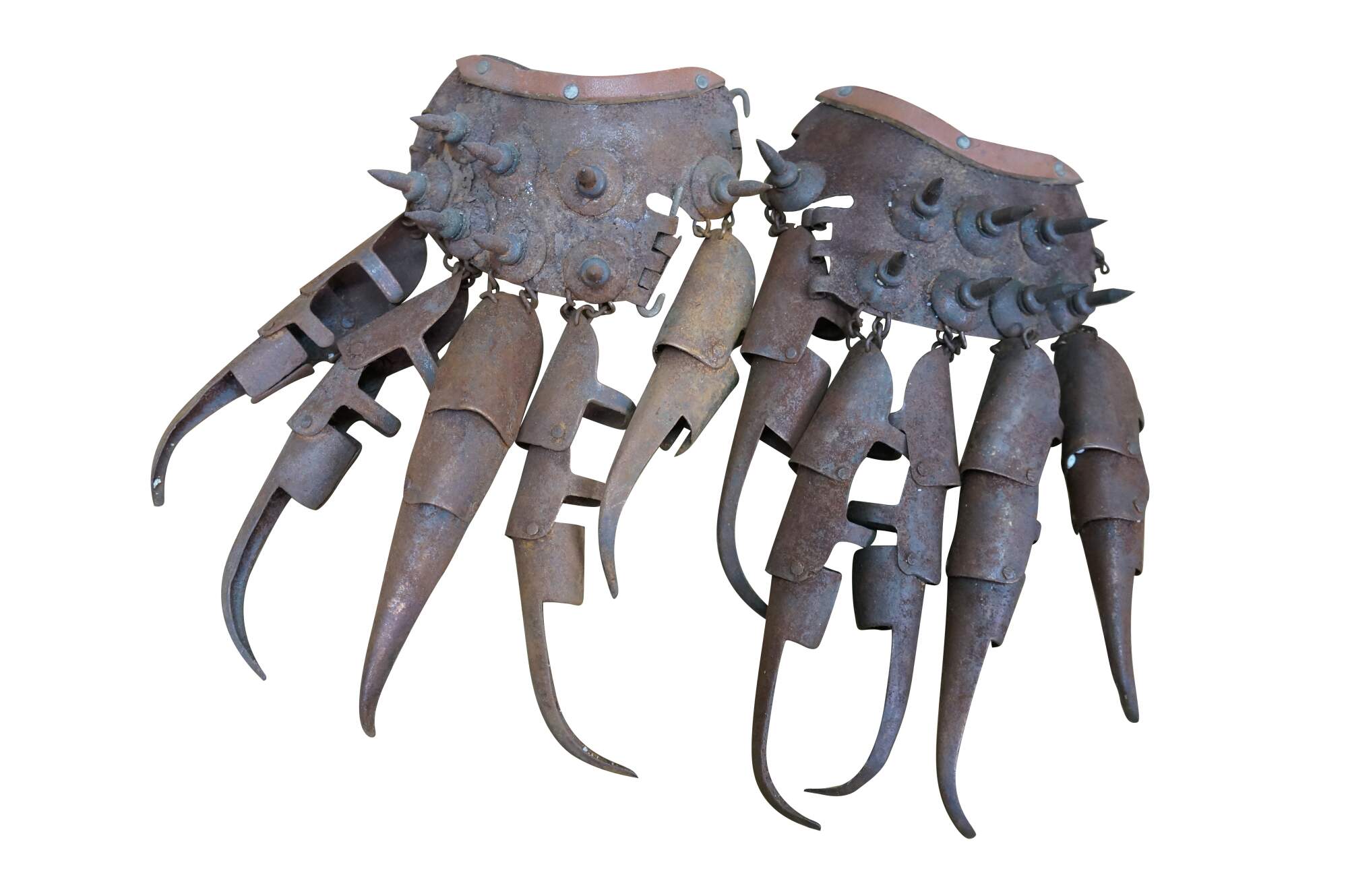 Antique pair of chinese Tiger Claw or Hawk Combat Gloves. Features a metal articulated frame with spiked wrist plates. Figers connected via chain.