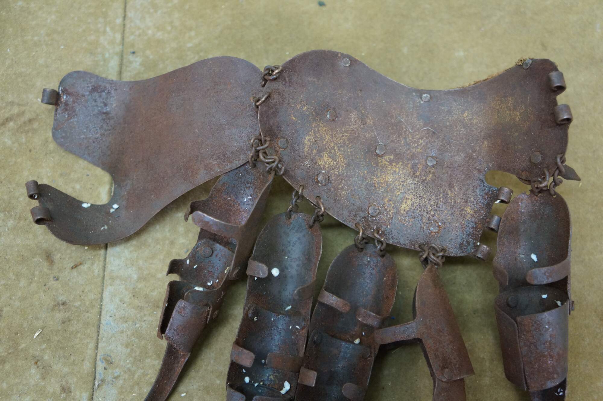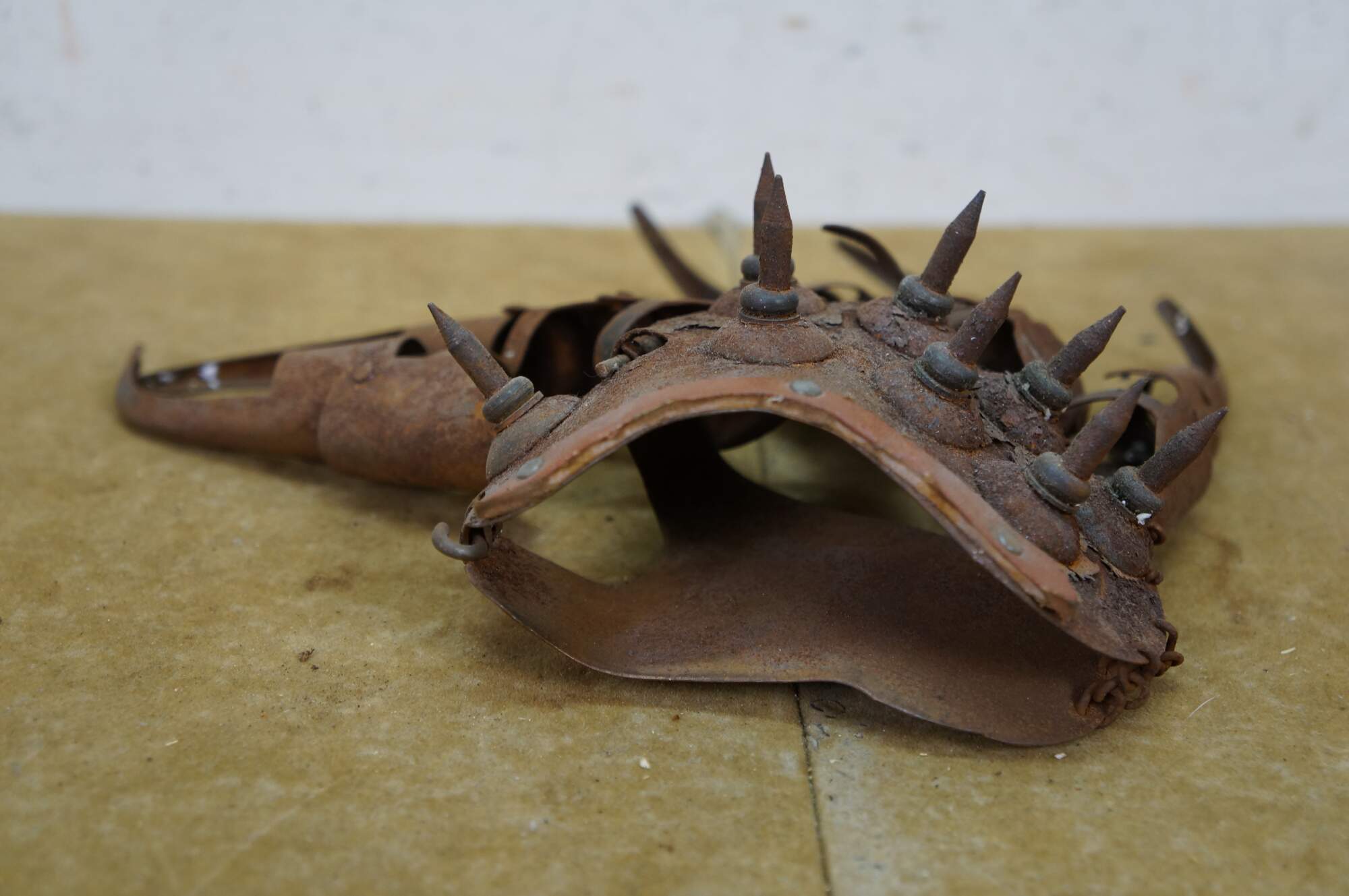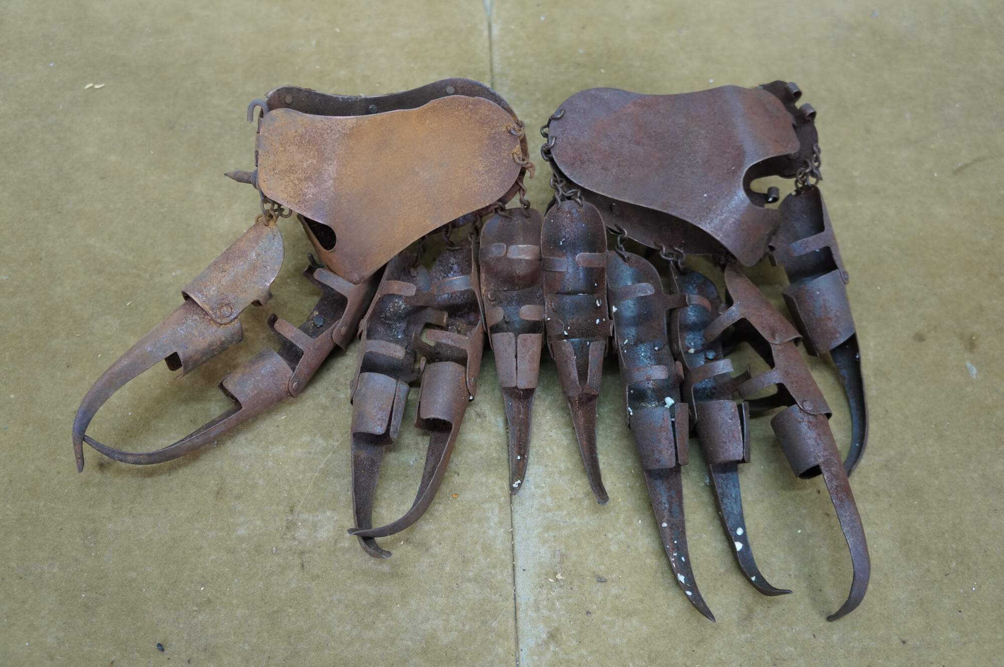 Antique pair of chinese Tiger Claw or Hawk Combat Gloves. Features a metal articulated frame with spiked wrist plates. Figers connected via chain.