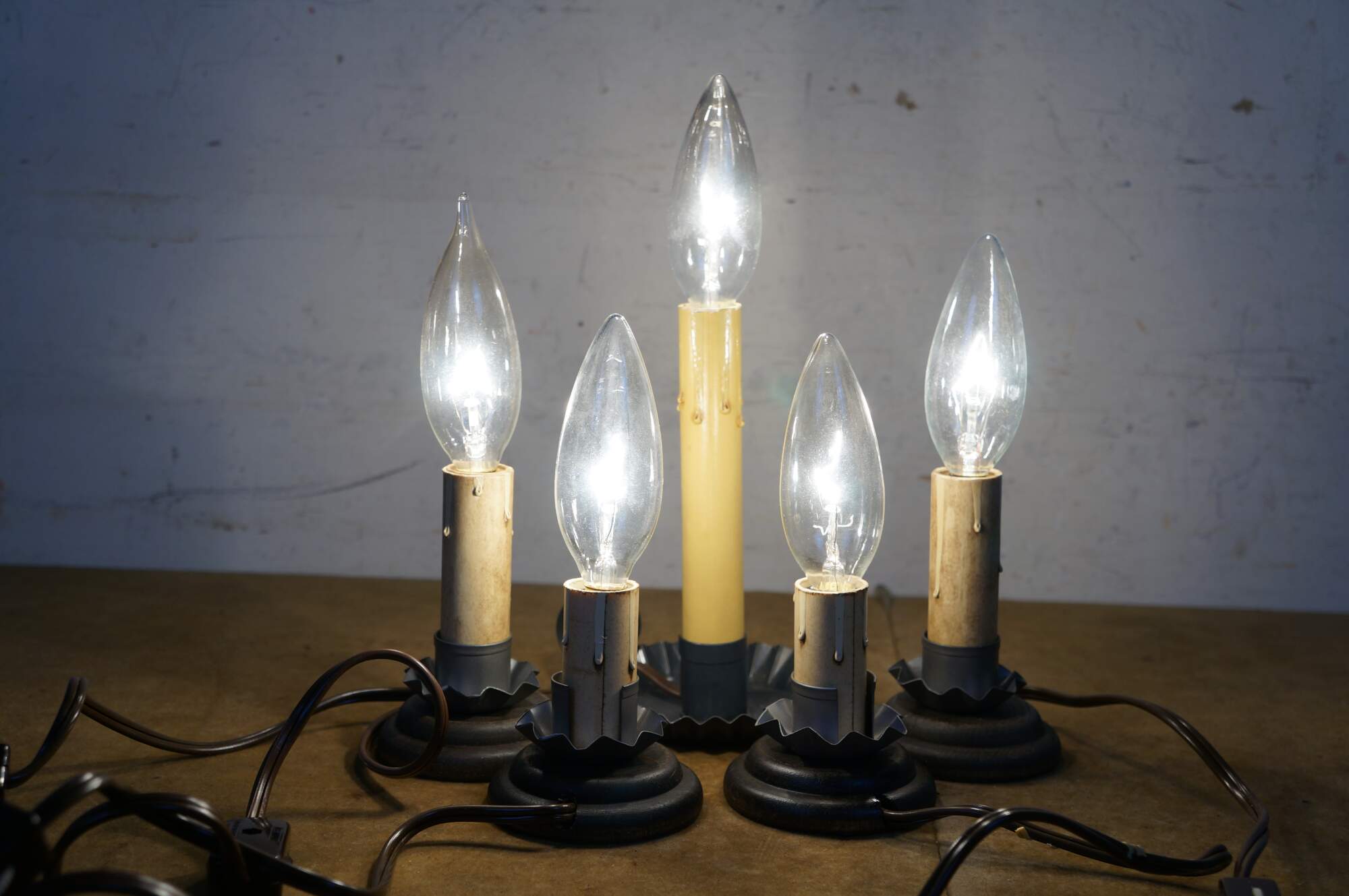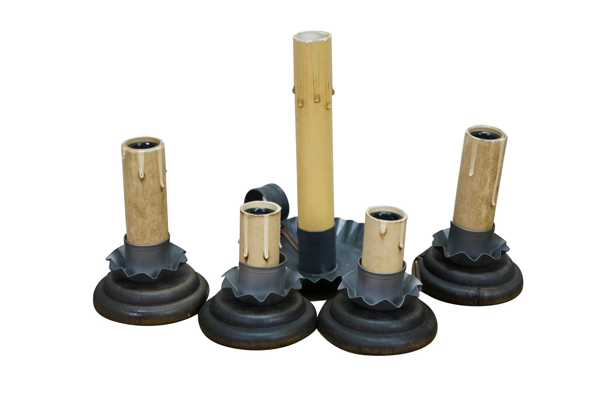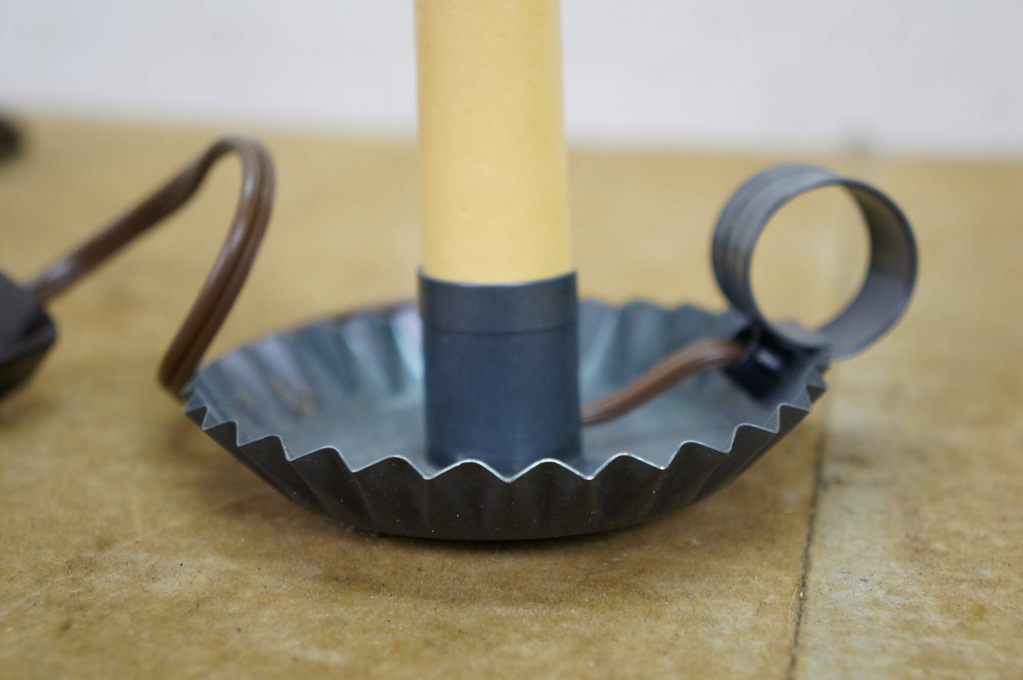 5 early american style crimped tin electric candlestick lamps. Features a candlestick drick covers.