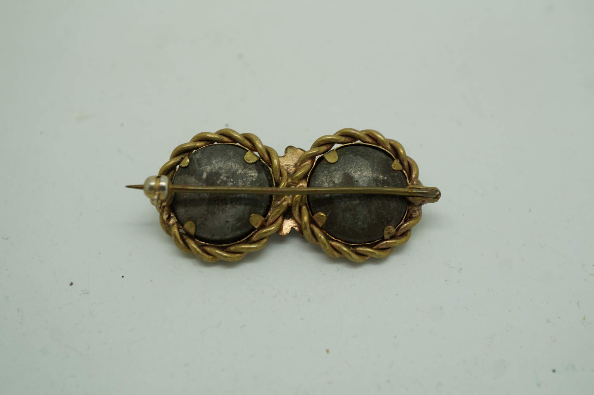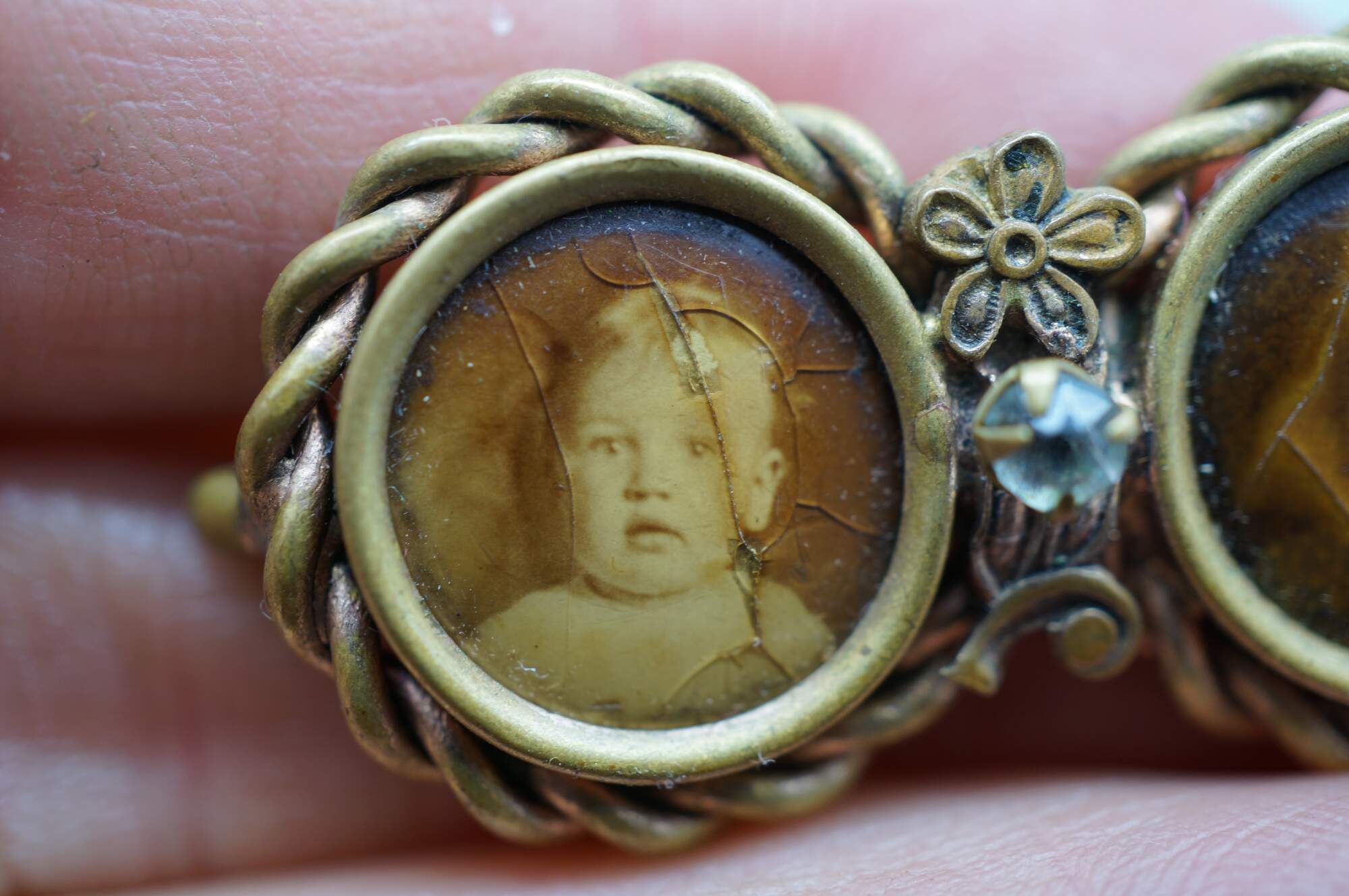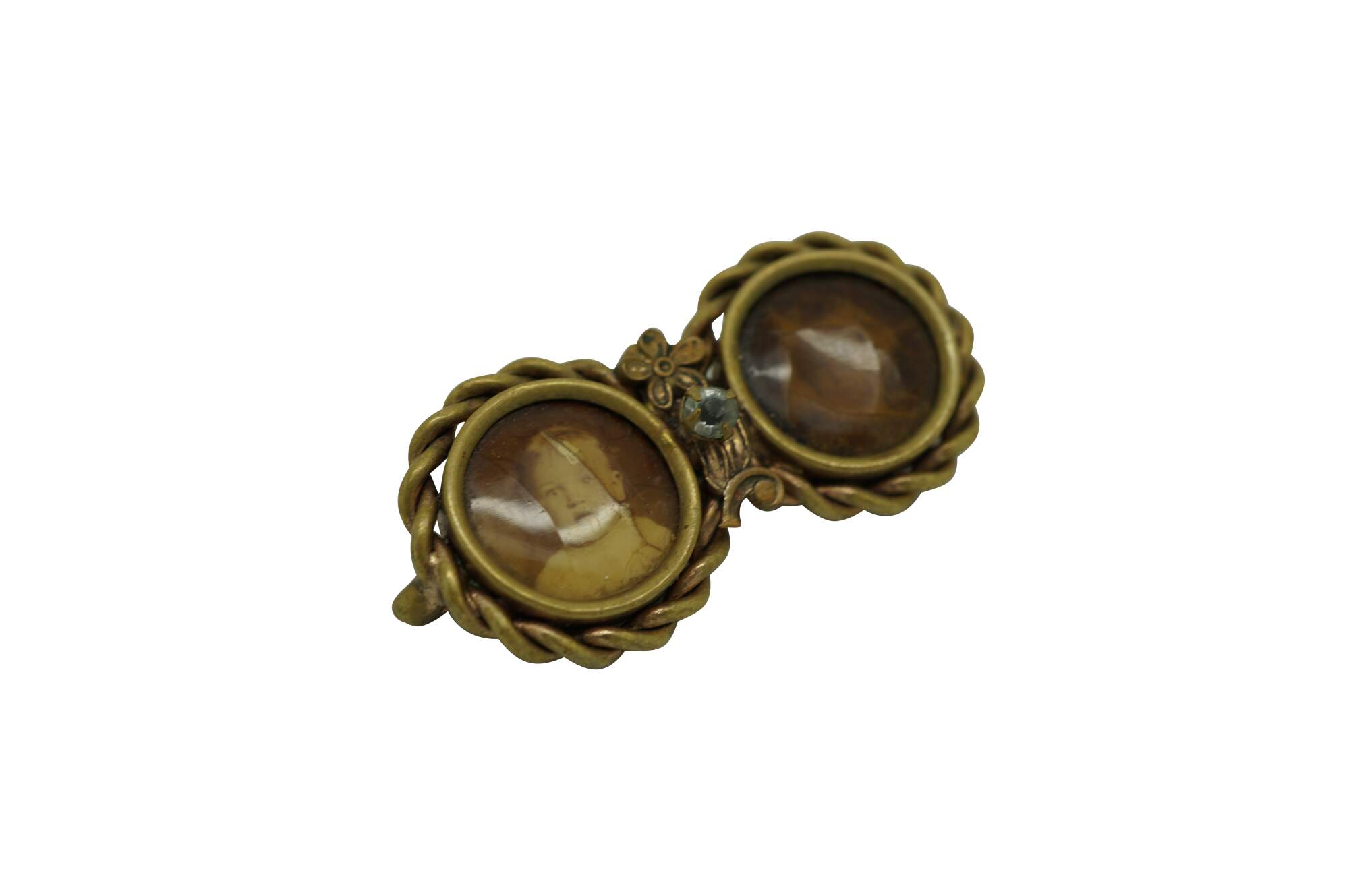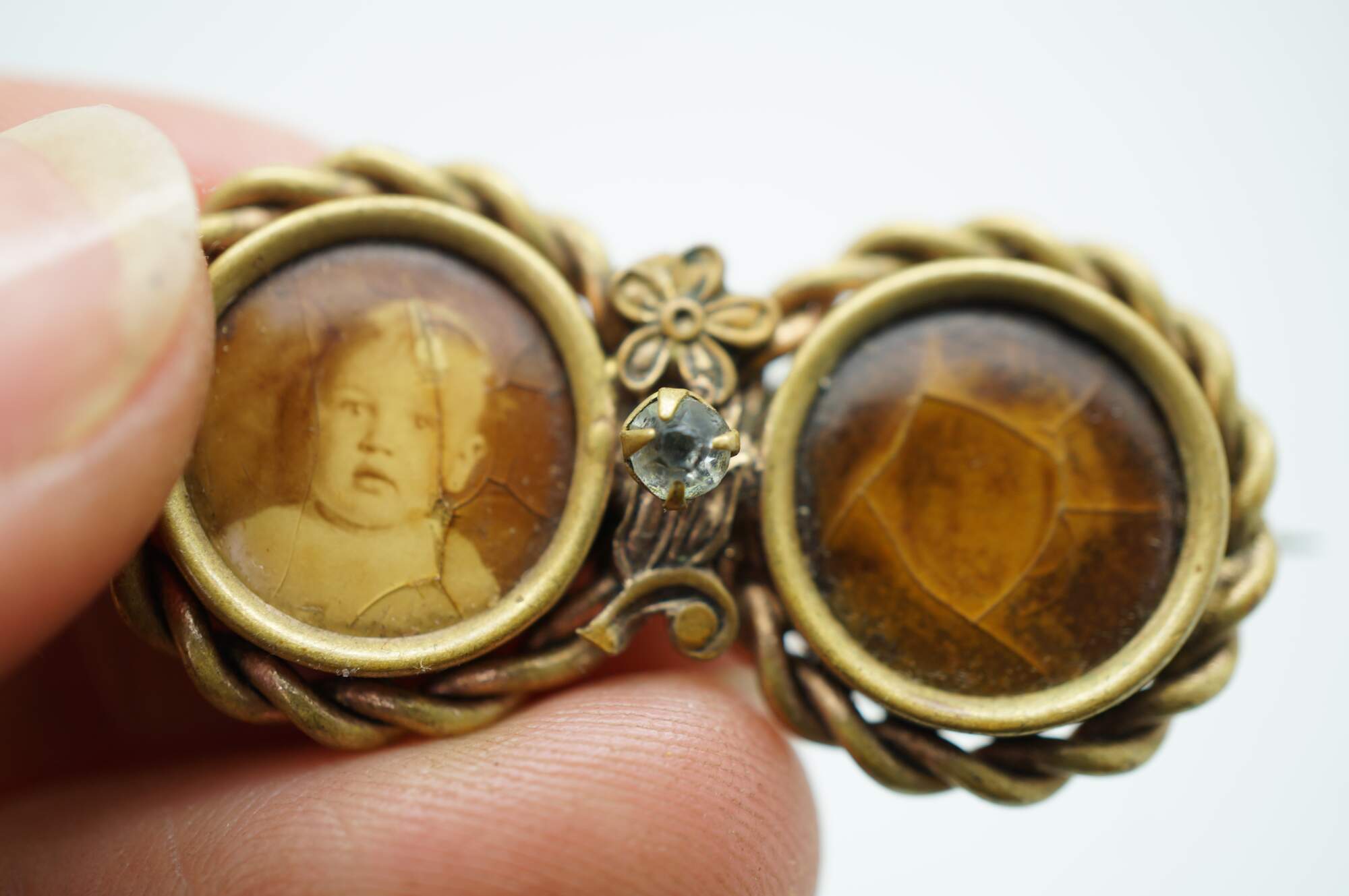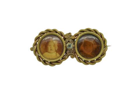 Late Victorian Mourning Brooch. Features a double-circular design, often known as a "double-portrait" or "inseparable" brooch. One side contains a sepia-toned photograph of a child. The other side had a photo of a female child which is heavilt faded.