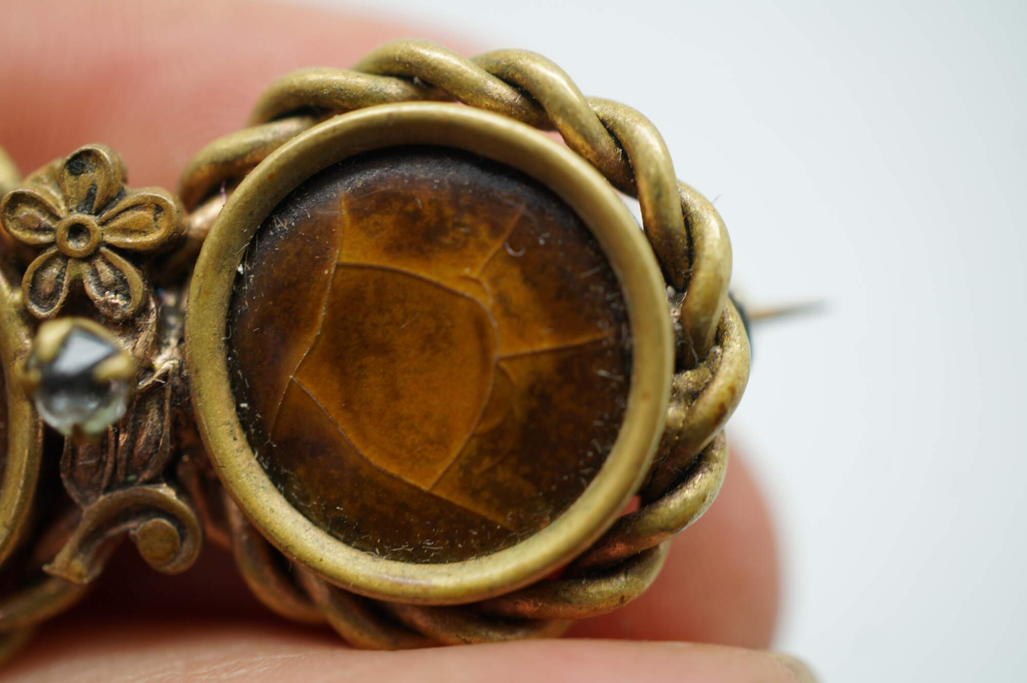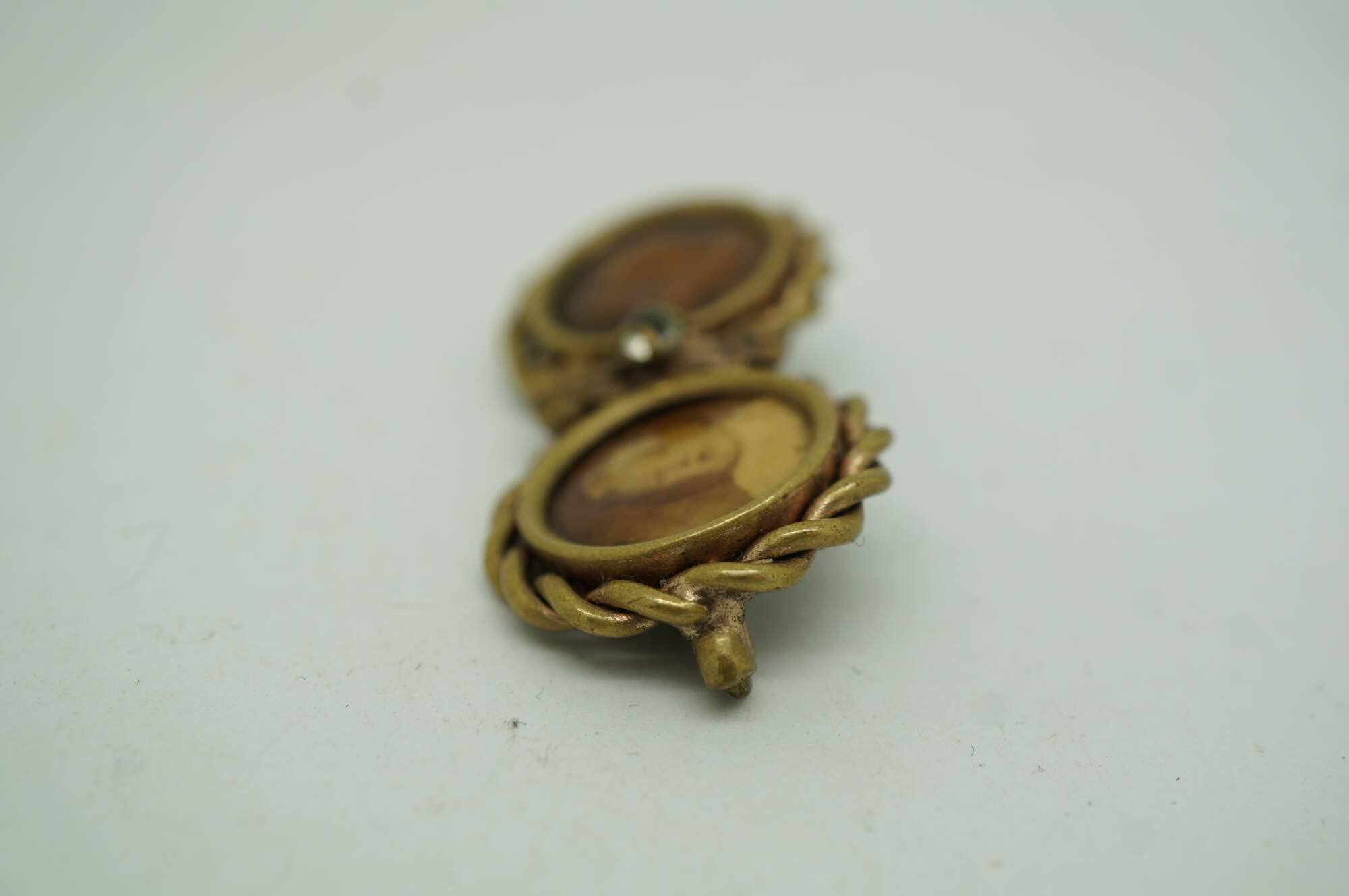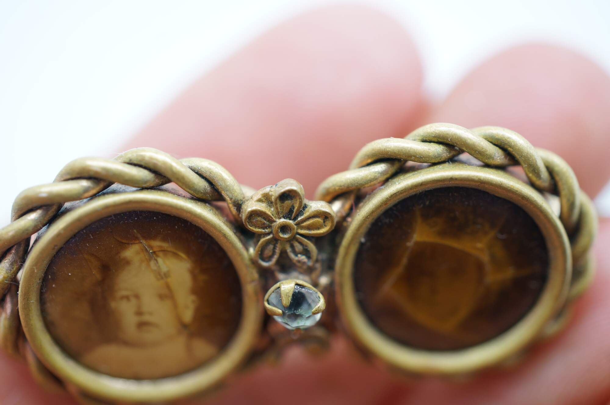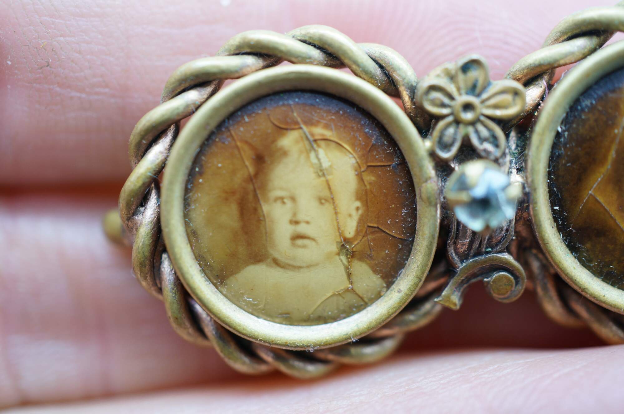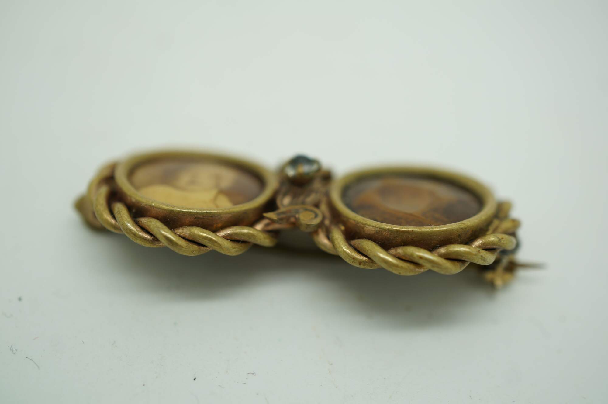 Late Victorian Mourning Brooch. Features a double-circular design, often known as a "double-portrait" or "inseparable" brooch. One side contains a sepia-toned photograph of a child. The other side had a photo of a female child which is heavilt faded.