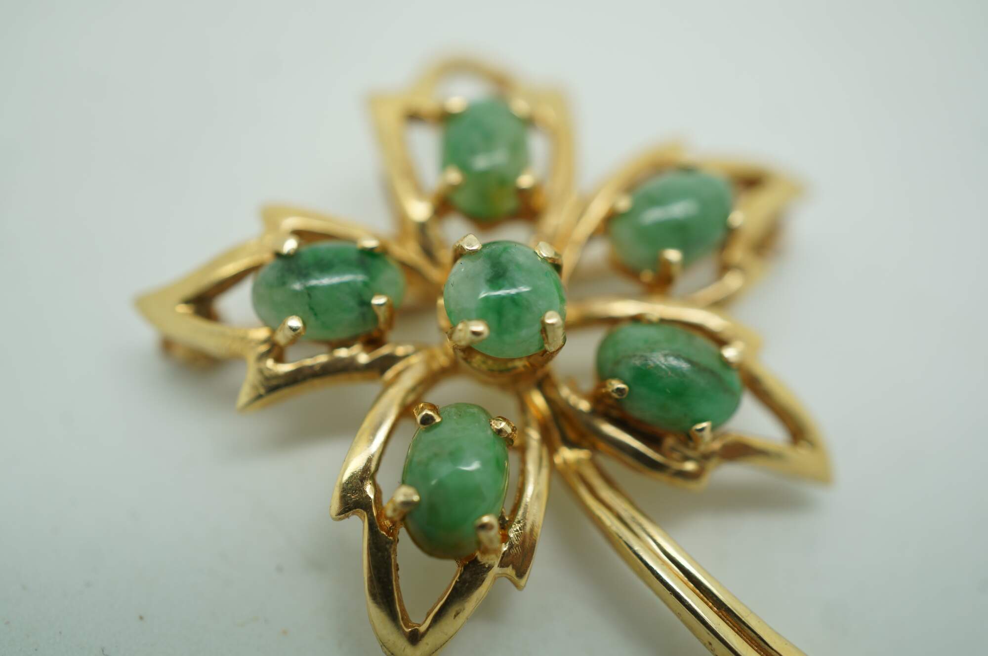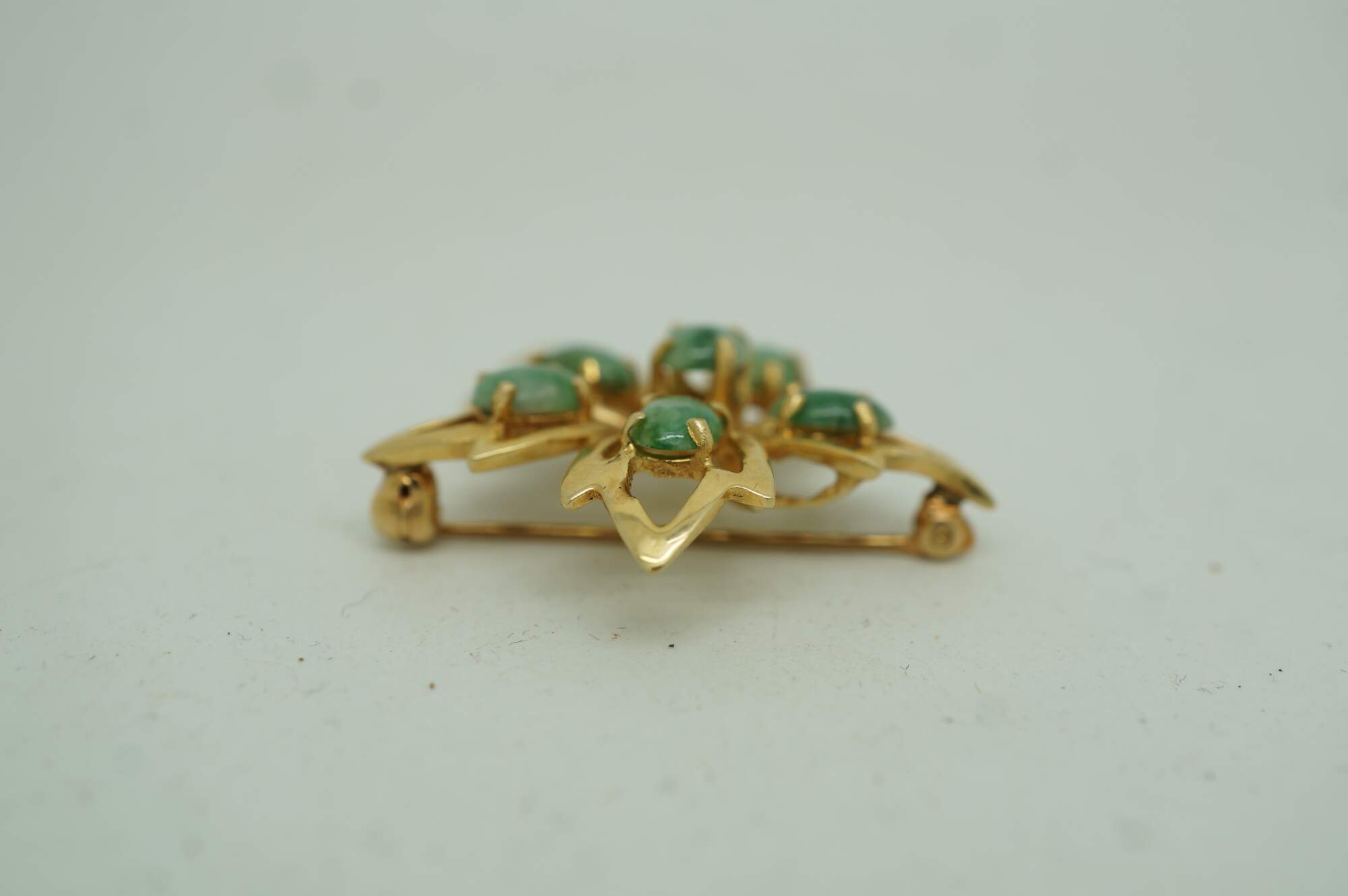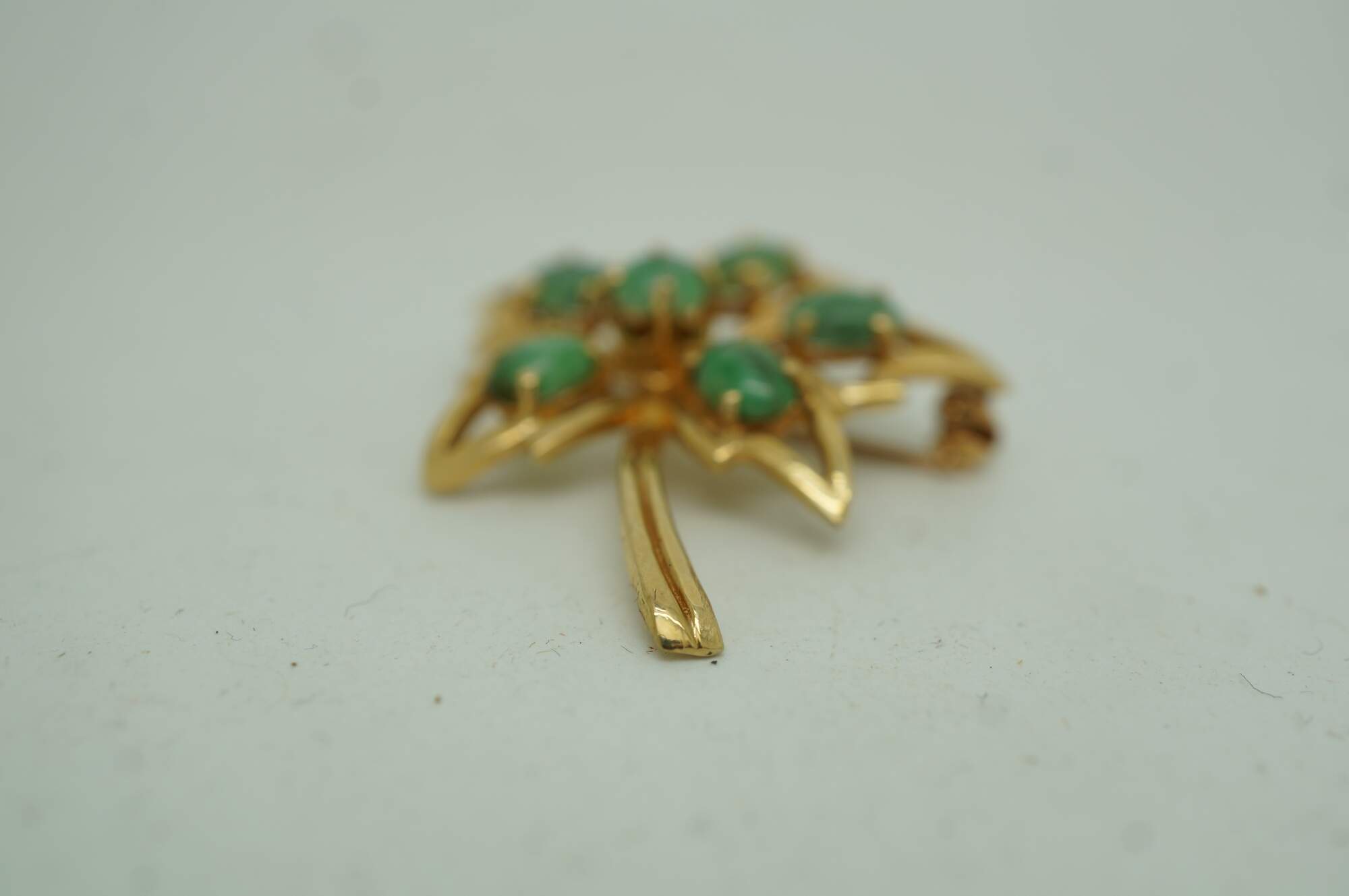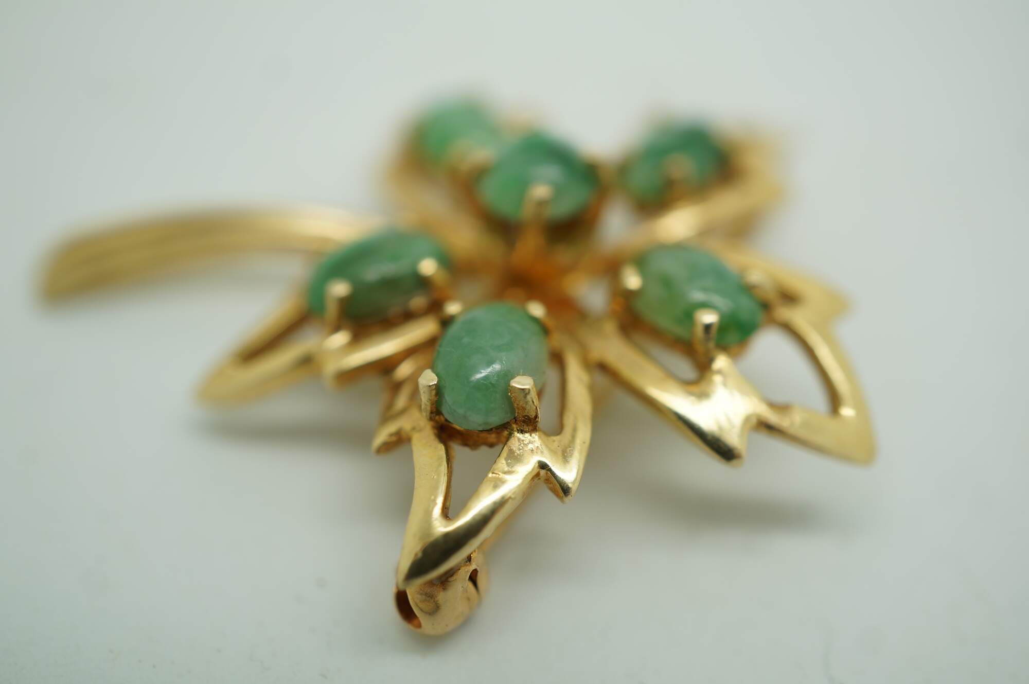14 Karat Gold Leaf Brooch featuring 5 oval jadeite stones. The brooch has a 5 petal leaf shape with each stone set in the middle of each petal. Hallmark along backside.