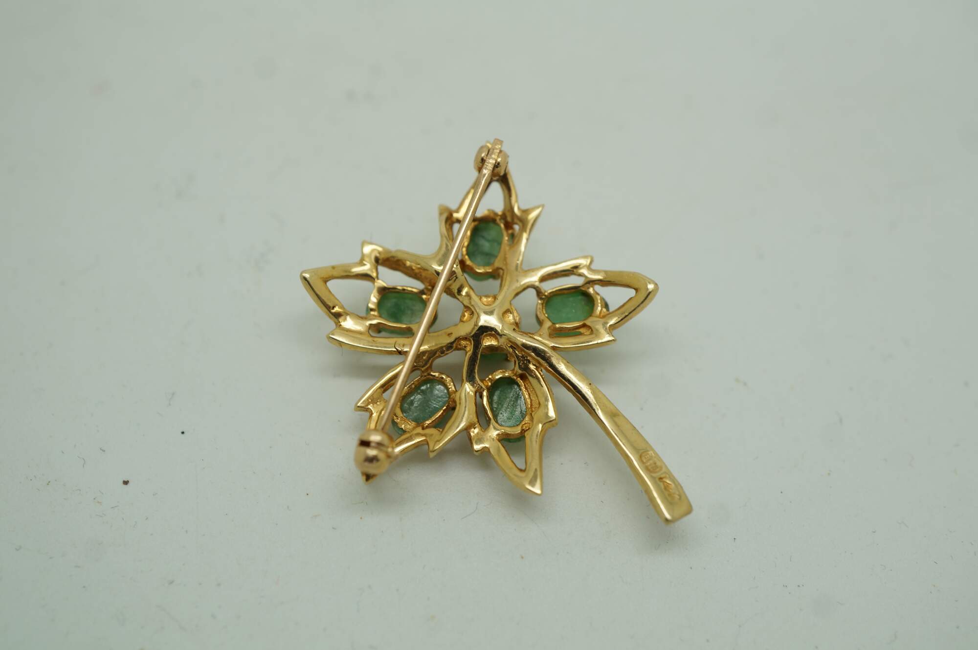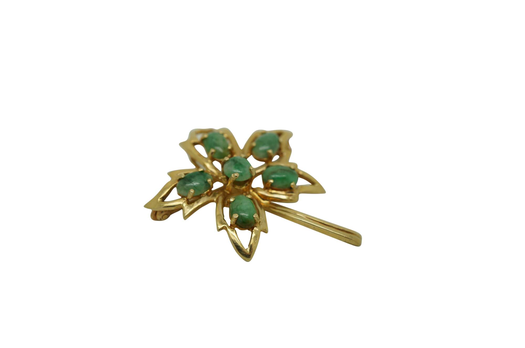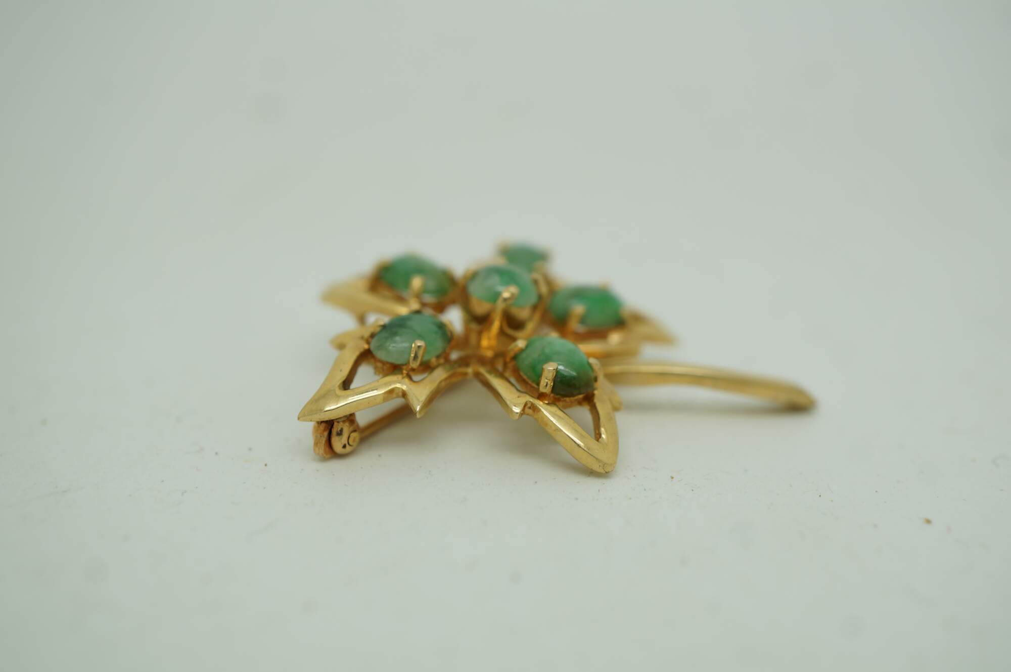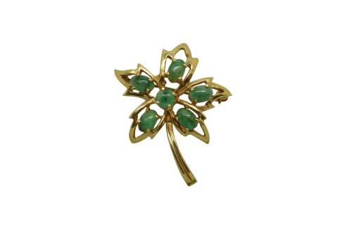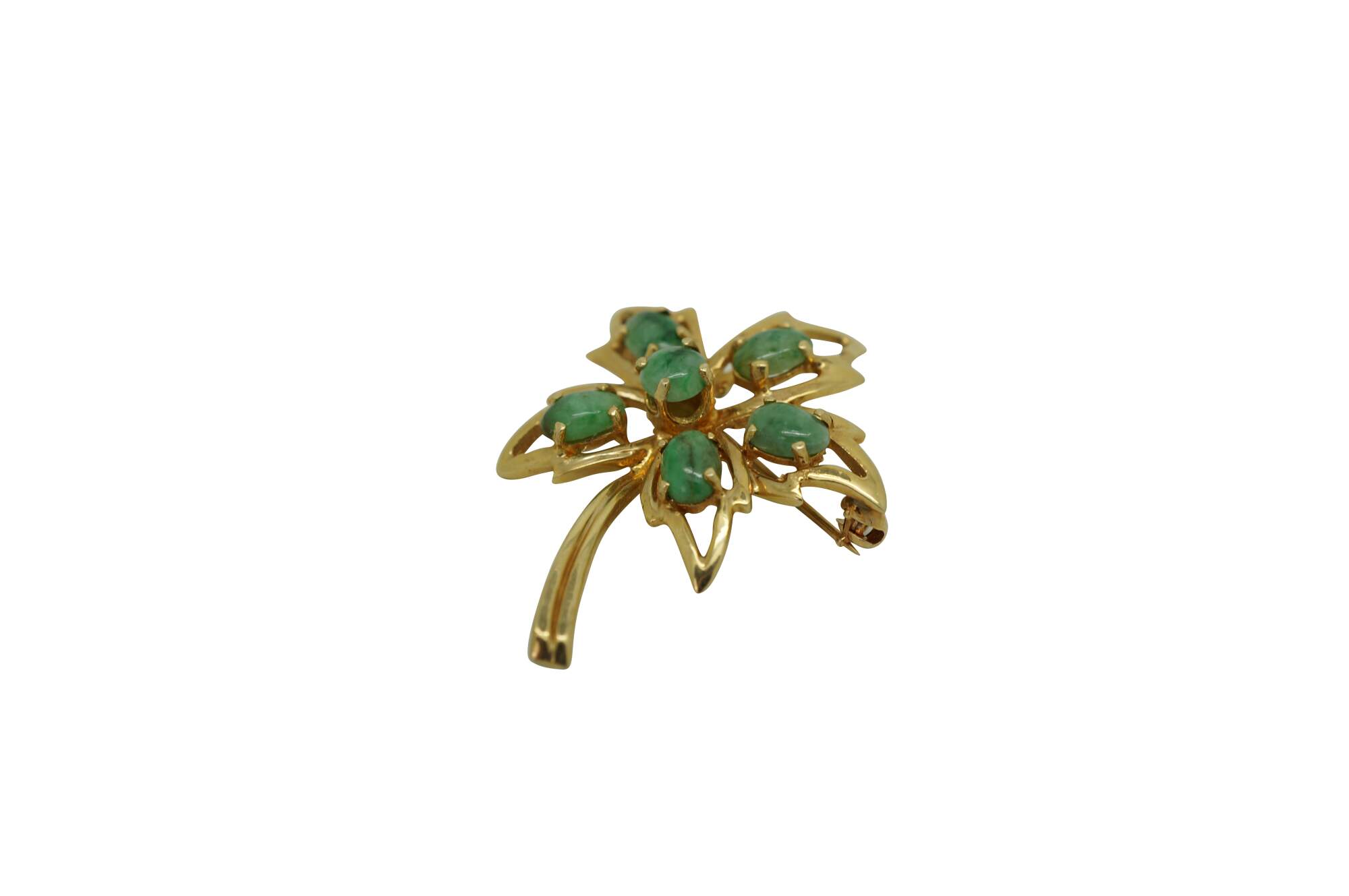 14 Karat Gold Leaf Brooch featuring 5 oval jadeite stones. The brooch has a 5 petal leaf shape with each stone set in the middle of each petal. Hallmark along backside.