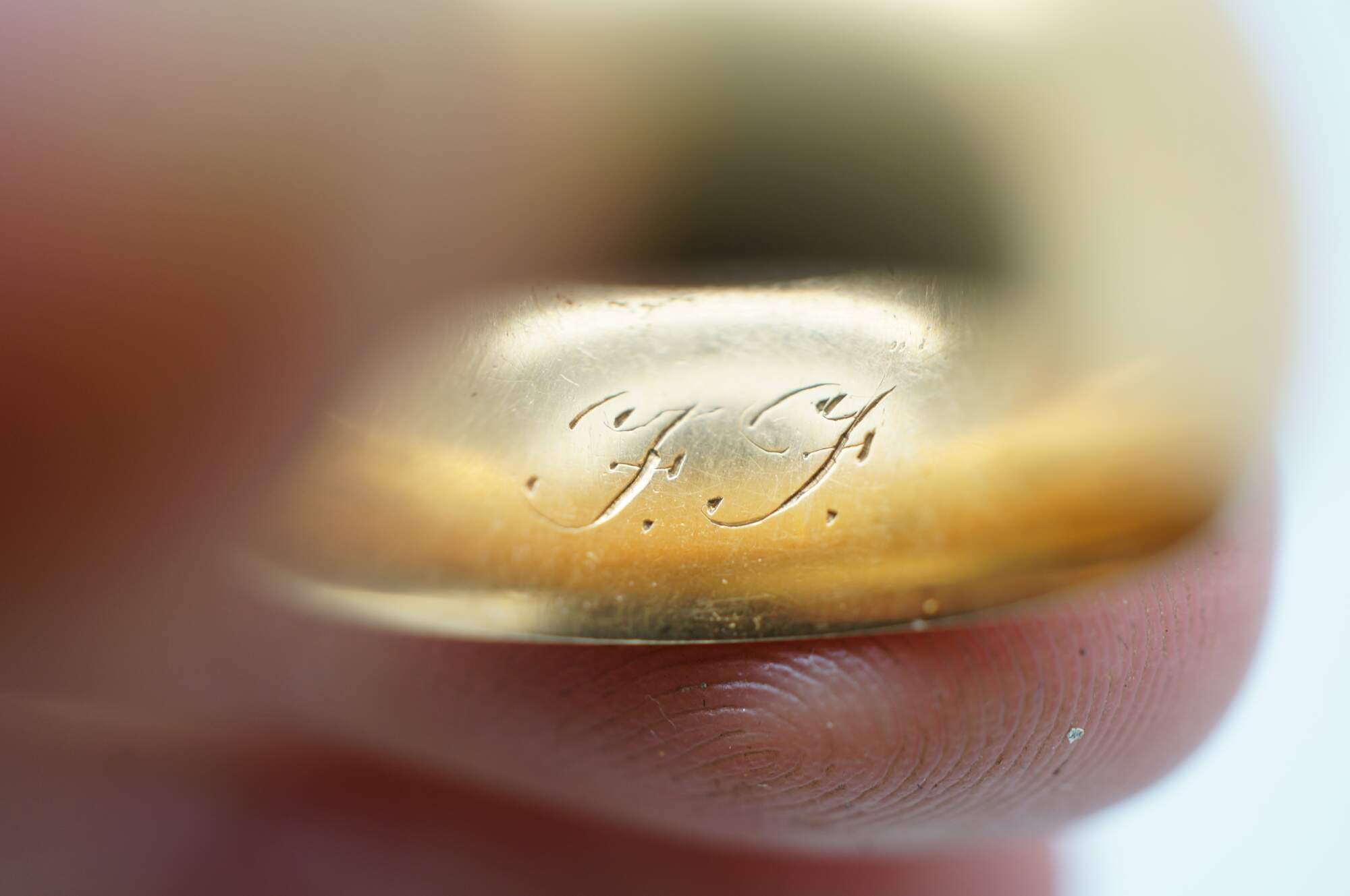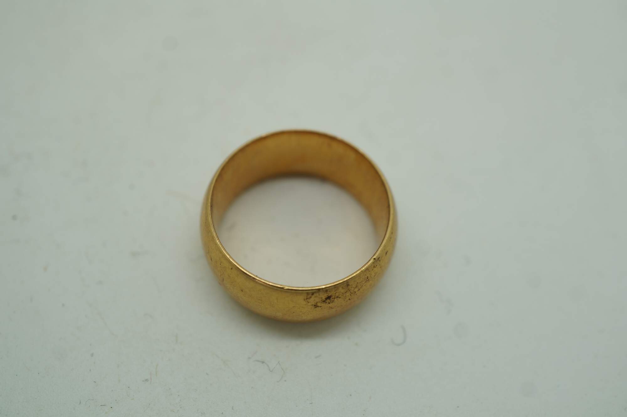 Vintage Art Deco Era Cigar Style Wedding Band. Features an FF monogram on the inside. Marked 18 along the inside with an anchor emblem.