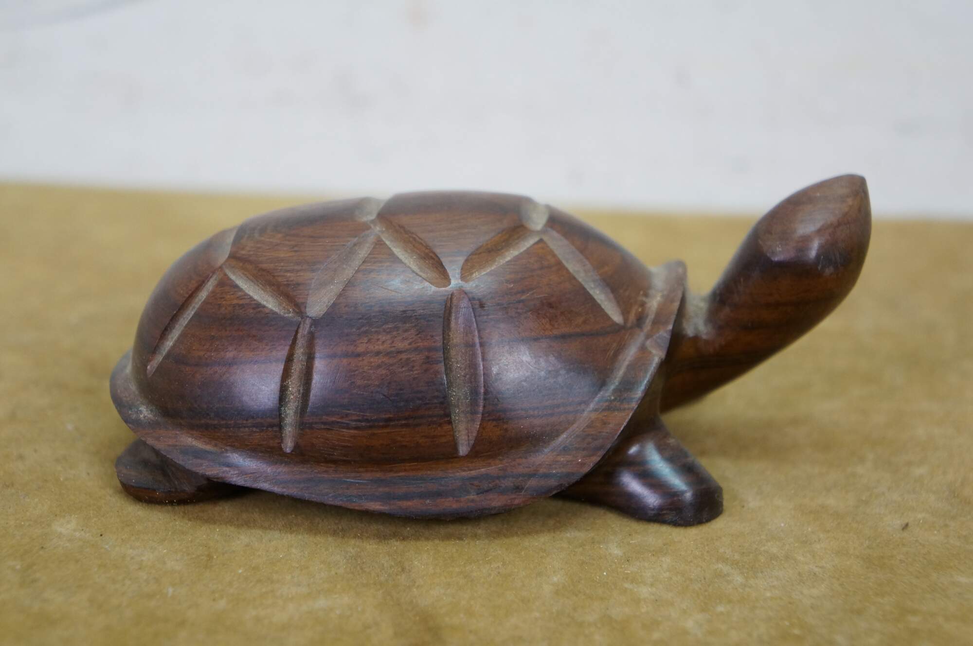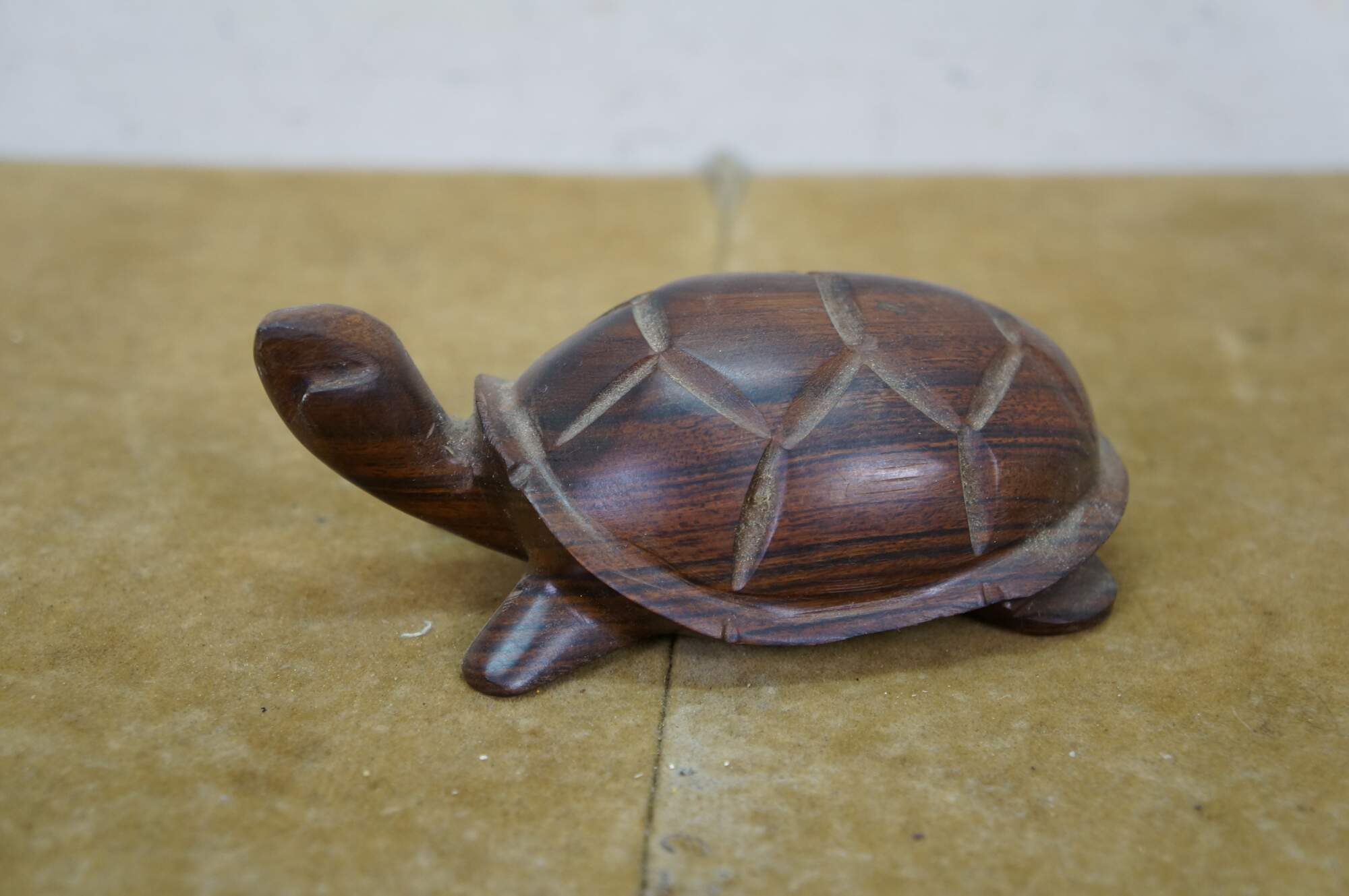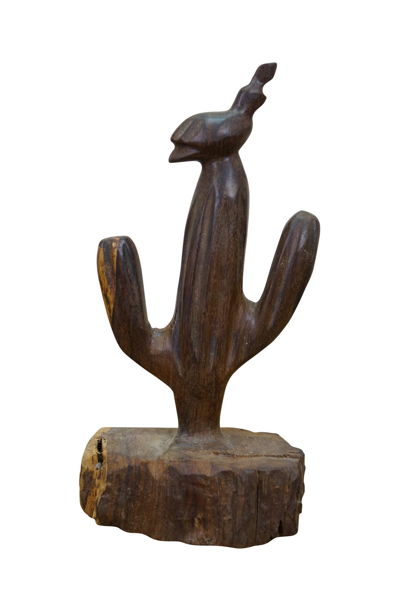 3 Vintage Hand Carved Sculptures. Made from Ironwood. Features a Saguaro cactus with bird on top. A carved turtle and a large Prickly Pear Sculpture