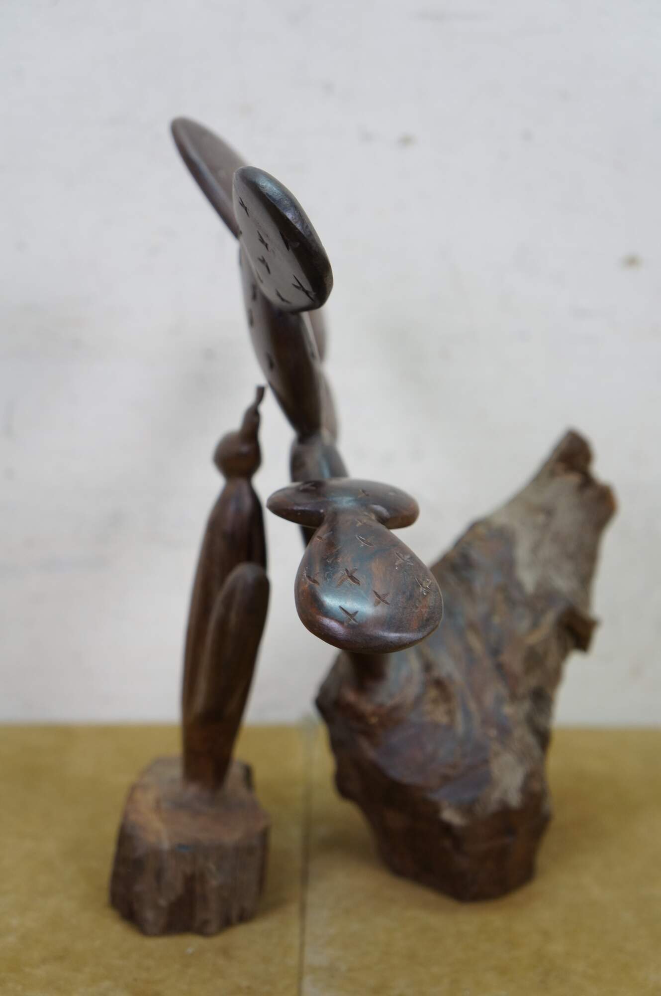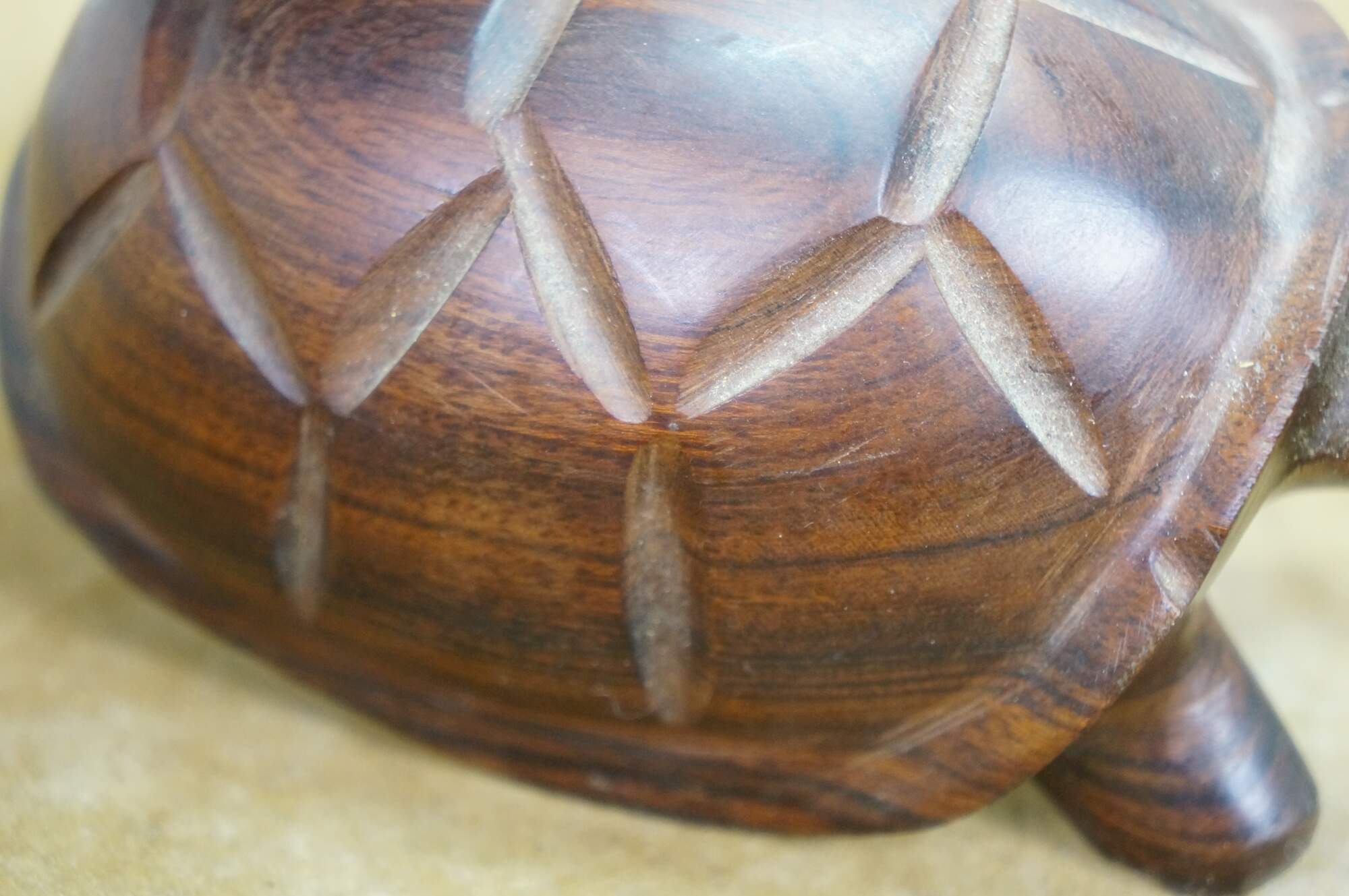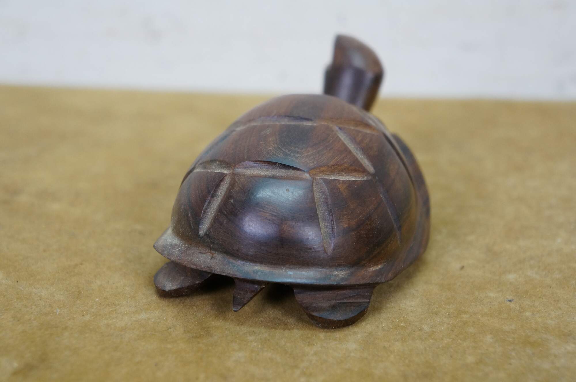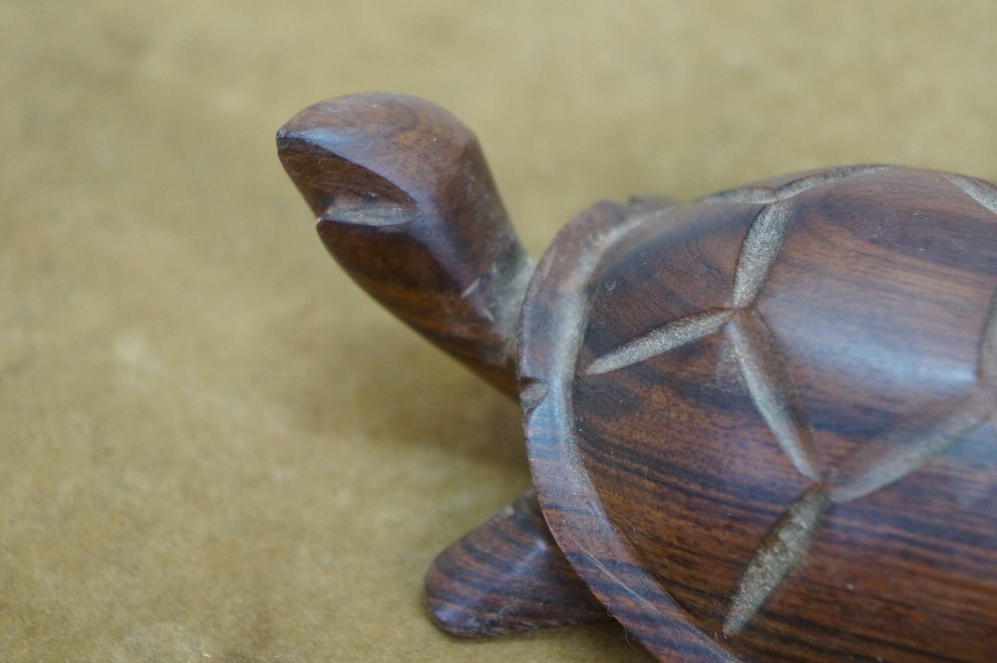 3 Vintage Hand Carved Sculptures. Made from Ironwood. Features a Saguaro cactus with bird on top. A carved turtle and a large Prickly Pear Sculpture