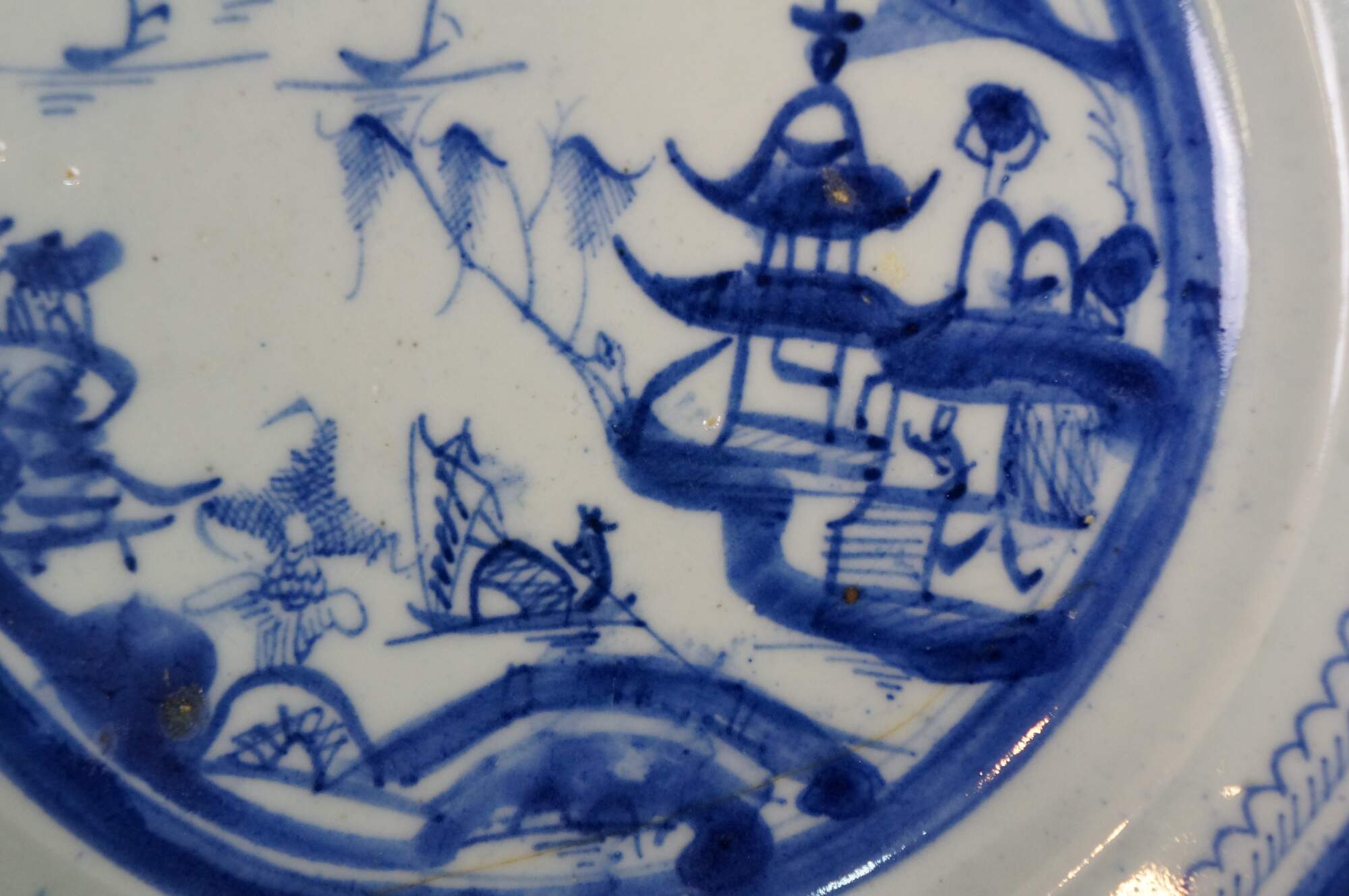 16 Antique Chinese Export Canton Blue White Pagoda Willow Tree Boat Plates 10"