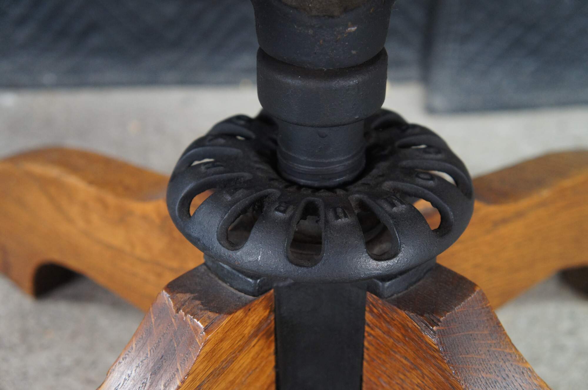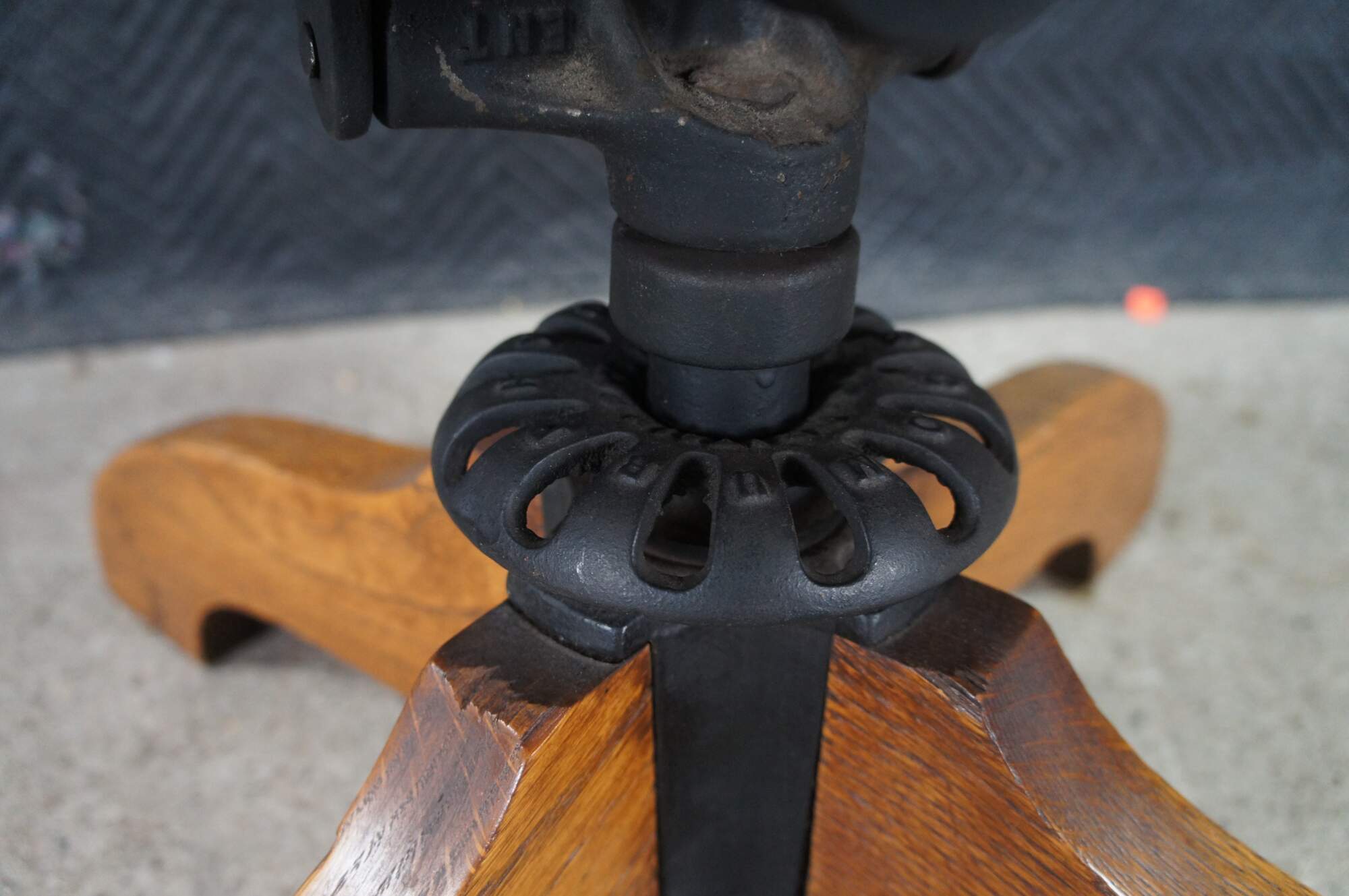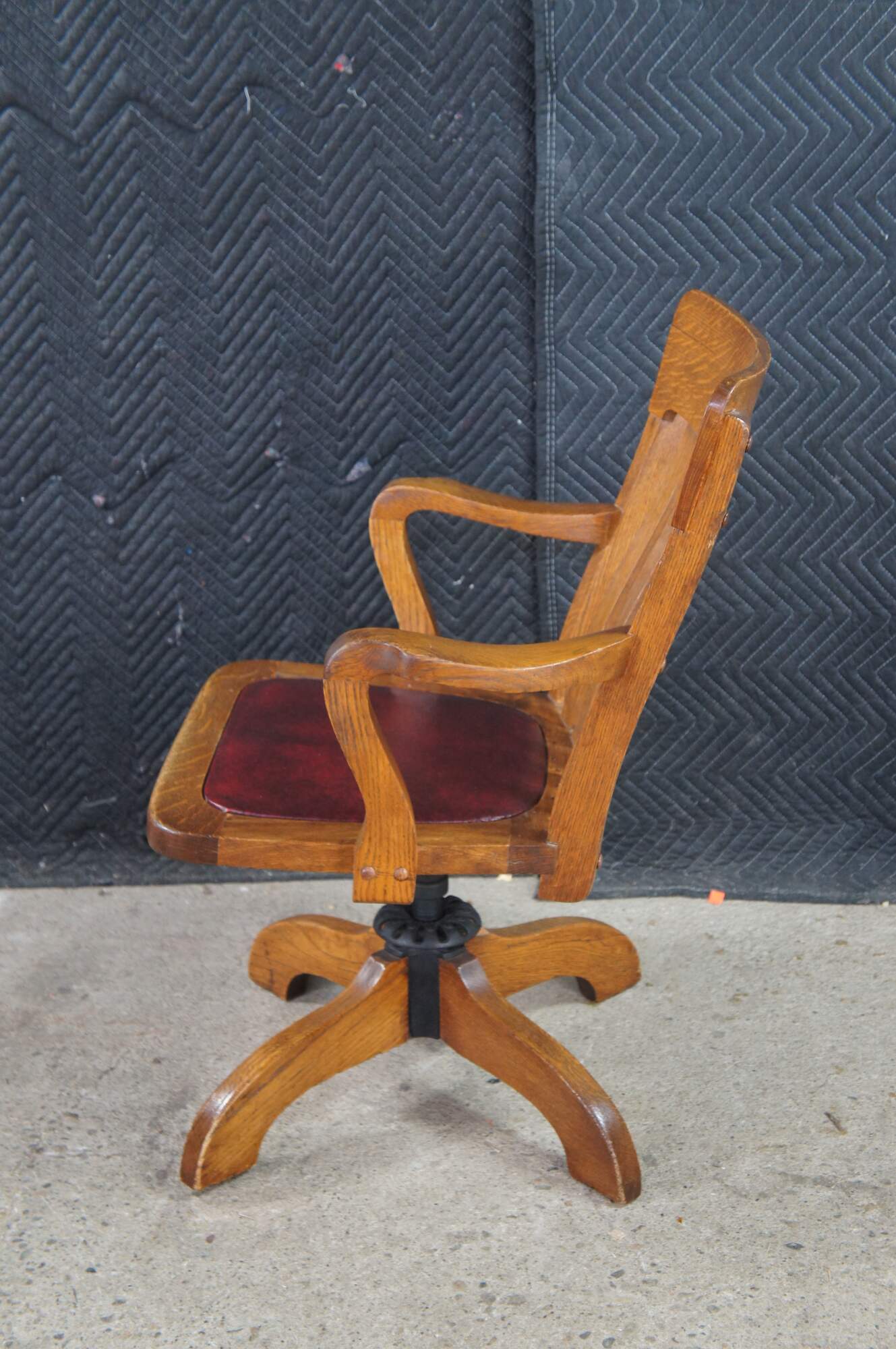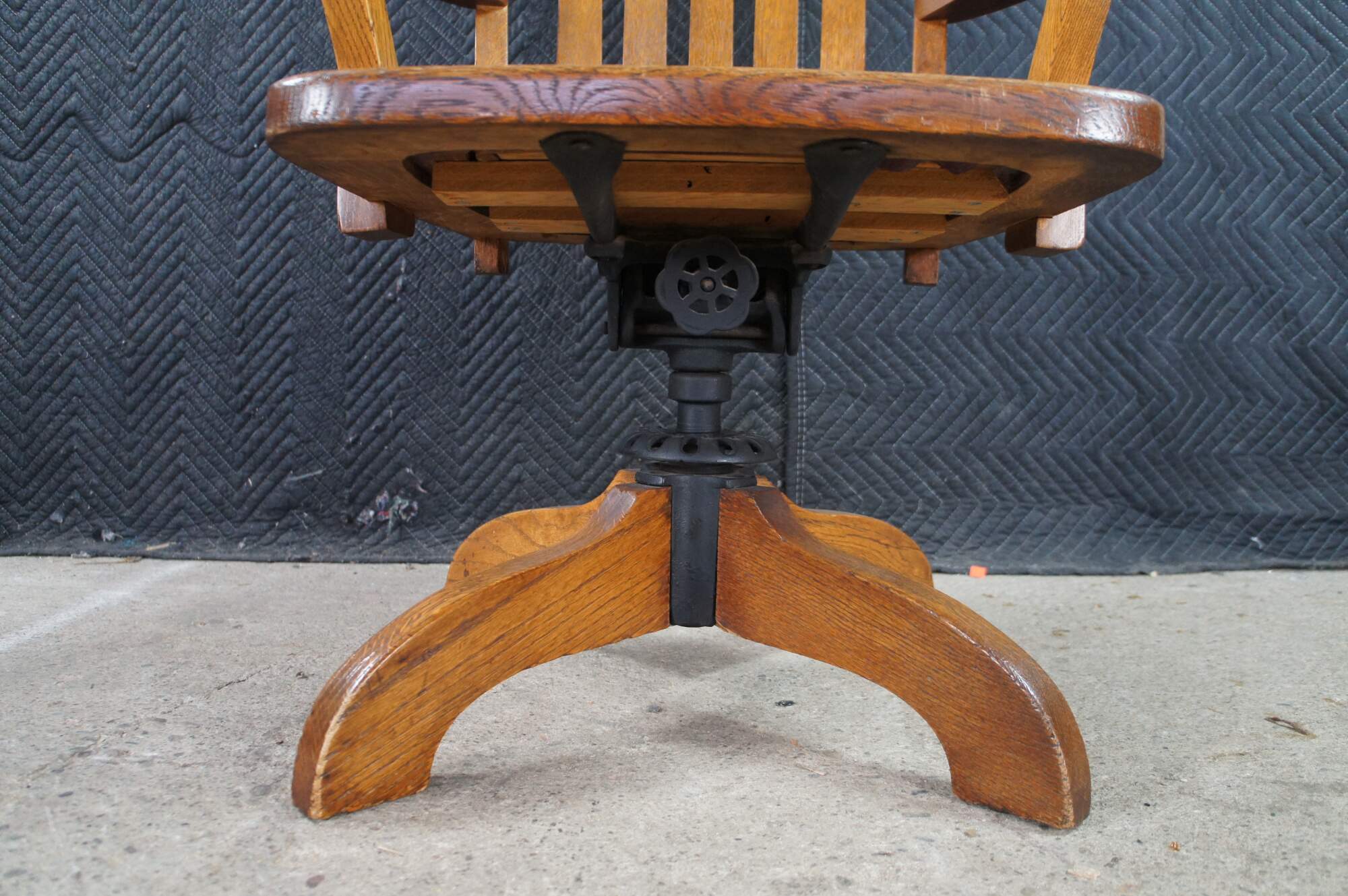Charming Edwardian Era Desk Chair, circa 1900s. Features a quartersawn oak frame with a slat back, contoured arms and a leather seat. The seat is mounted over an adjustable base.