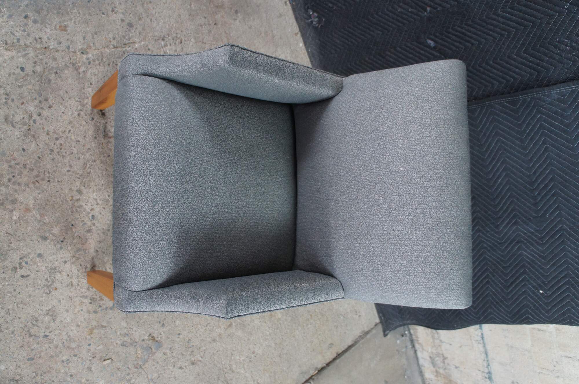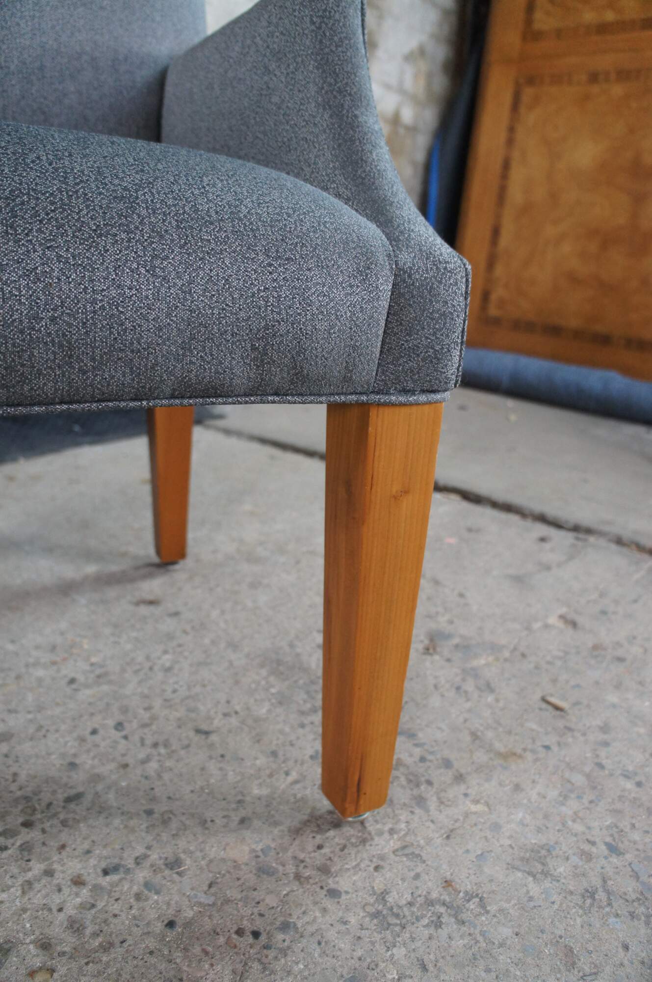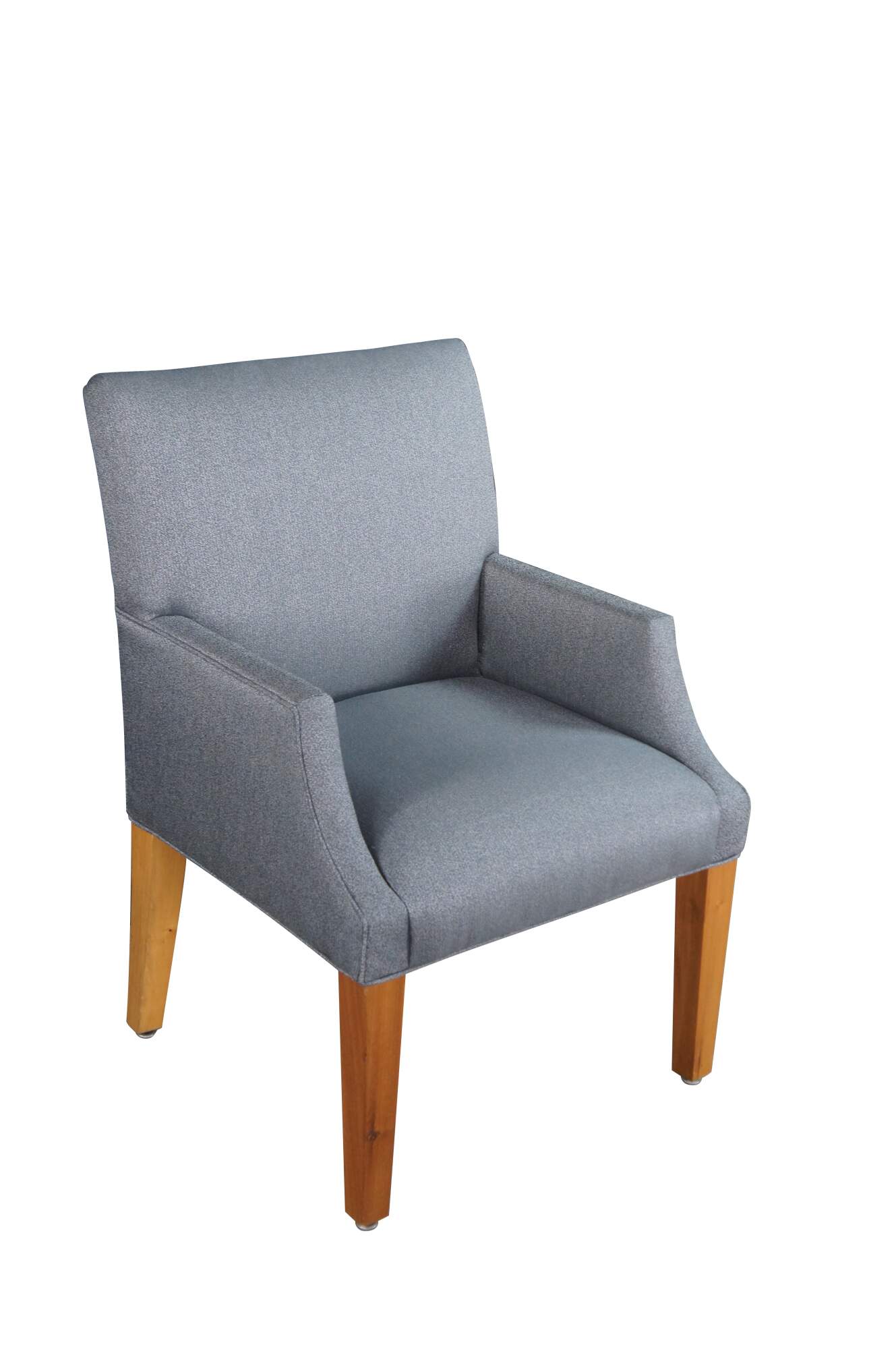 Features a modern ash frame with gray upholstery and track arms, downswept along the front over square tapered legs. Great for use in a game room or around a dining / breakfast nook.