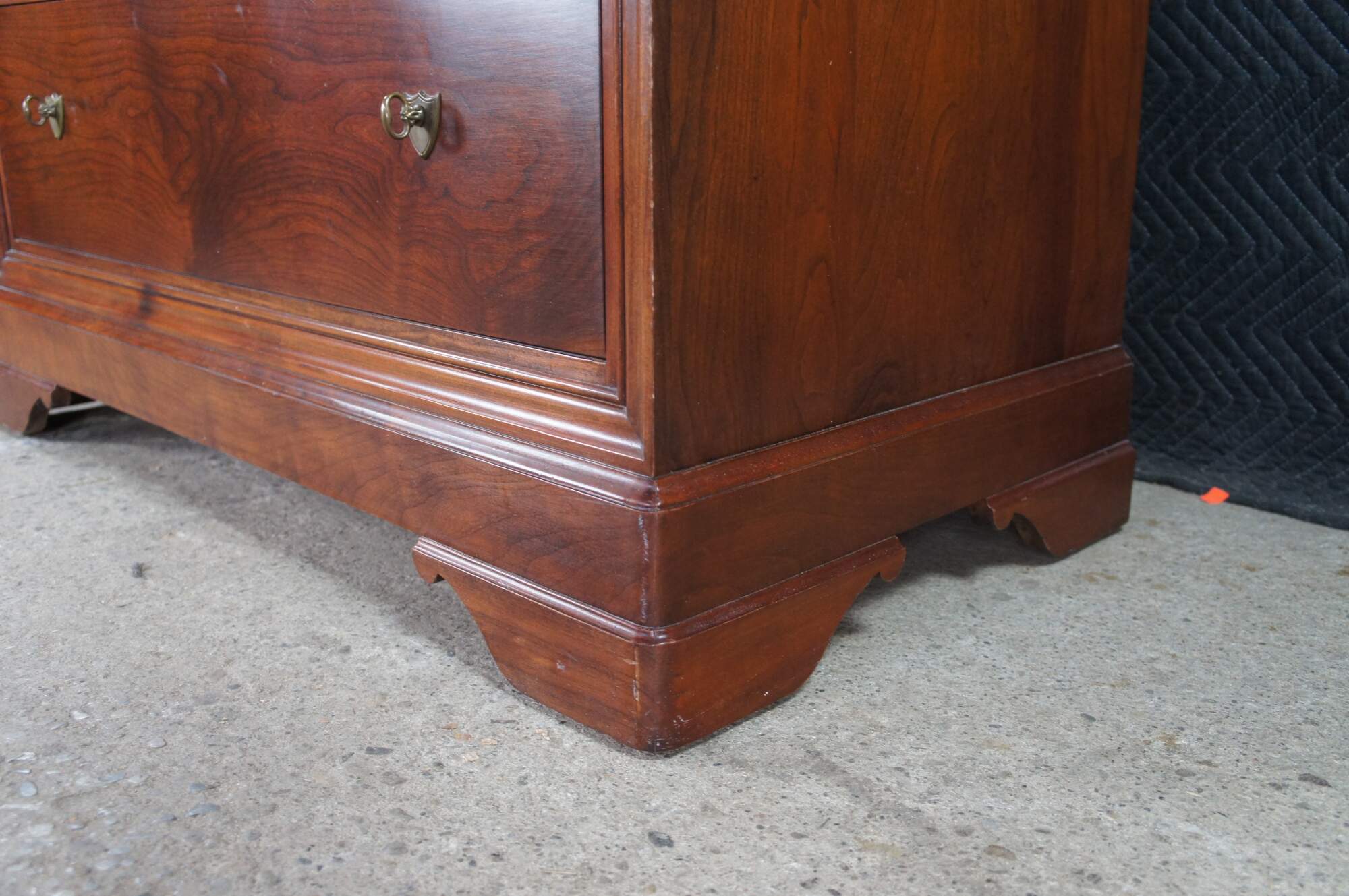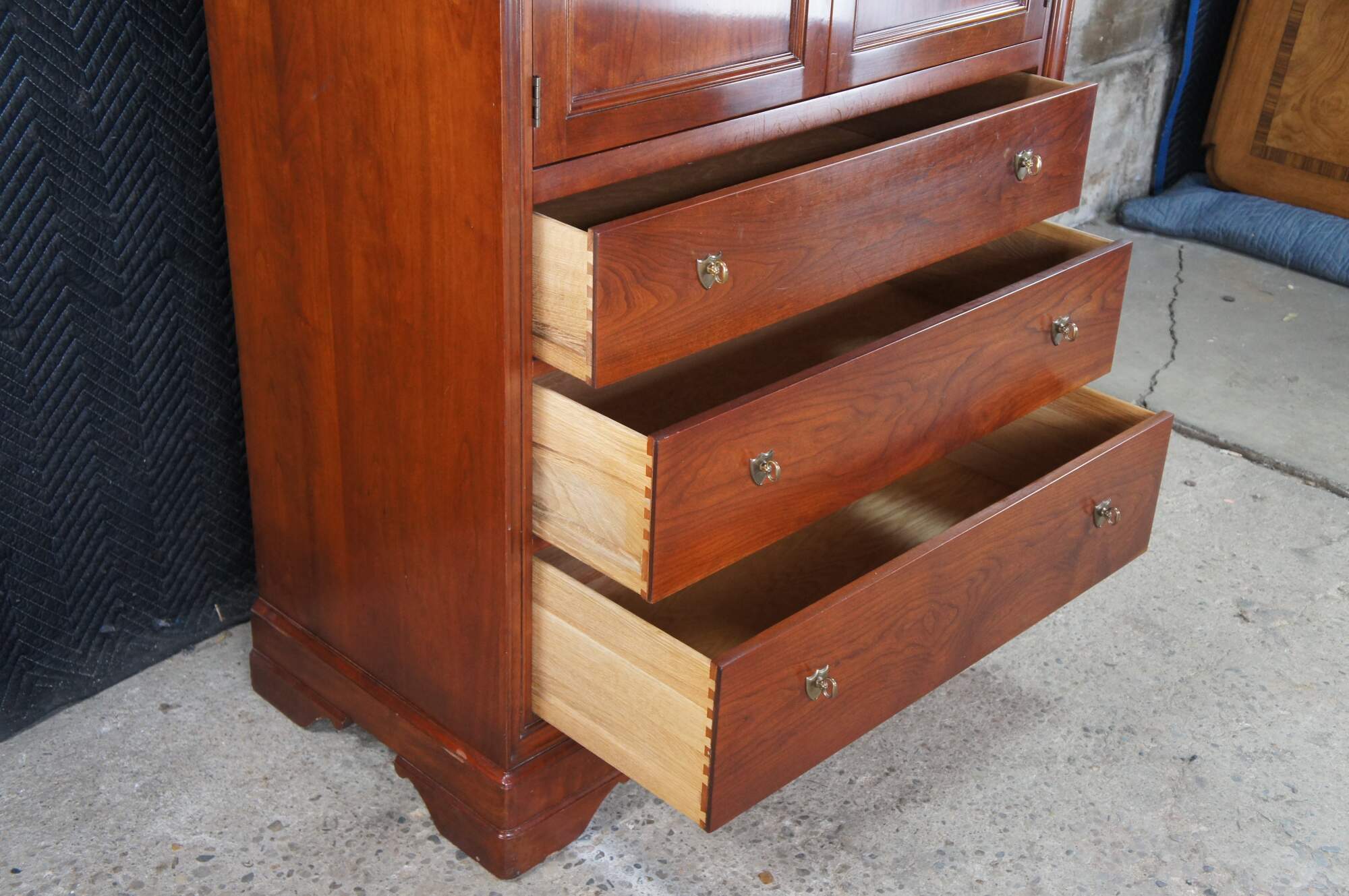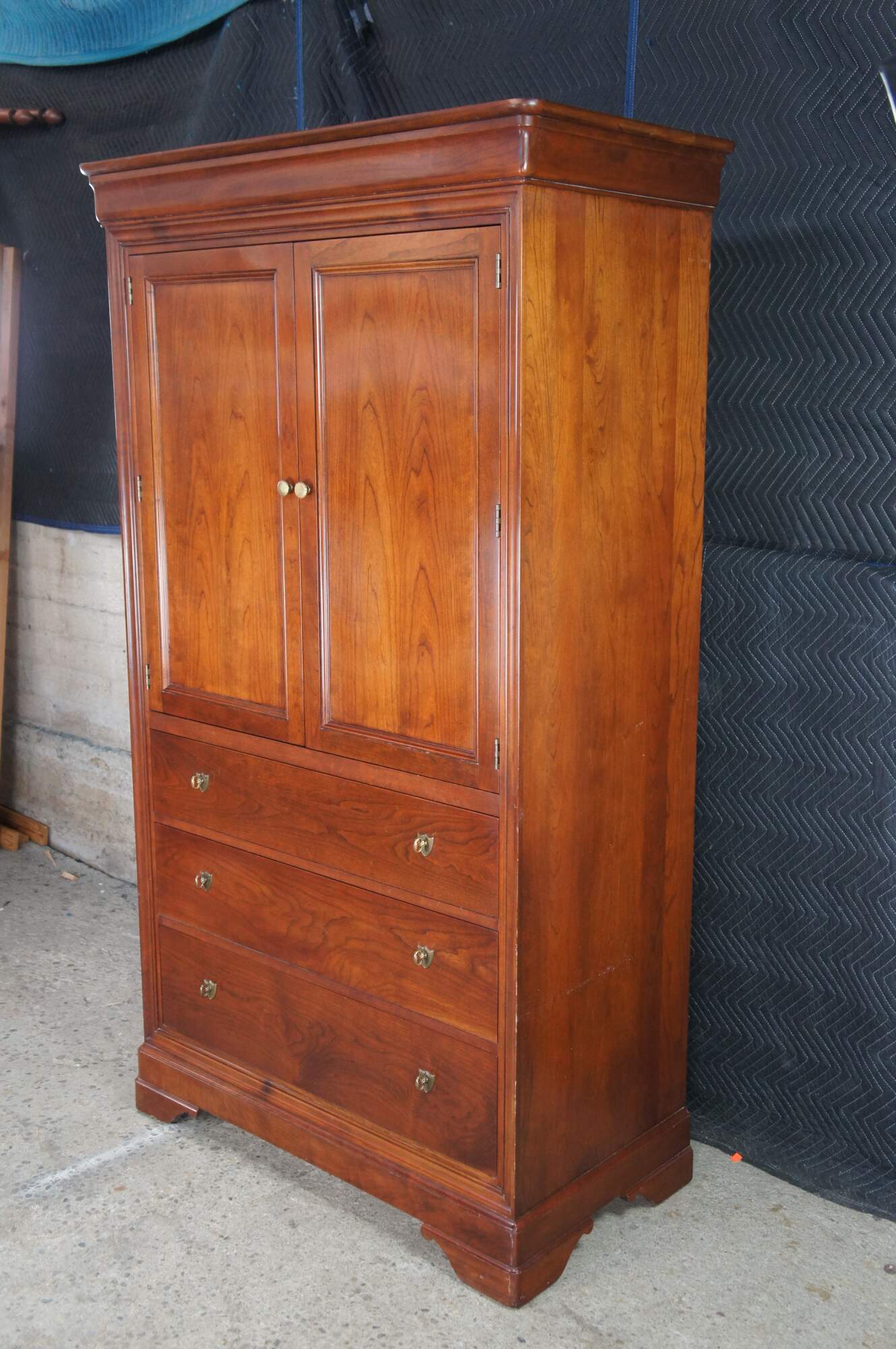 Stickley French Louis Philippe Style Armoire, #7808, circa 2005. Made from solid cherry with two doors opening to a divided interior over three lower dovetailed drawers with brass hardware. Drawer pulls have shield plates. The dresser is supported by a plinth base with bracket feet.