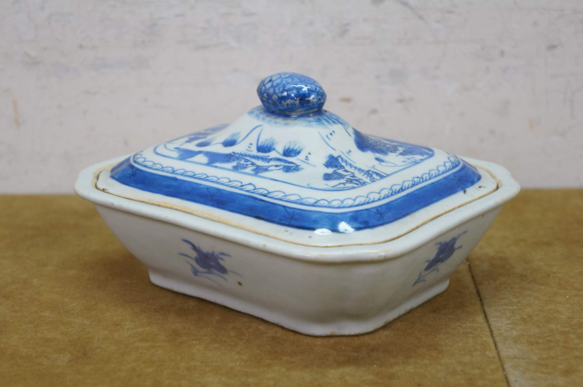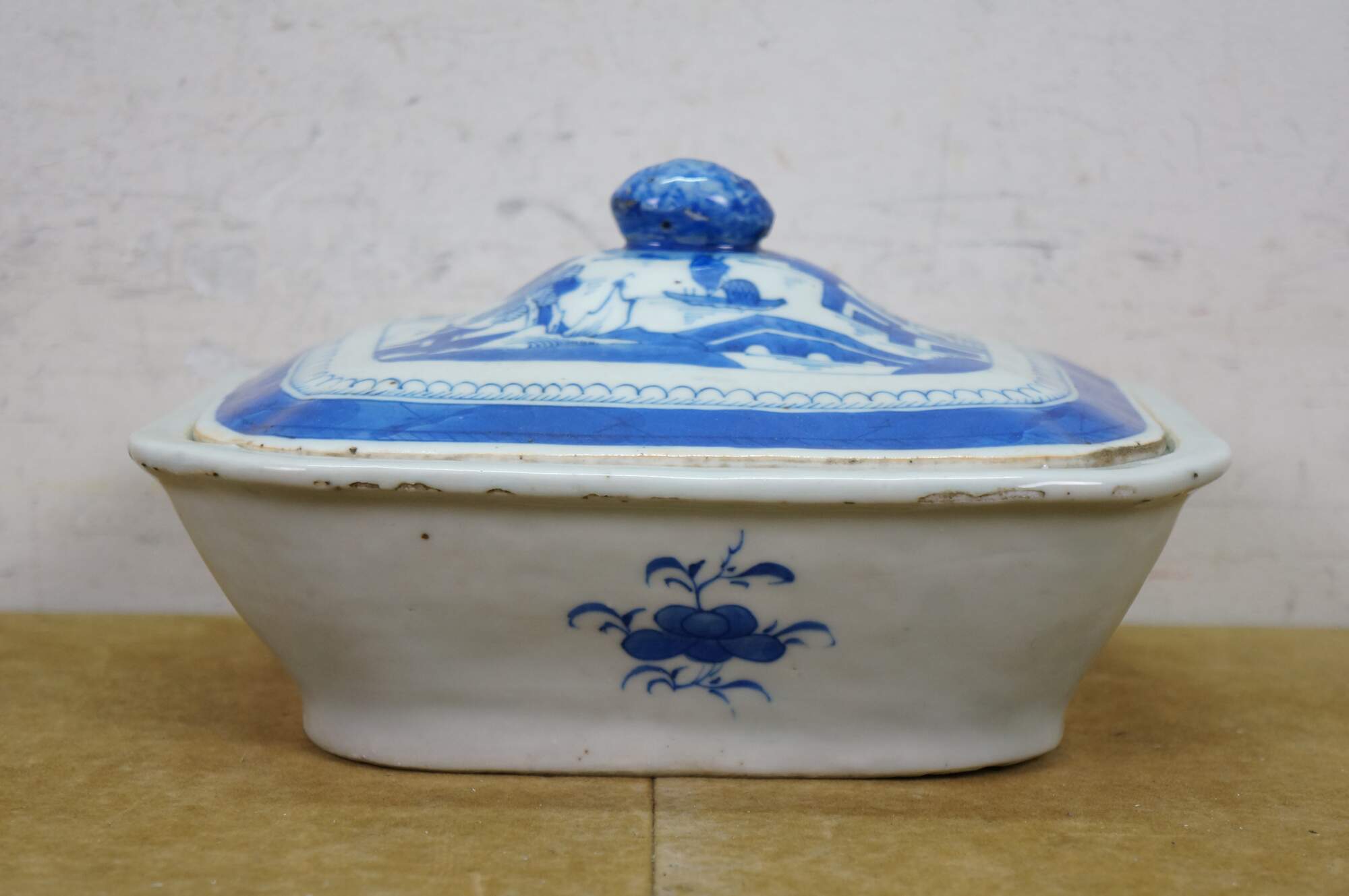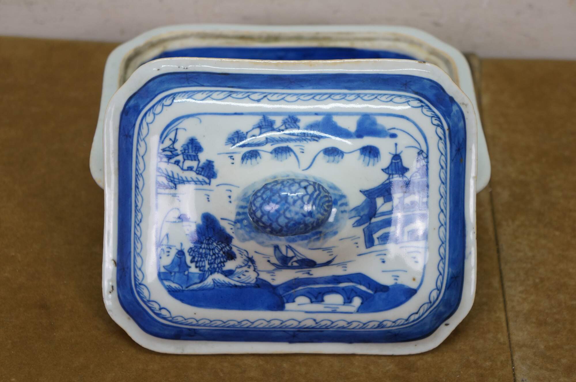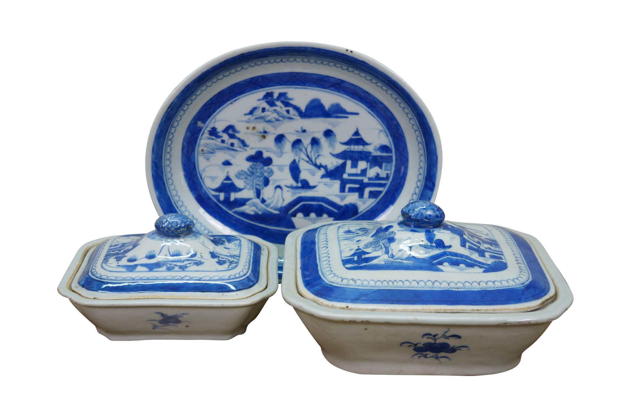 Antique 19th century Qing Dynasty Chinese Canton export blue and white porcelain serving pieces. Includes two vegetable tureens with lids and one oval serving platter.� Features classic Chinoiserie landscapes with pagodas, tea houses, willow patterns and pineapple finial.