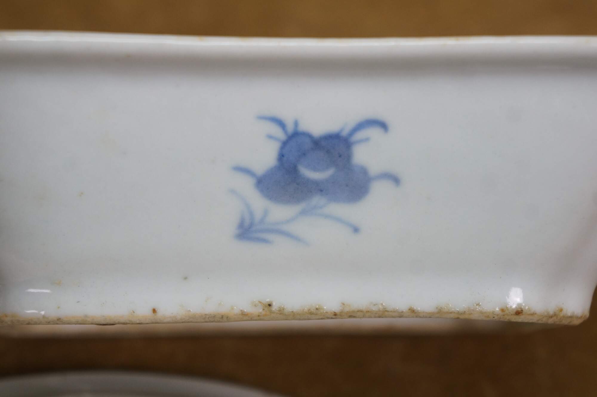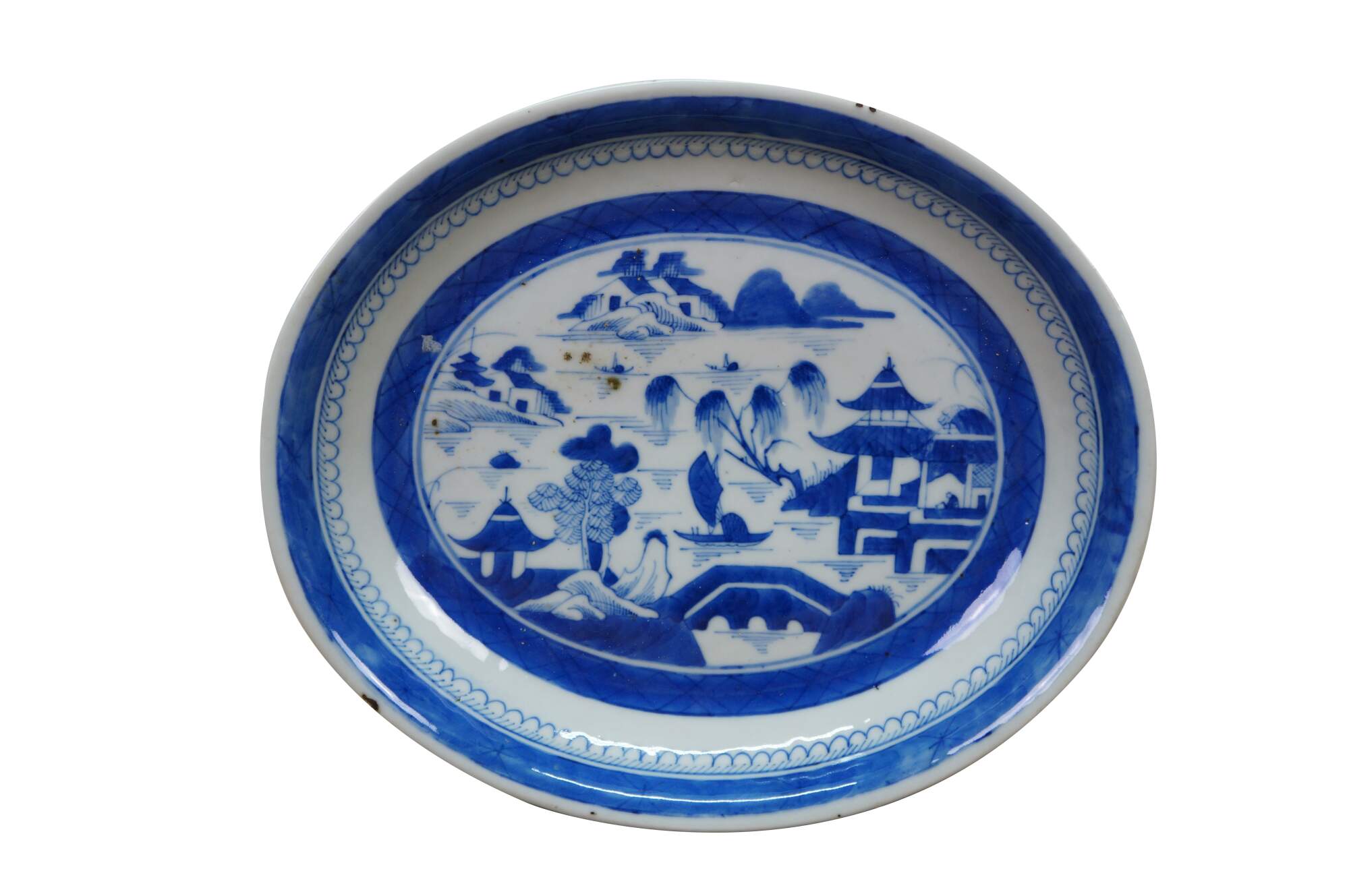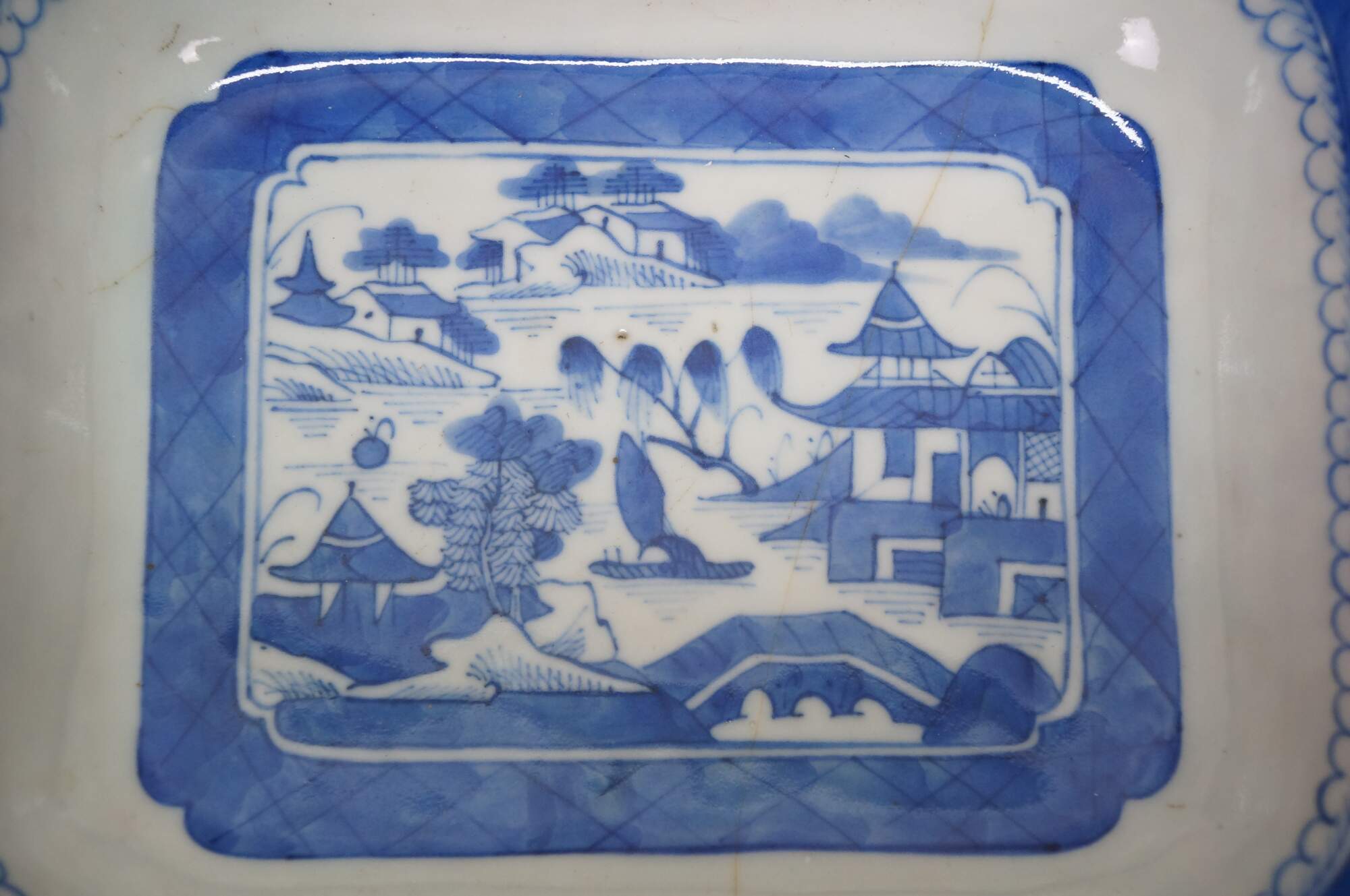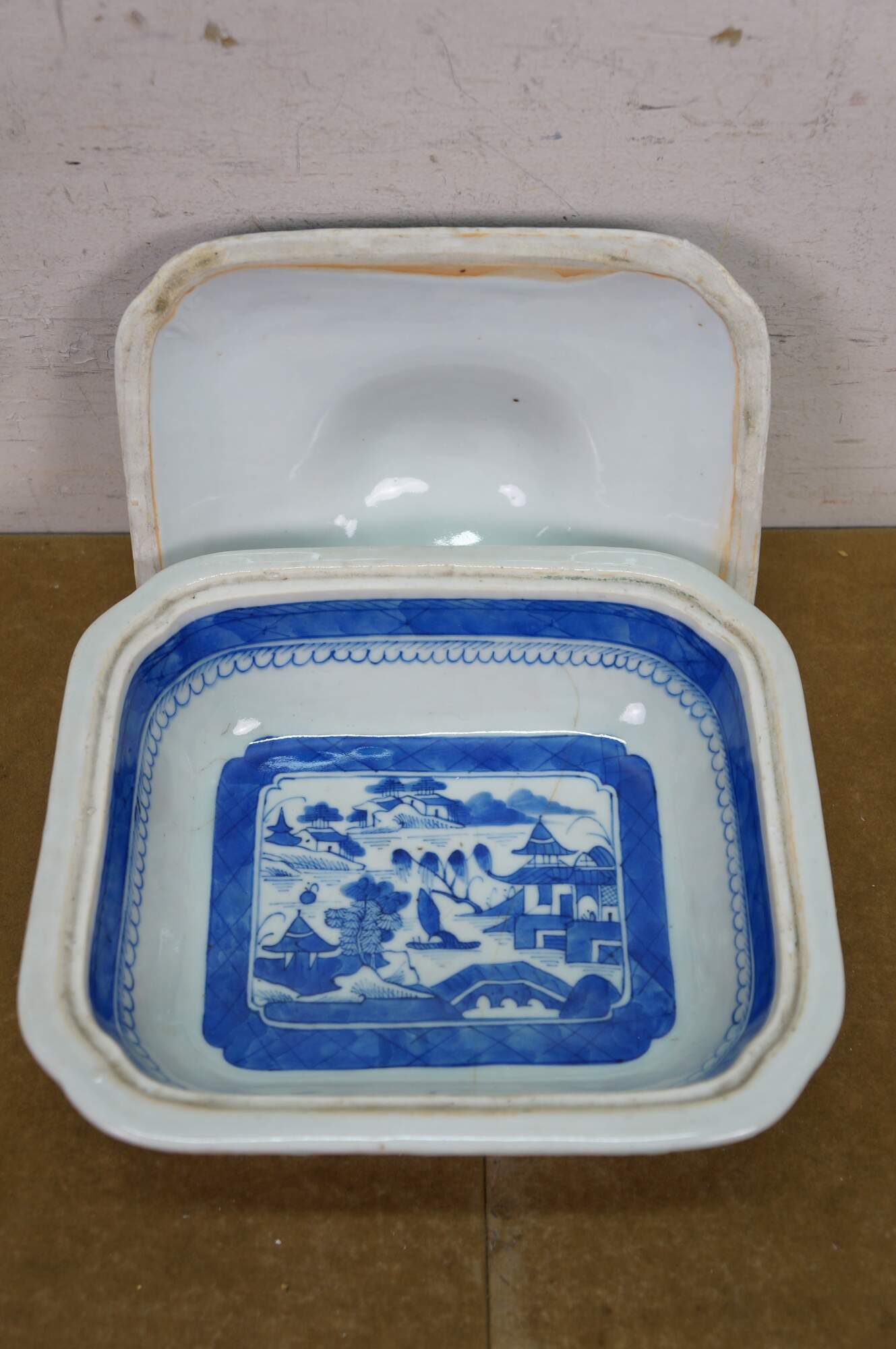 Antique 19th century Qing Dynasty Chinese Canton export blue and white porcelain serving pieces. Includes two vegetable tureens with lids and one oval serving platter.� Features classic Chinoiserie landscapes with pagodas, tea houses, willow patterns and pineapple finial.