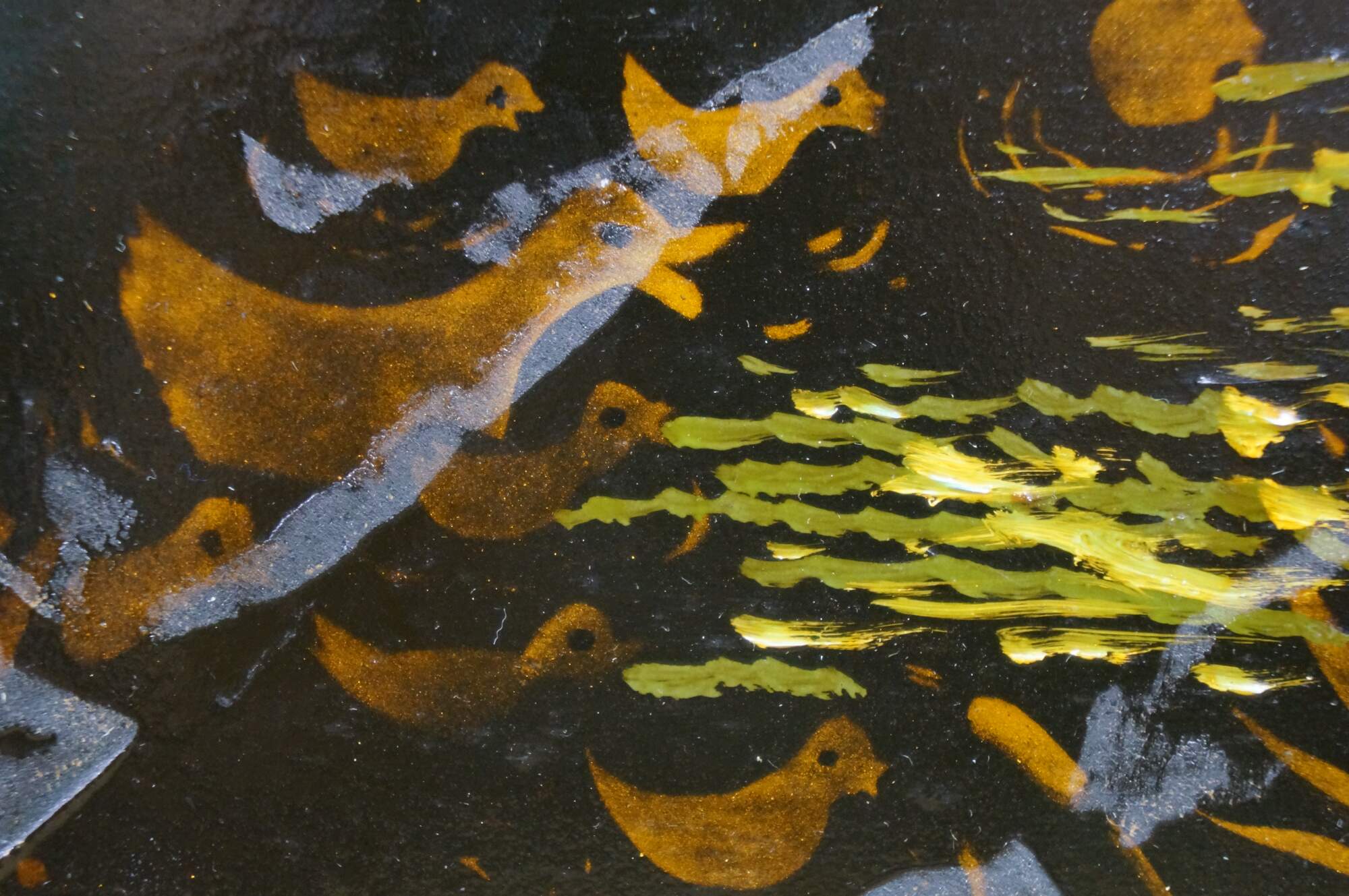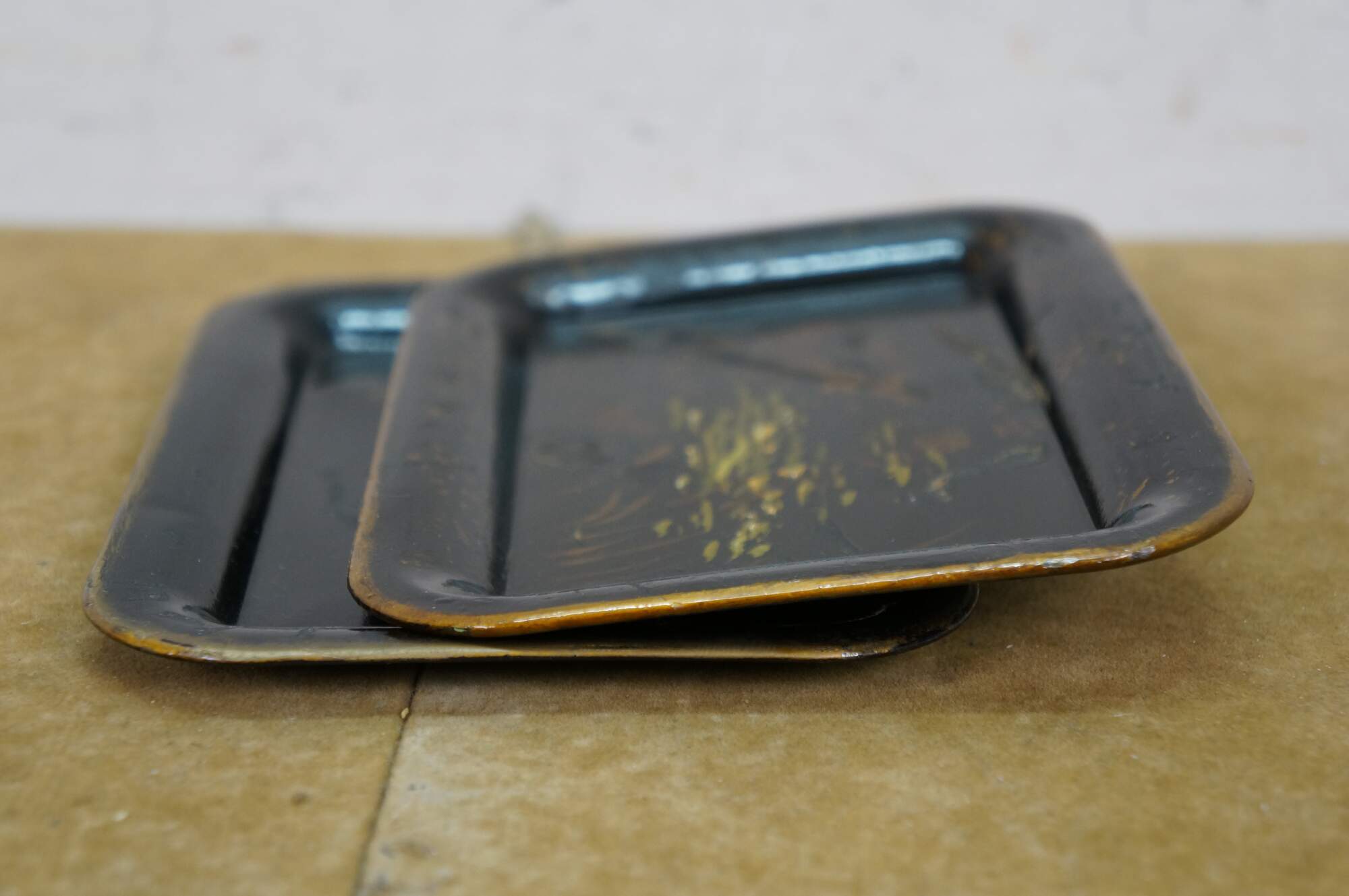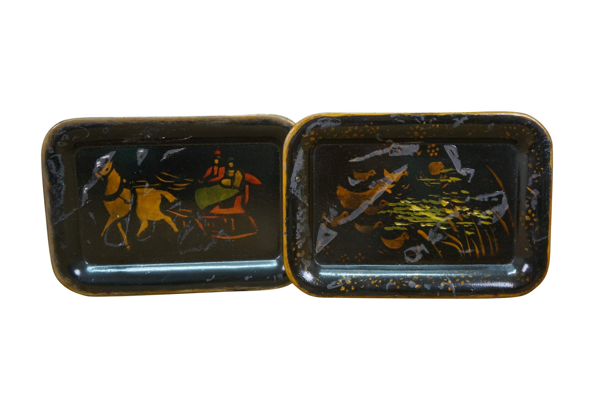 Two vintage hand-painted black lacquer rectangular toleware trays / platters, featuring an equestrian scene of a horse drawn carriage (troika) and ducks in a pond.