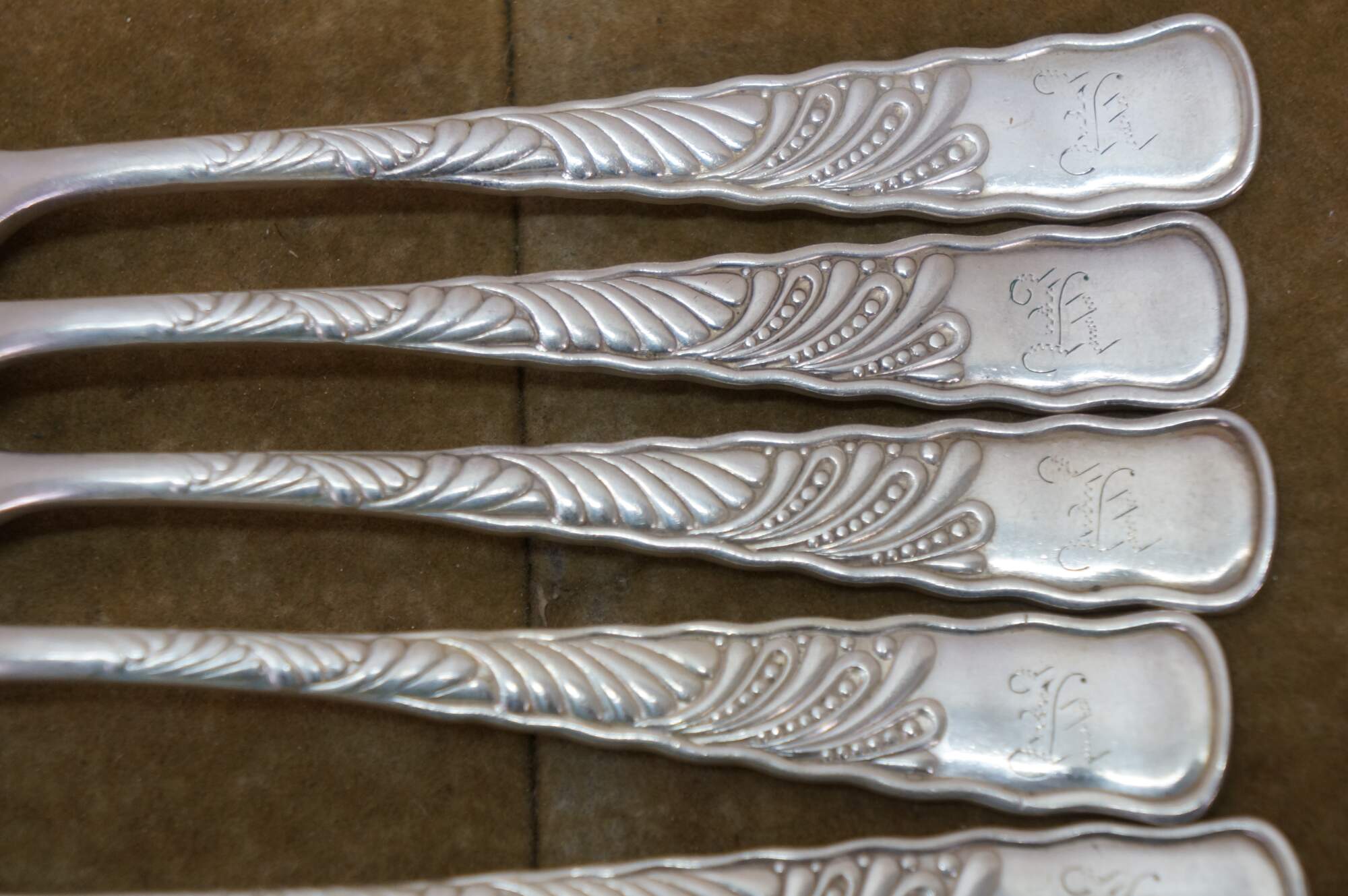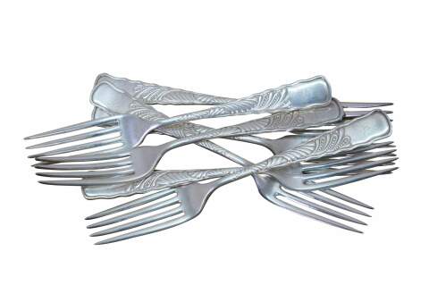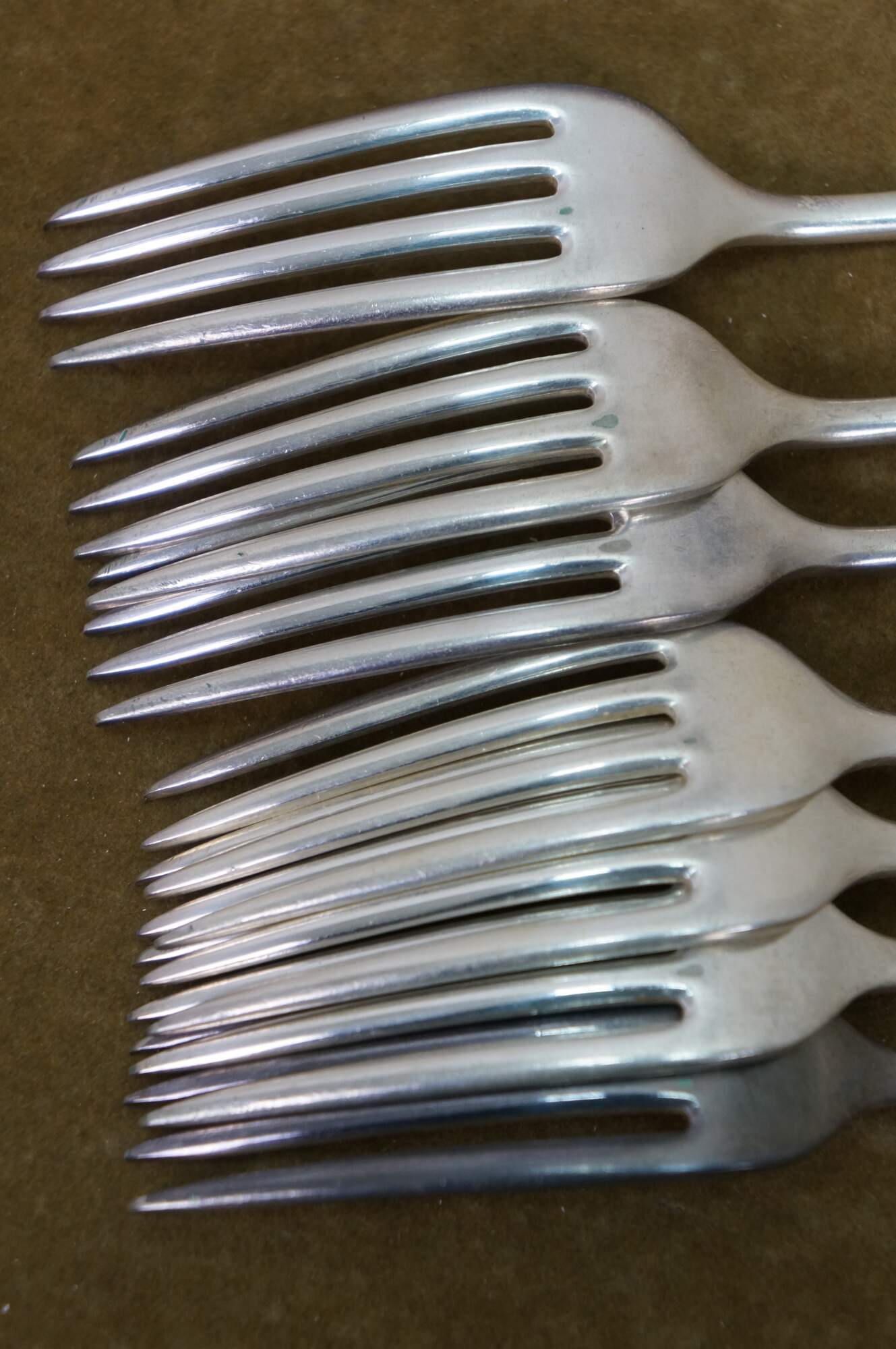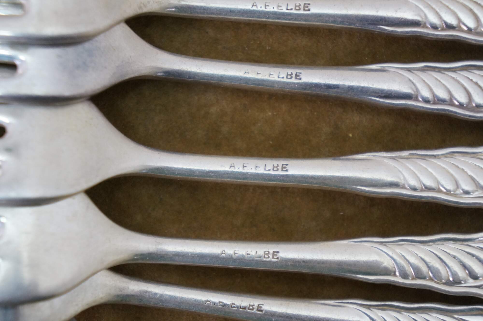 Seven rare antique Victorian 1880s Aesthetic A.E. Elbe silver plate forks. Elbe was a jeweler based in Bloomington, Illinois, in the late 19th century. Location: 106 W. Washington St., South of the Court House, Bloomington, Illinois.
