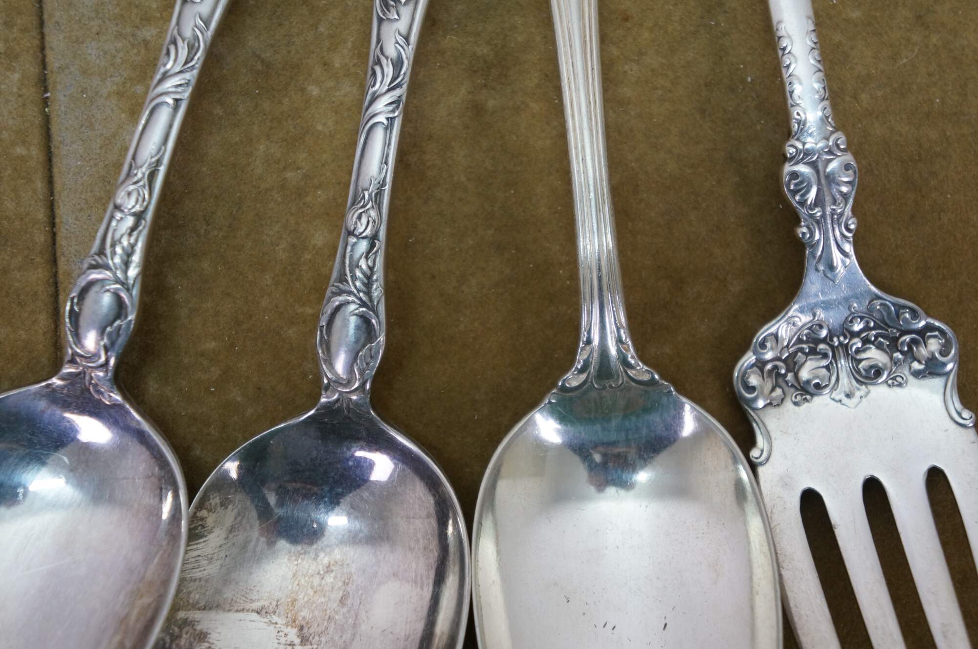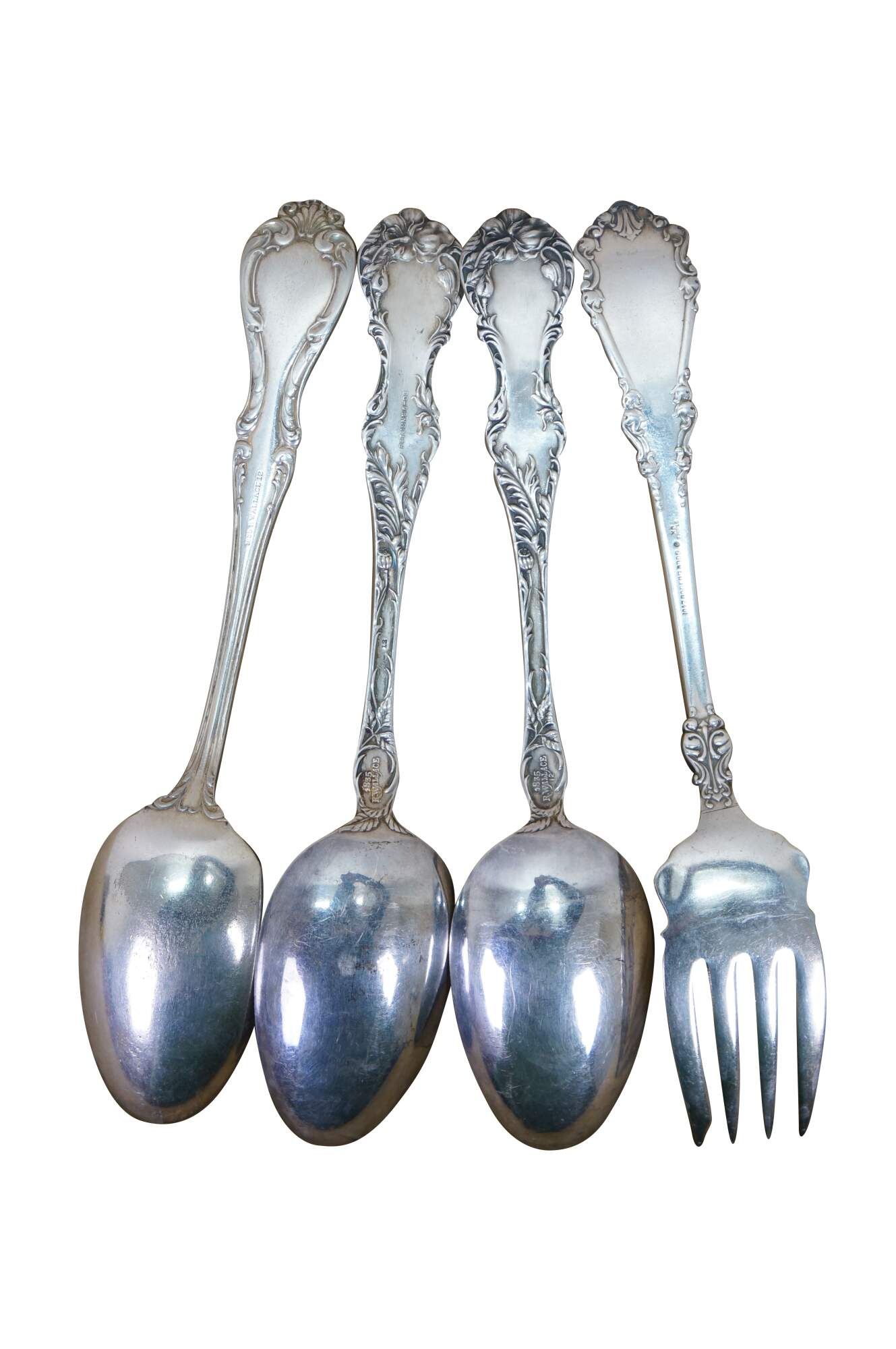 Four antique baroque silver plate serving spoons and fork.