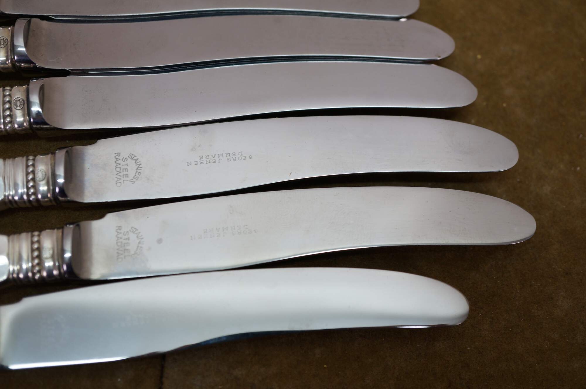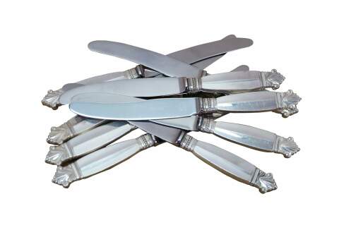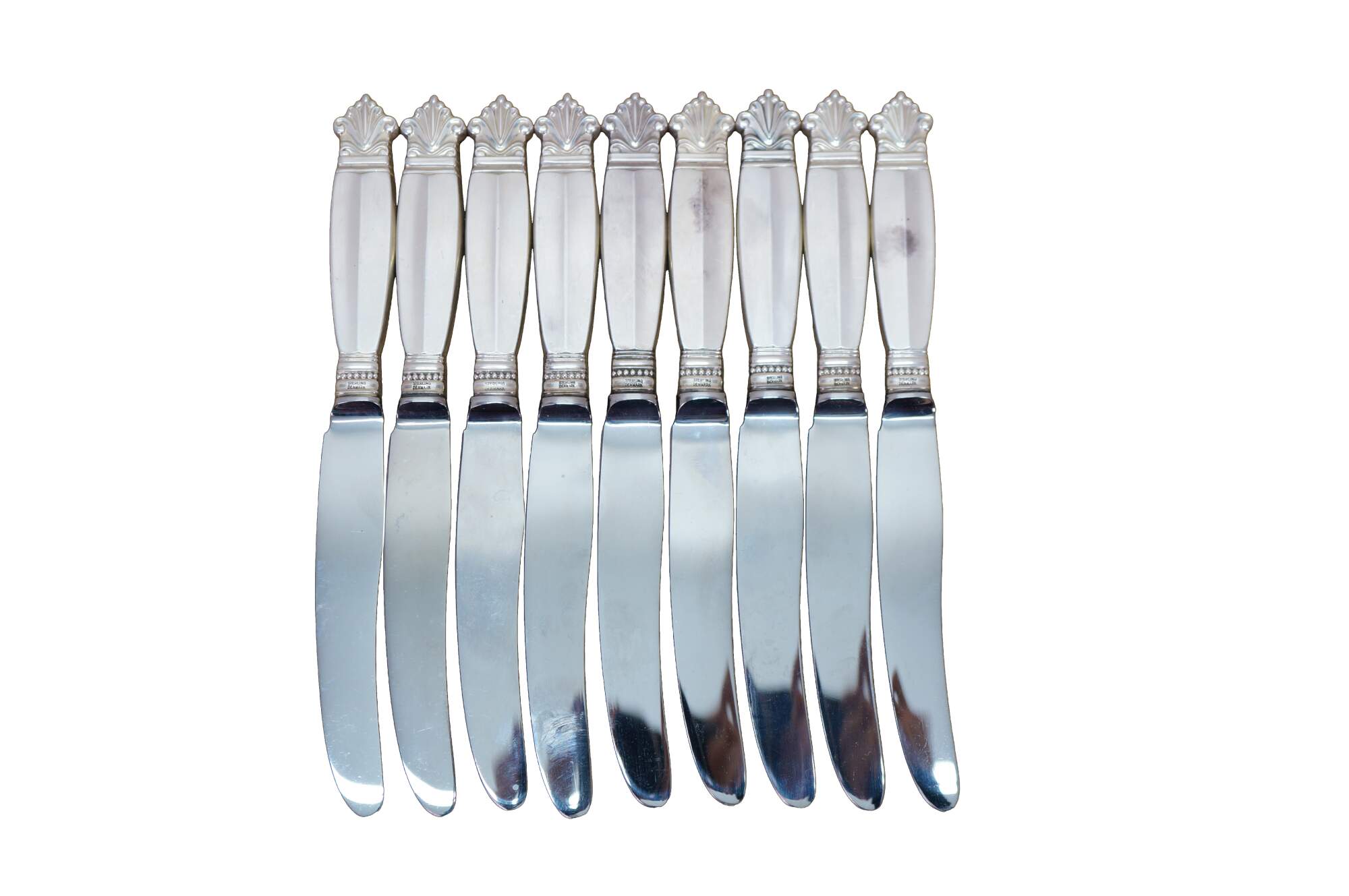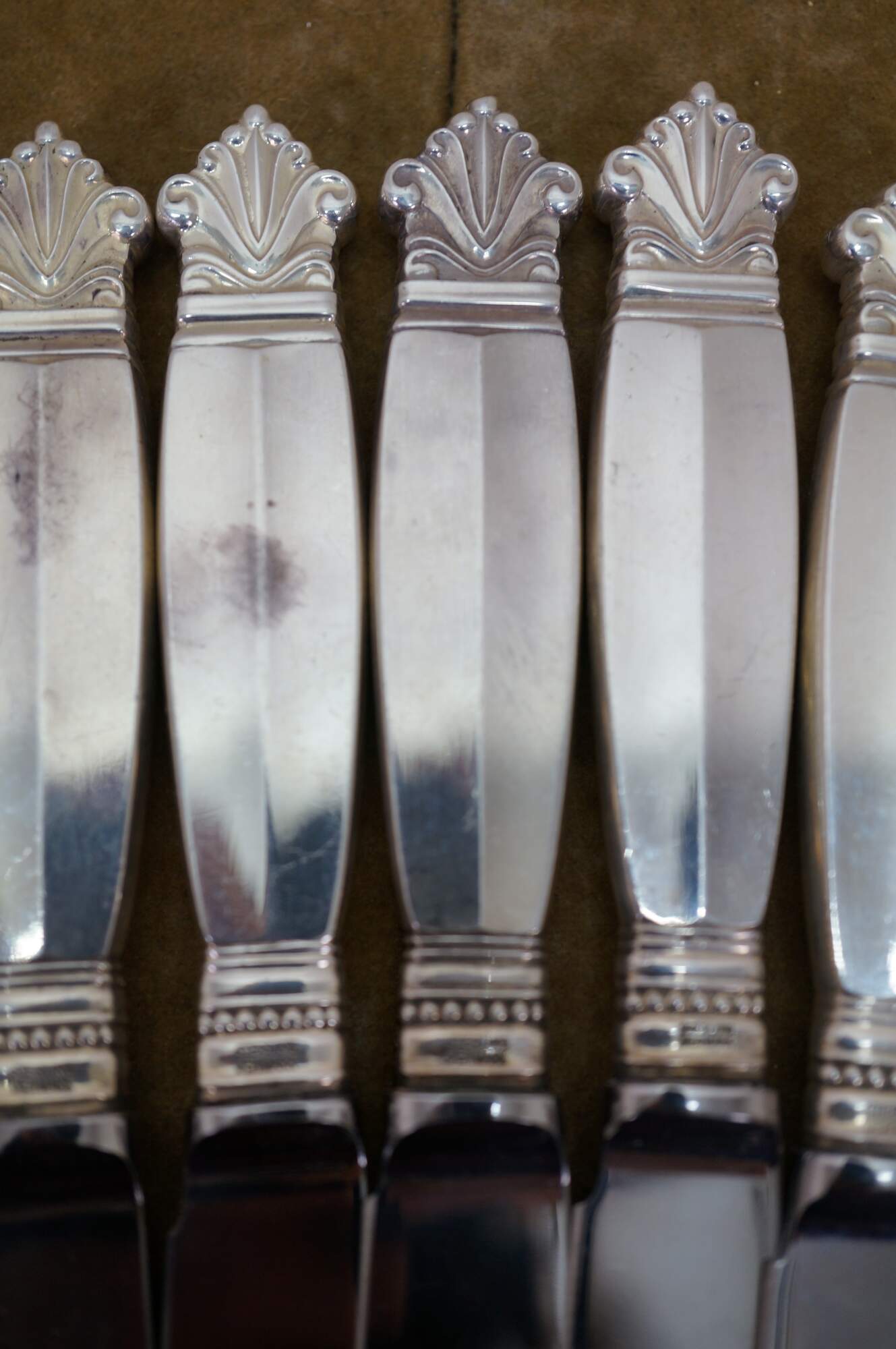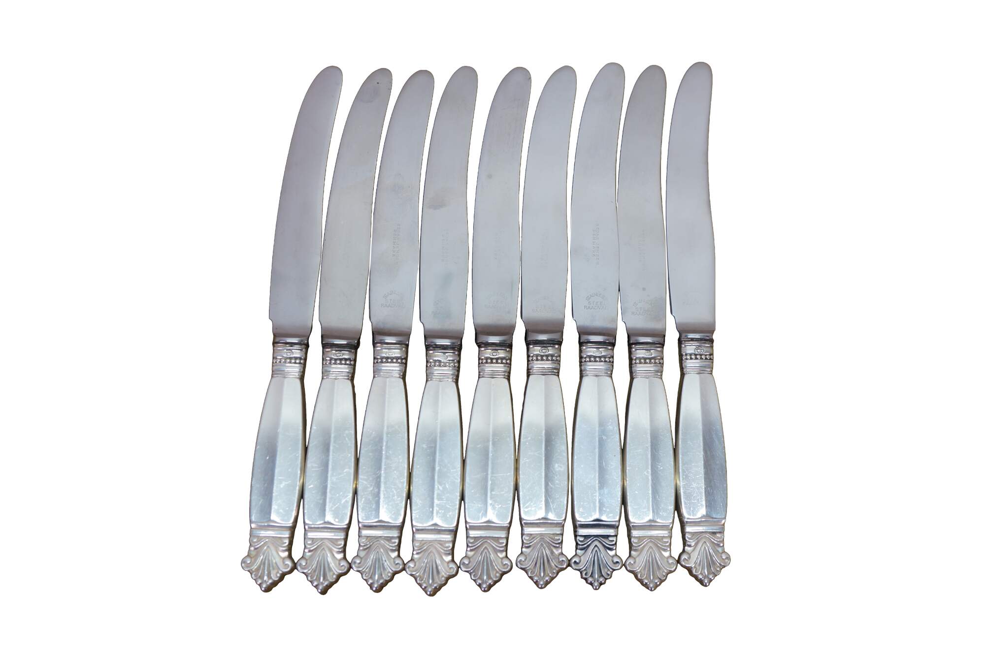 Nine antique Georg Jensen Denmark Sterling Silver 925 steel blade dinner / fruit / butter knives in the Acanthus (Dronning) pattern. The Acanthus pattern was designed by Johan Rohde and introduced in 1917 - a romantic swirl design tops each handle. Each knife features a sterling silver handle and stainless steel Raadvad blade.