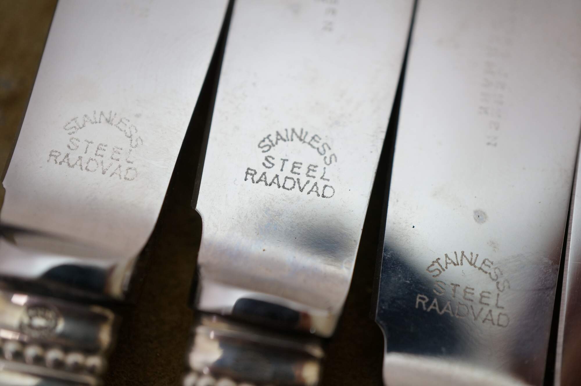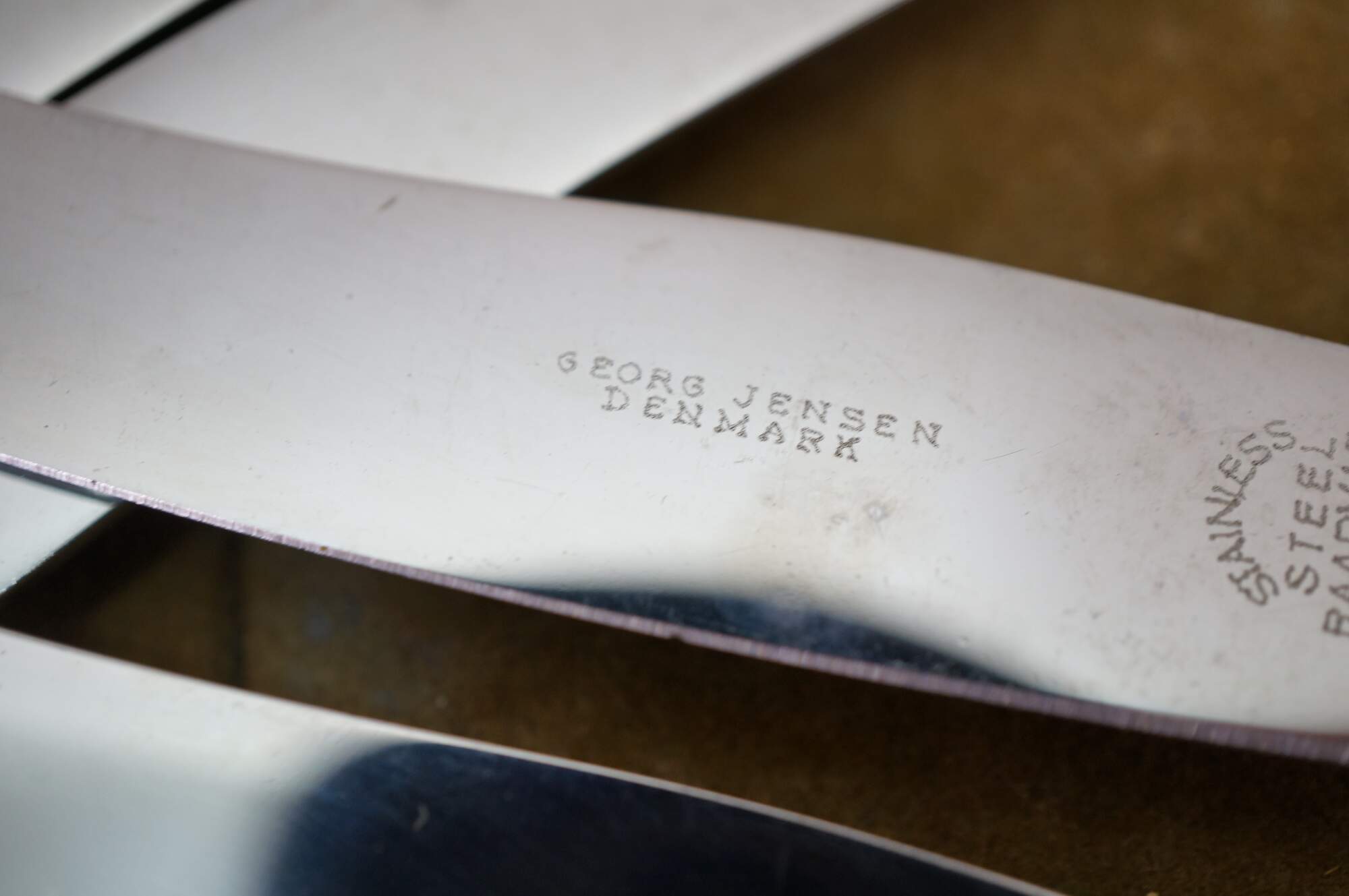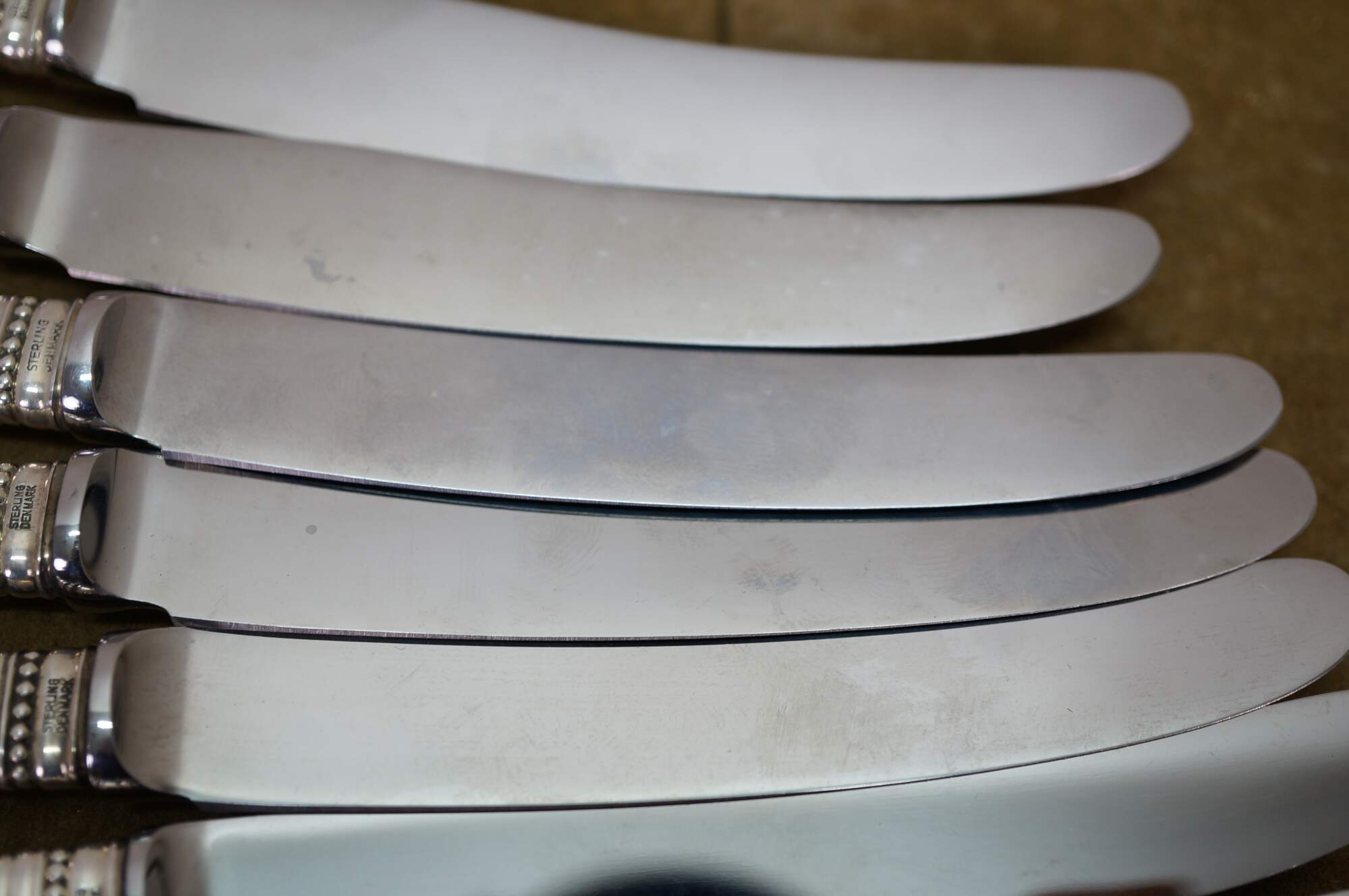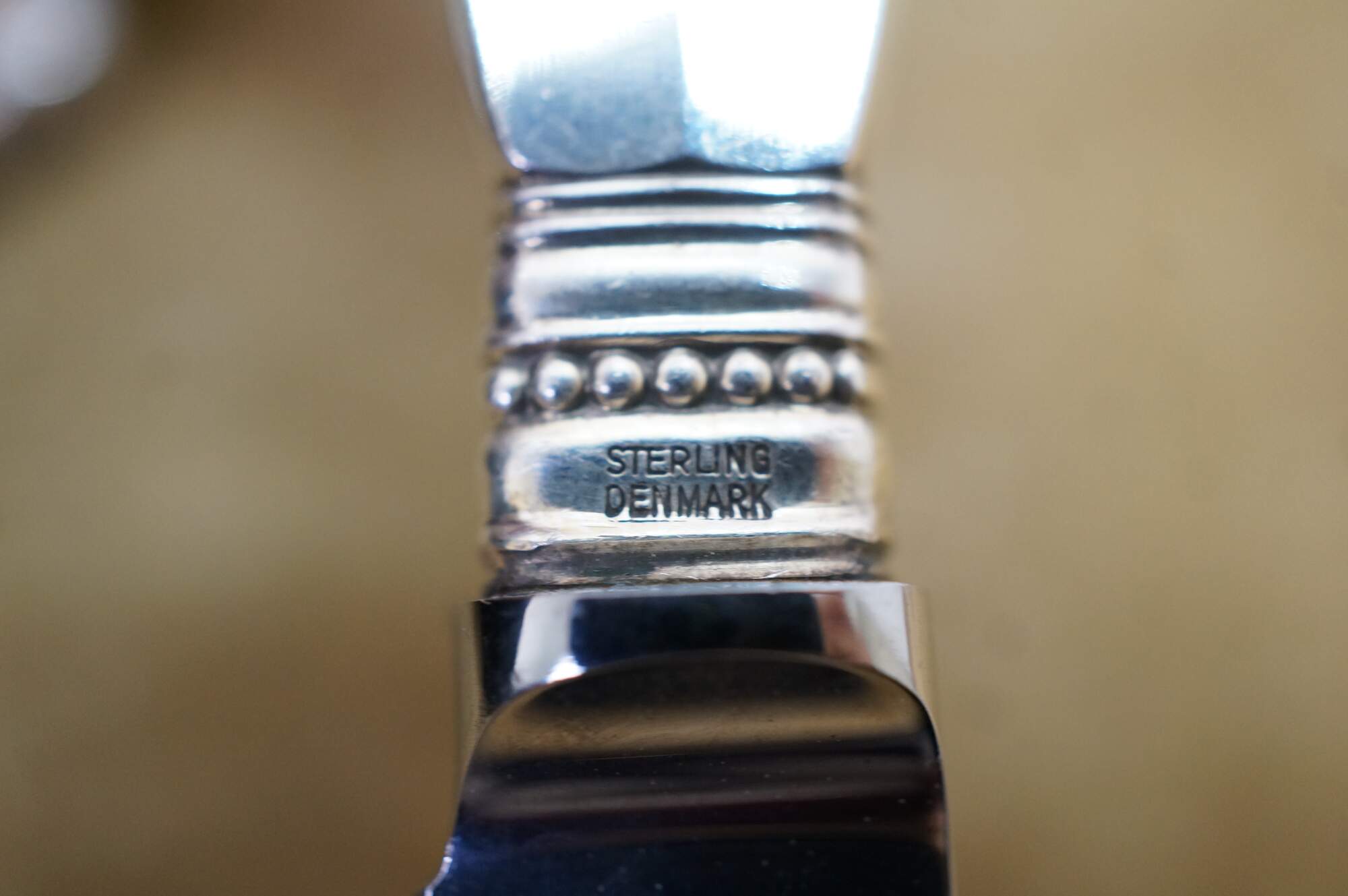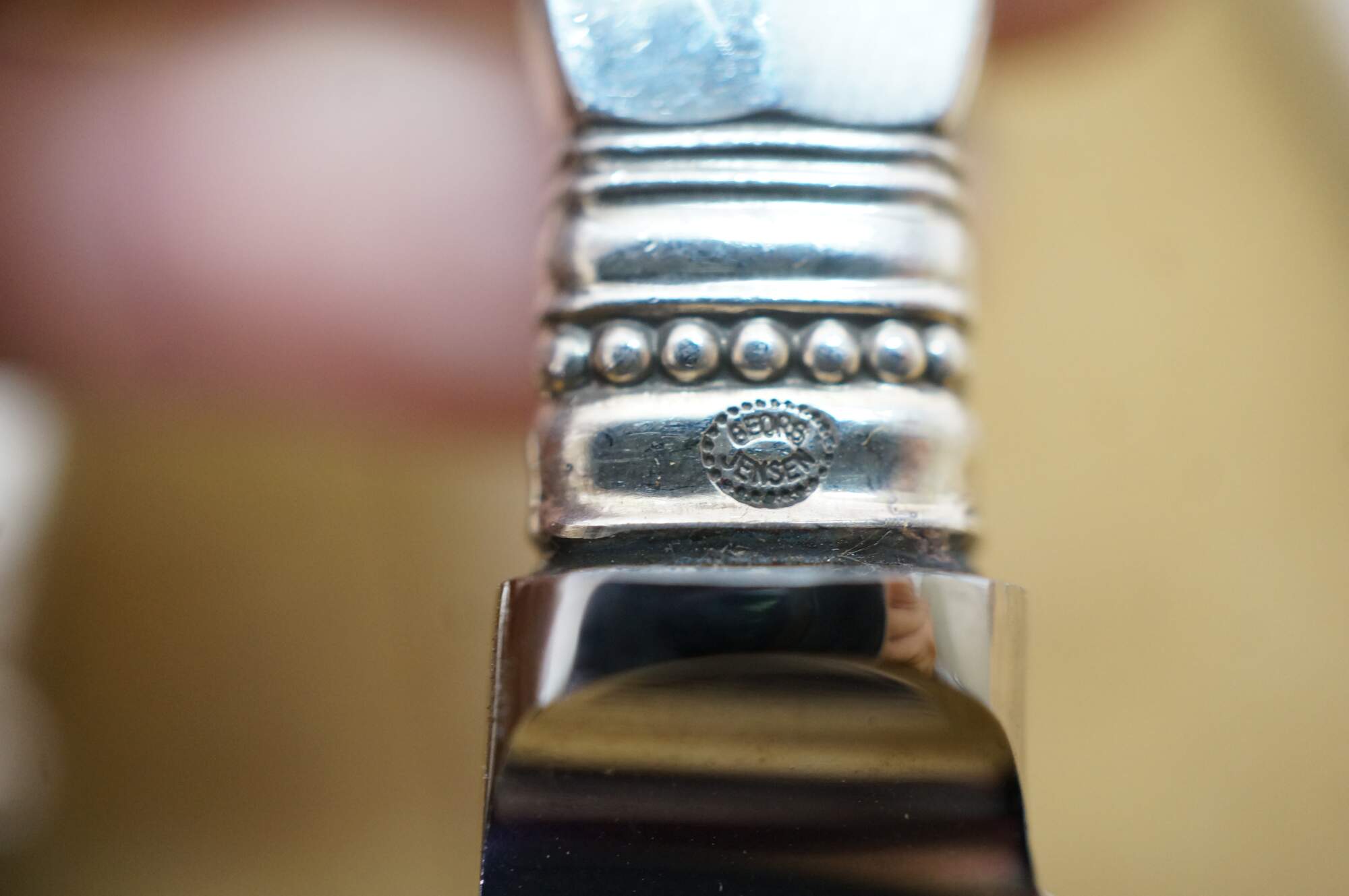 Nine antique Georg Jensen Denmark Sterling Silver 925 steel blade dinner / fruit / butter knives in the Acanthus (Dronning) pattern. The Acanthus pattern was designed by Johan Rohde and introduced in 1917 - a romantic swirl design tops each handle. Each knife features a sterling silver handle and stainless steel Raadvad blade.