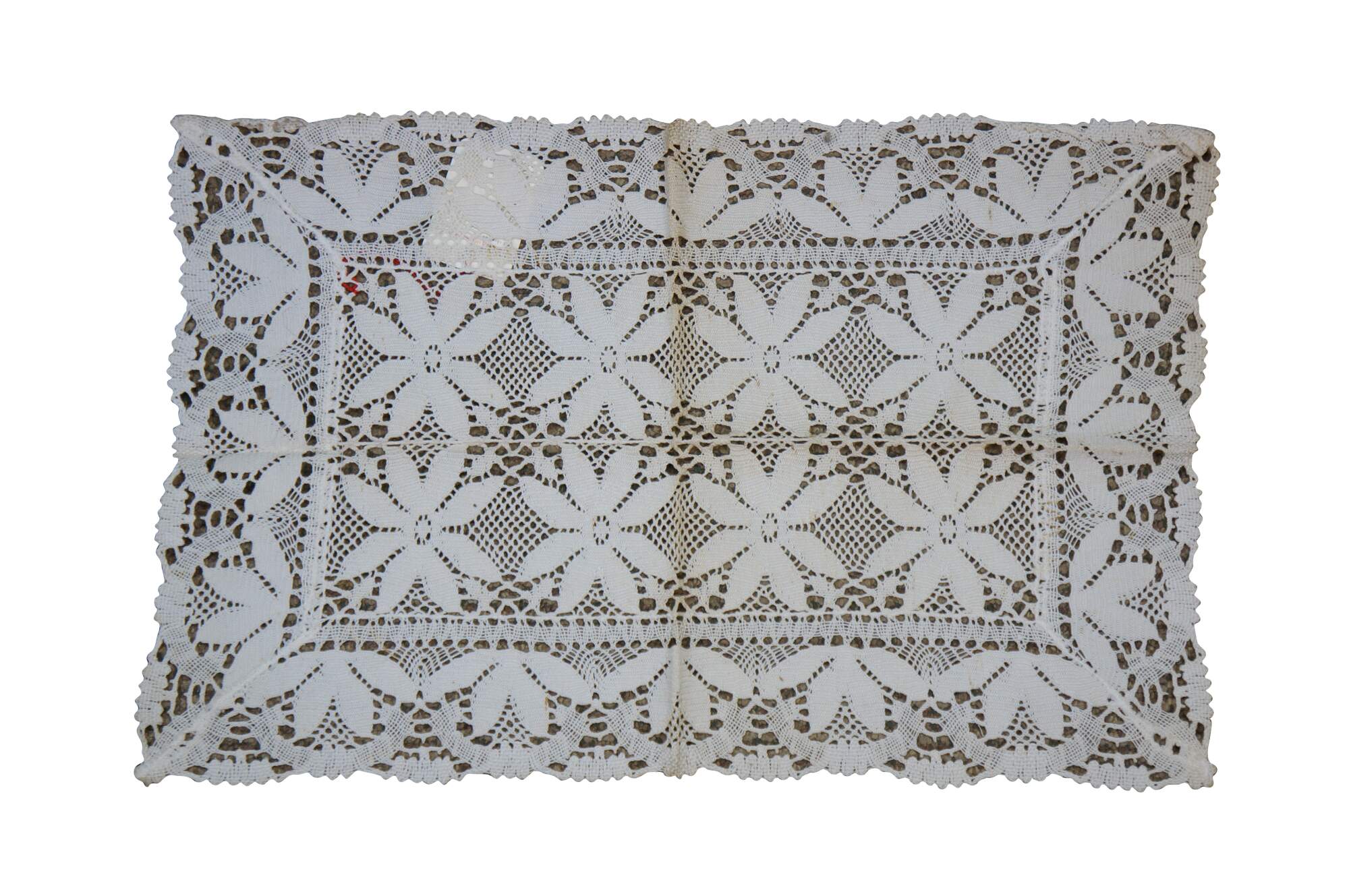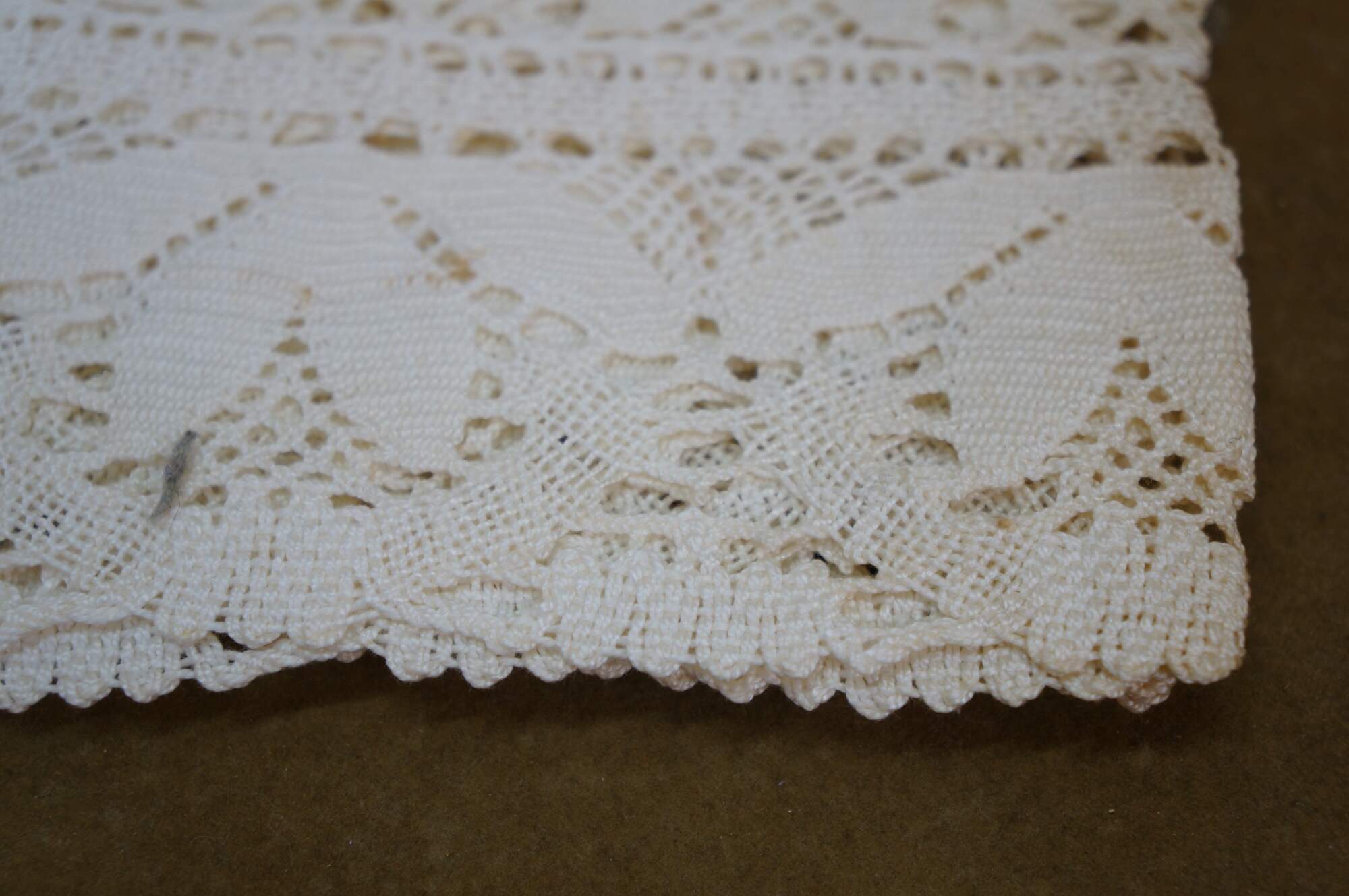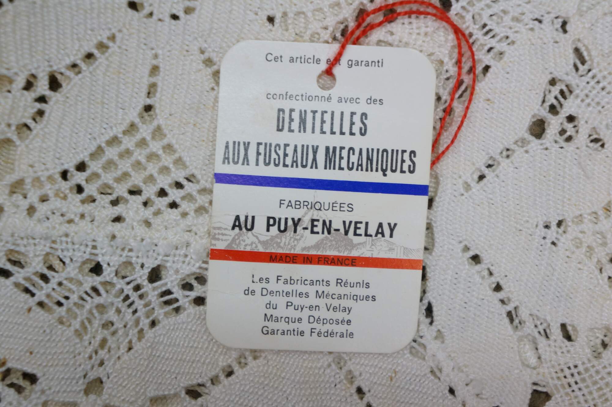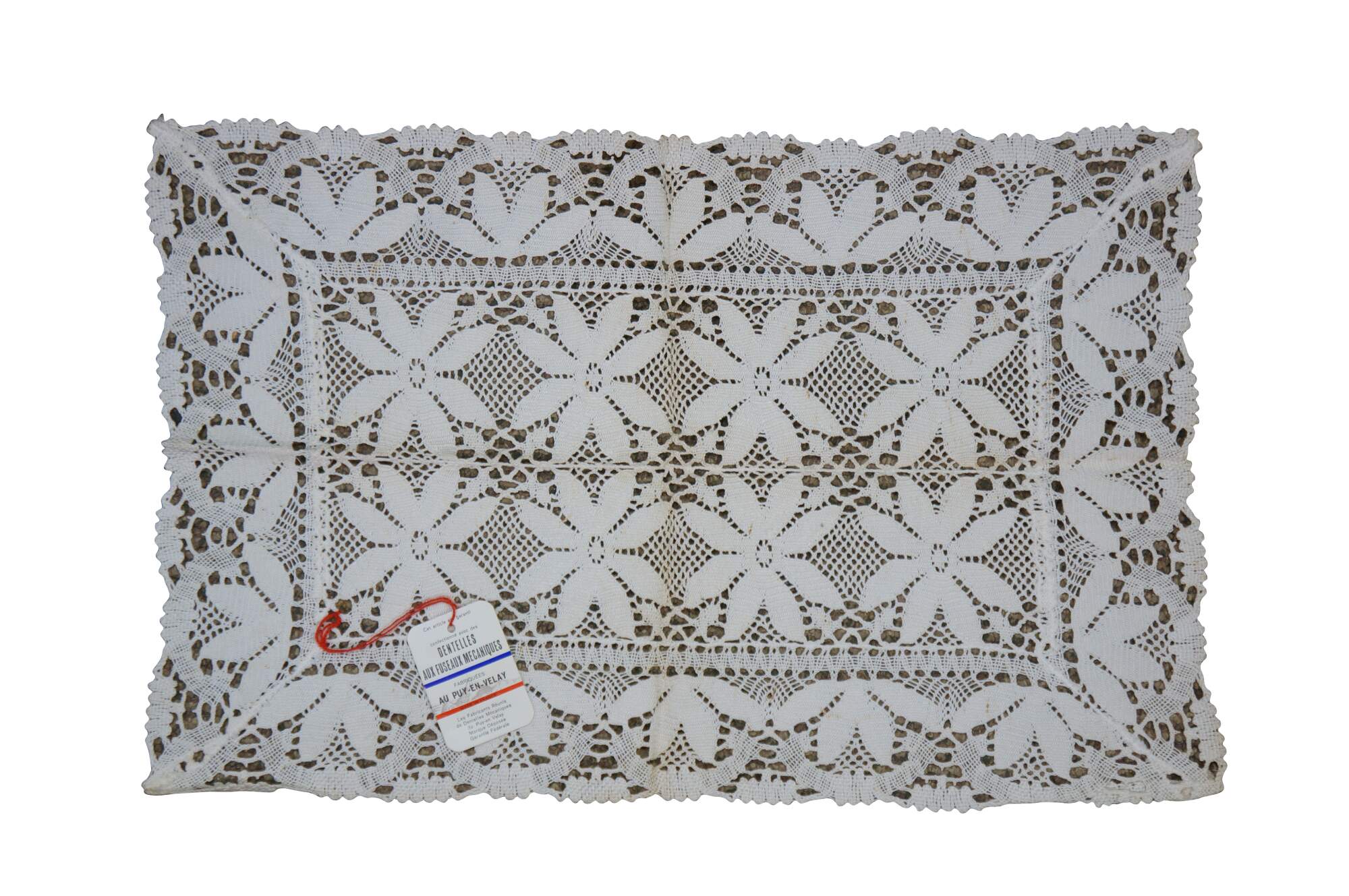 Vintage white Bobbin lace crochet doily place mat / table cloth featuring rectangular form with scalloped floral design. Made in Puy En Velay, France.