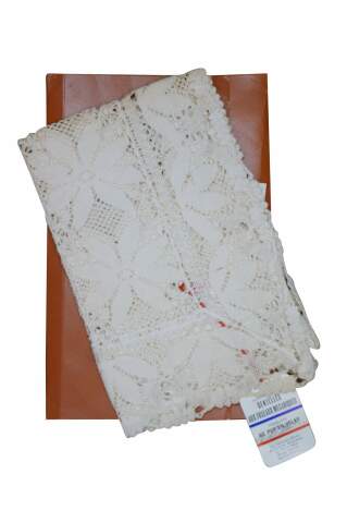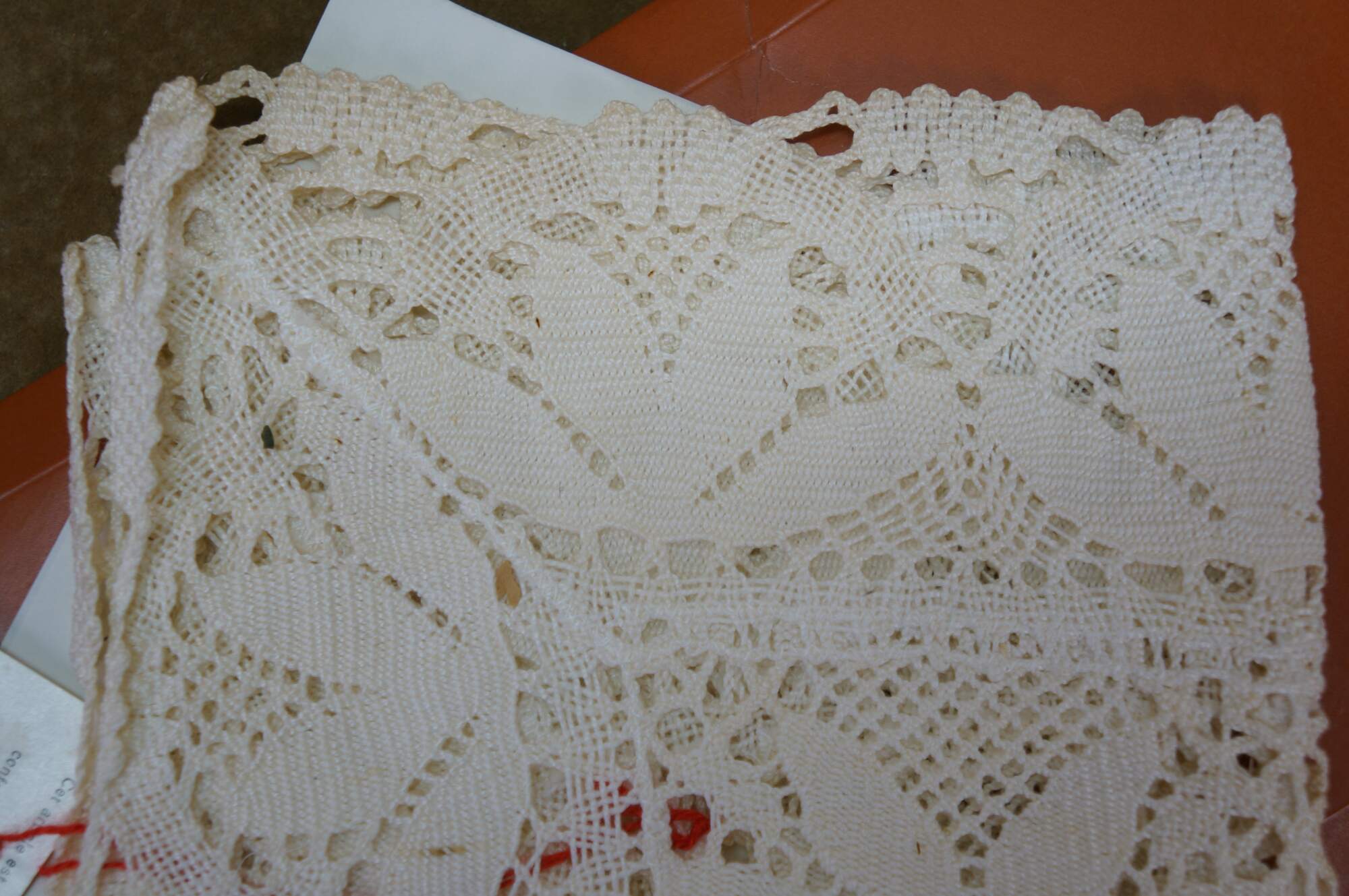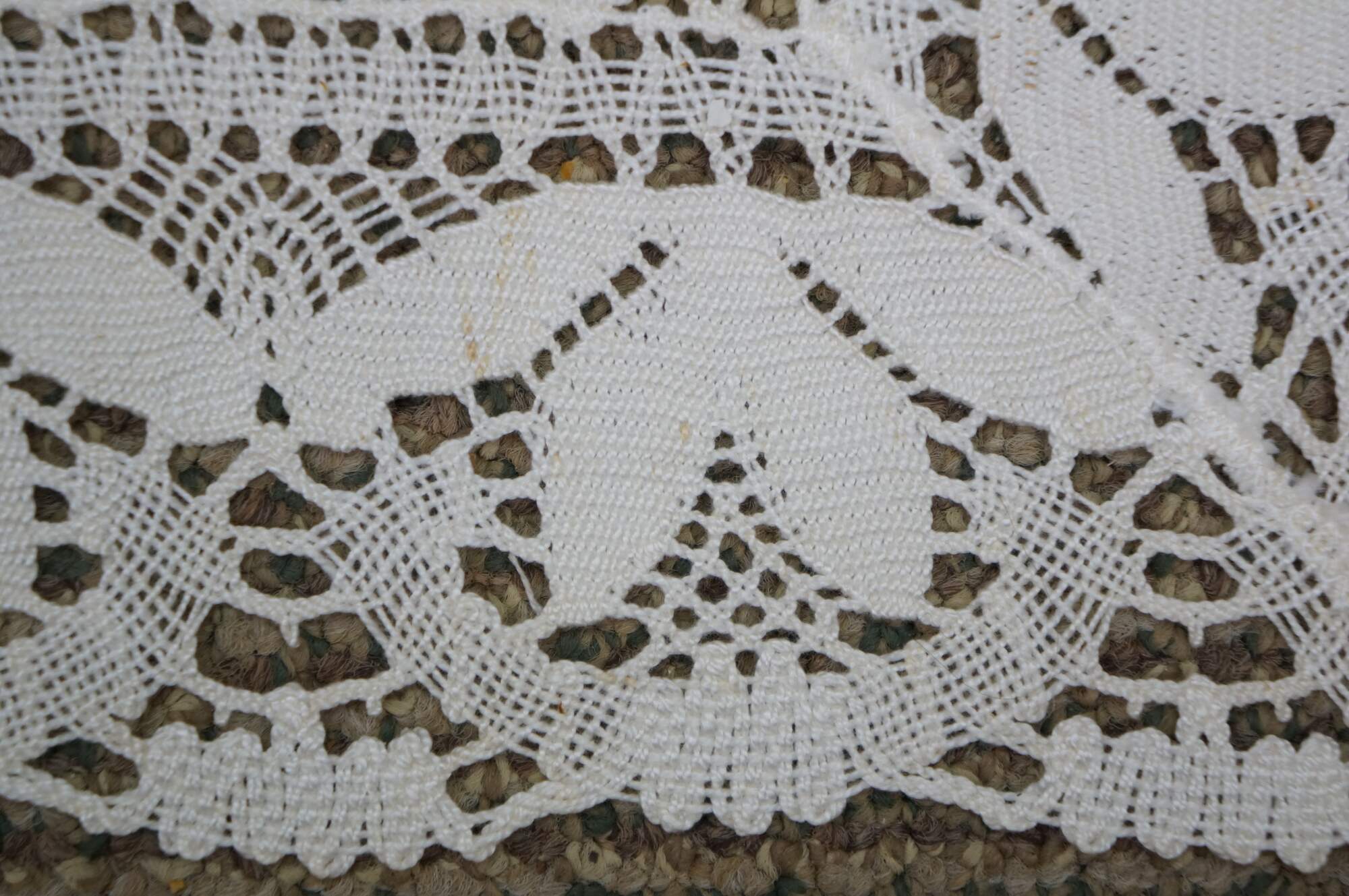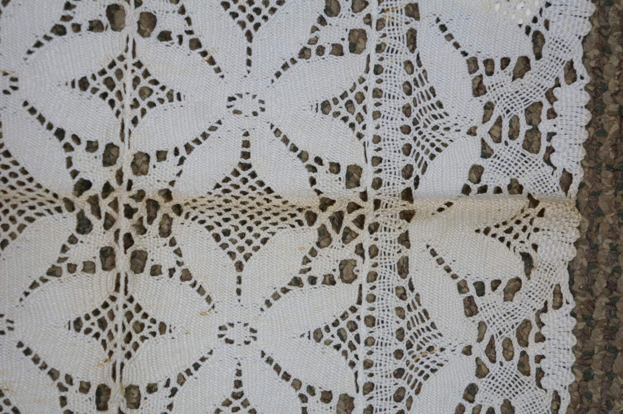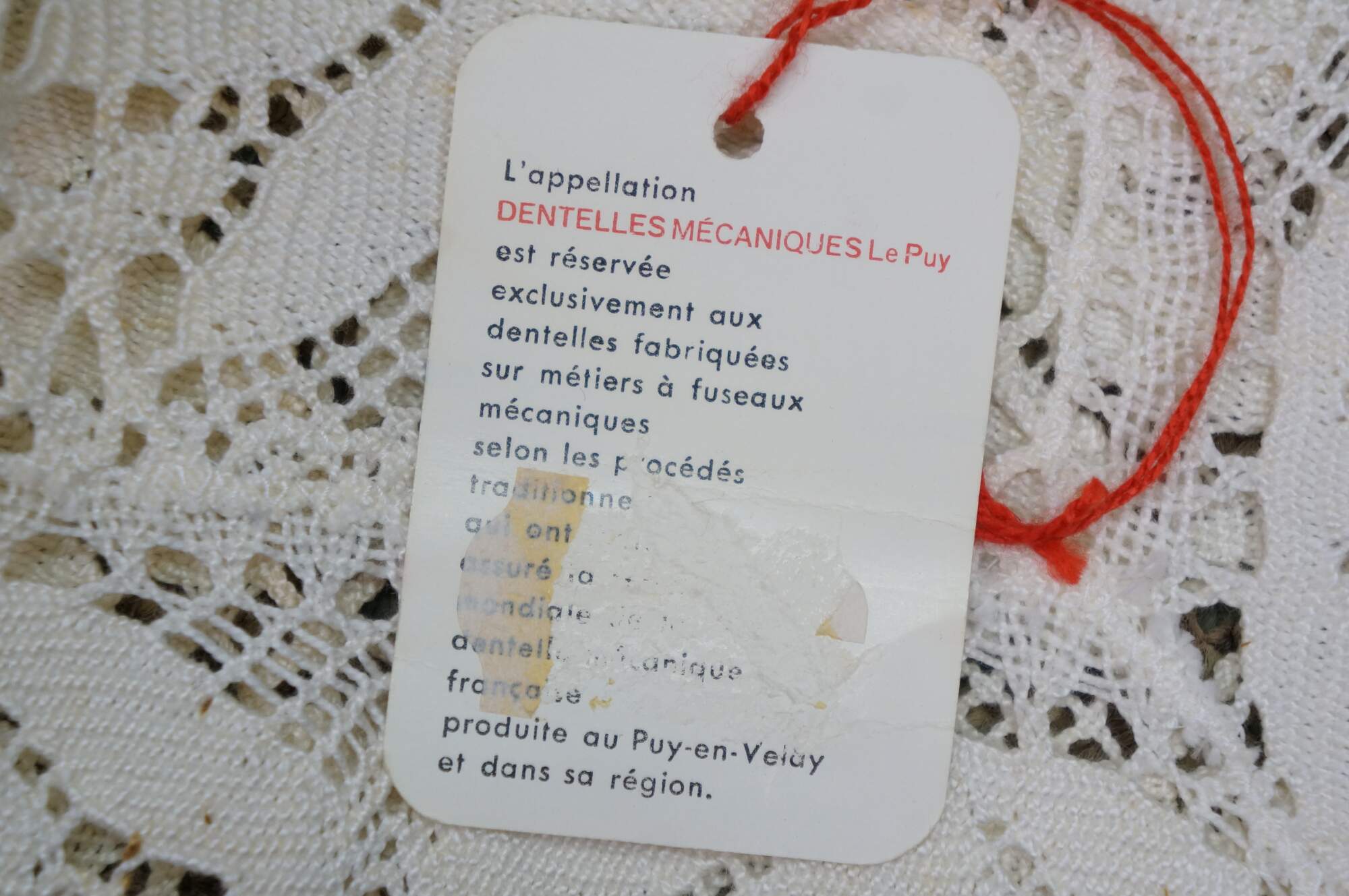 Vintage white Bobbin lace crochet doily place mat / table cloth featuring rectangular form with scalloped floral design. Made in Puy En Velay, France.