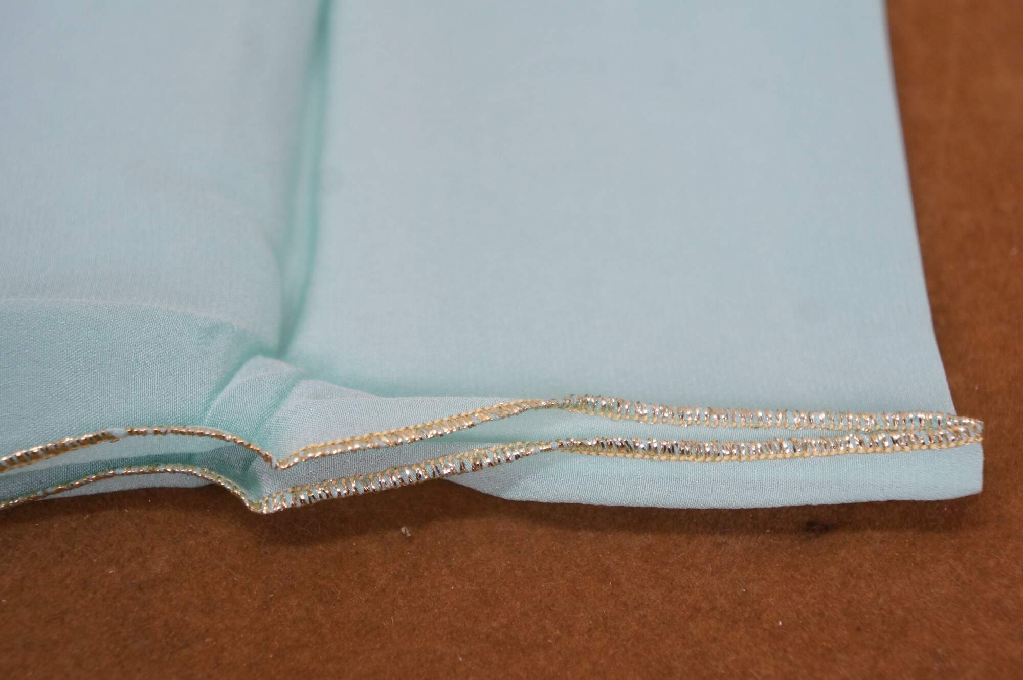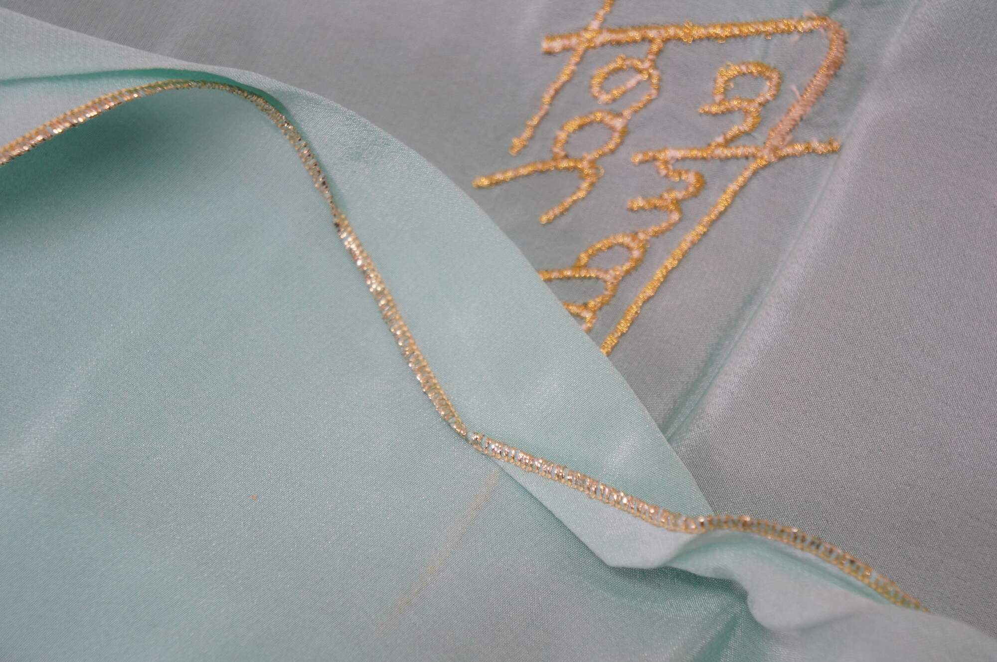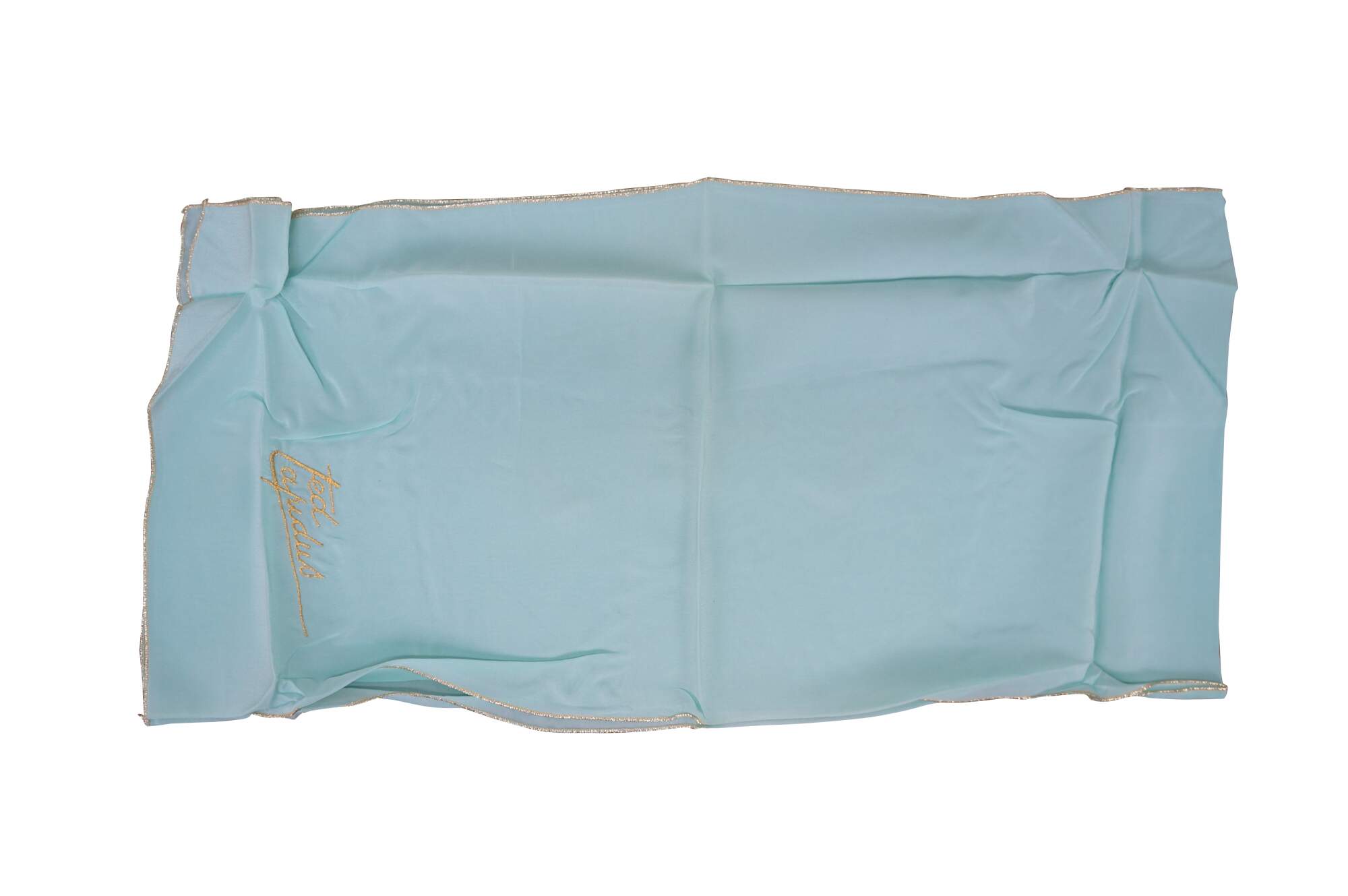 Vintage Ted Lepidus silk turquoise gold stitch scarf with name in cursive script and original packaging.