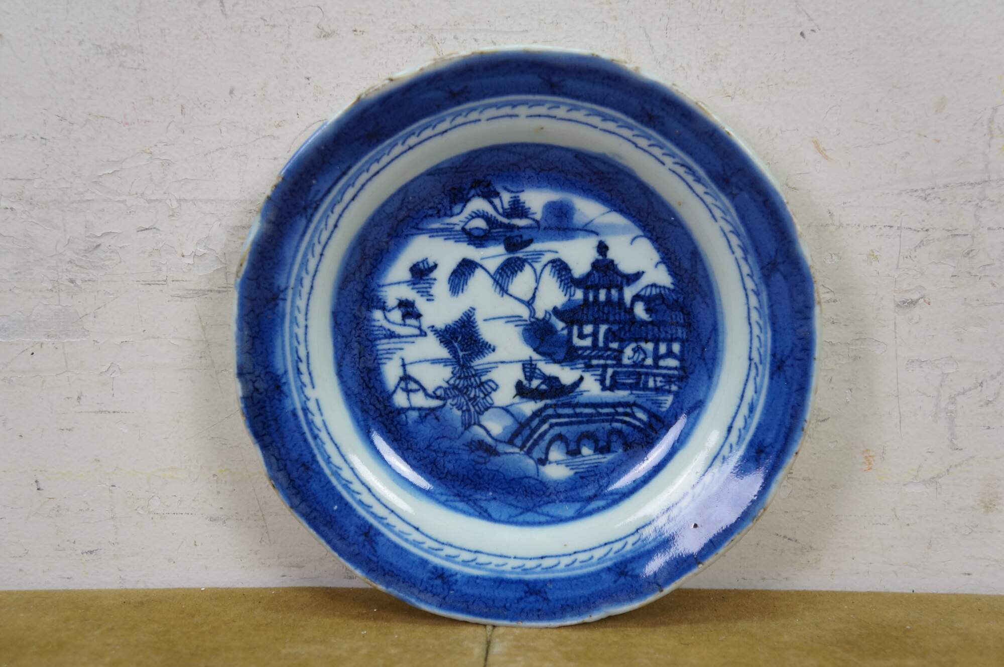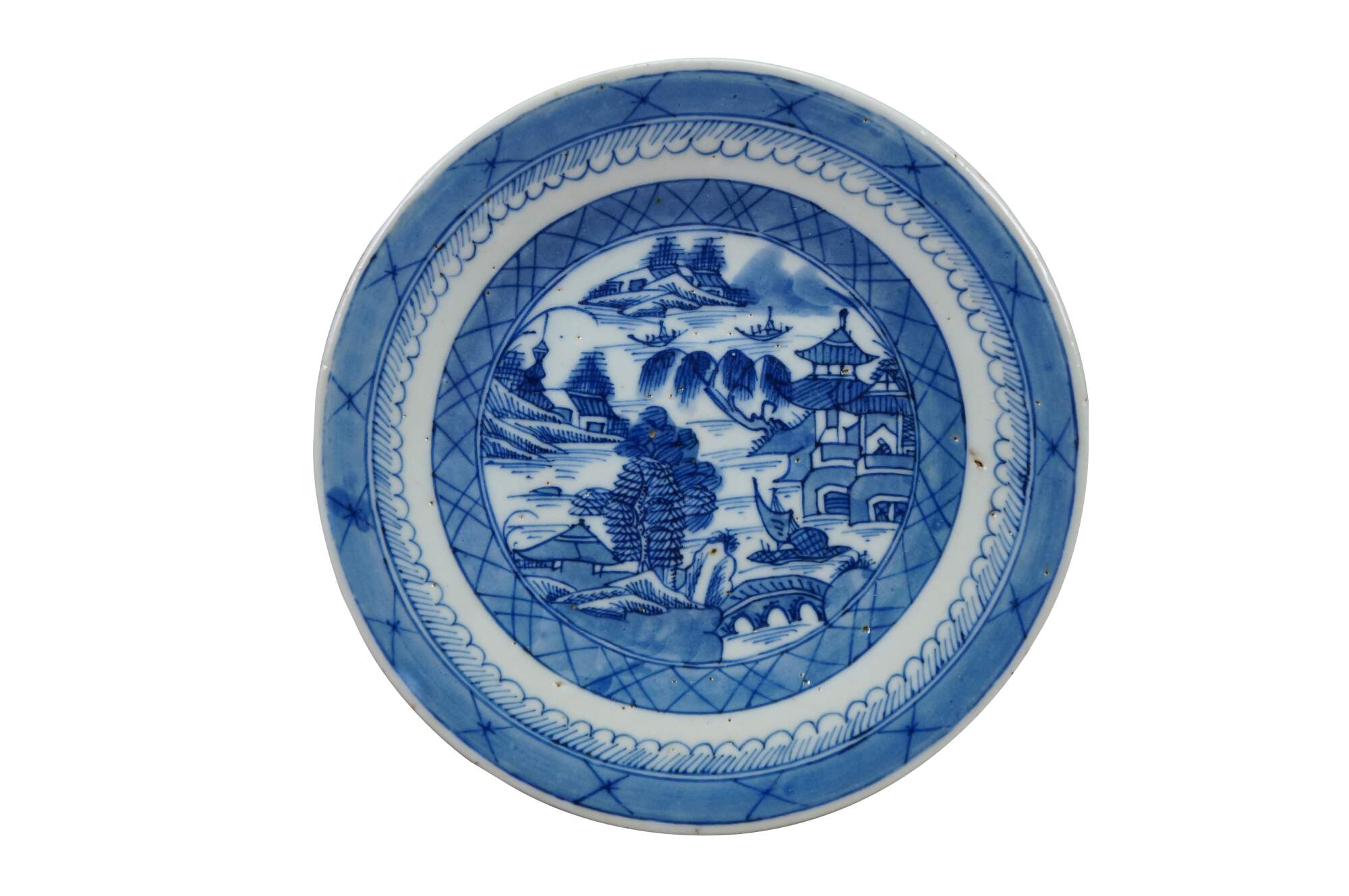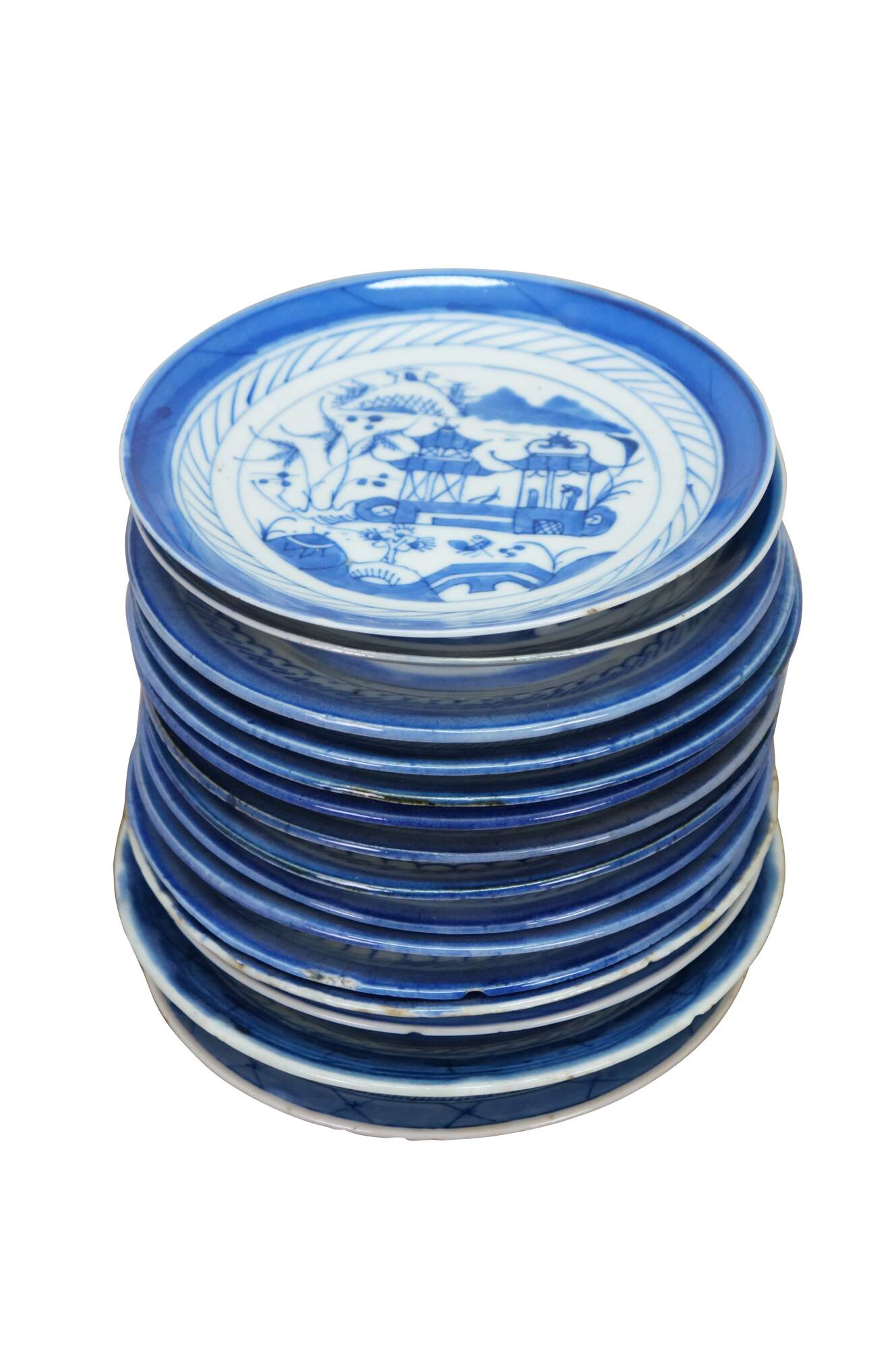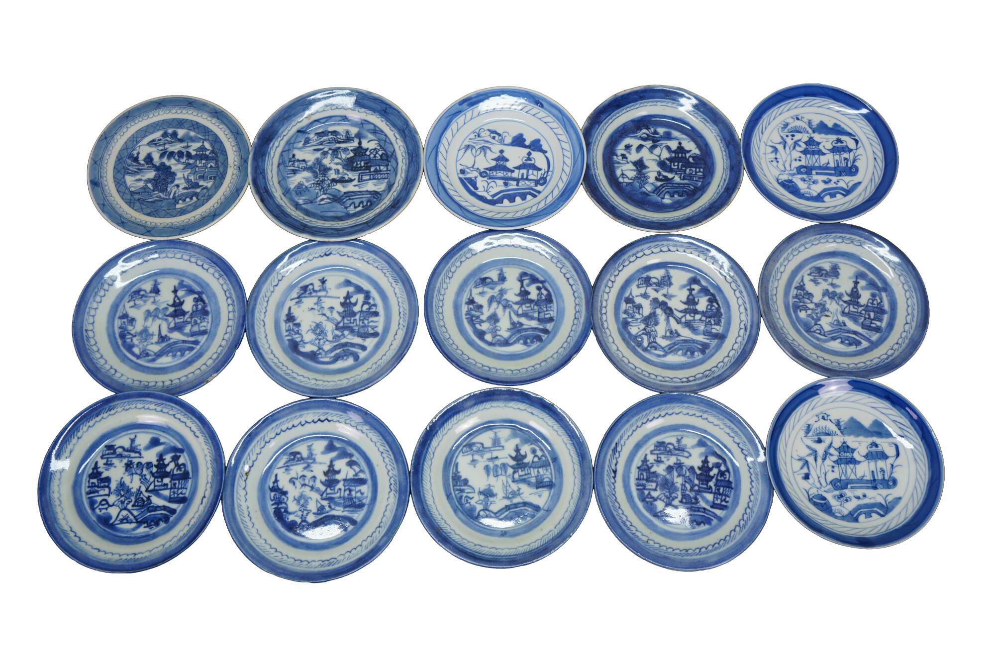 Fifteen antique mid to early 19th century Chinese Canton blue and white porcelain bread and butter or dessert plates. Produced in Guangzhou (historically known as Canton), specifically for export to western markets.� Features a central medallion depicting a Chinese garden scene with pagodas, bridges, boats, mountains and willow trees surrounded by a characteristic lattice / criss-cross border.