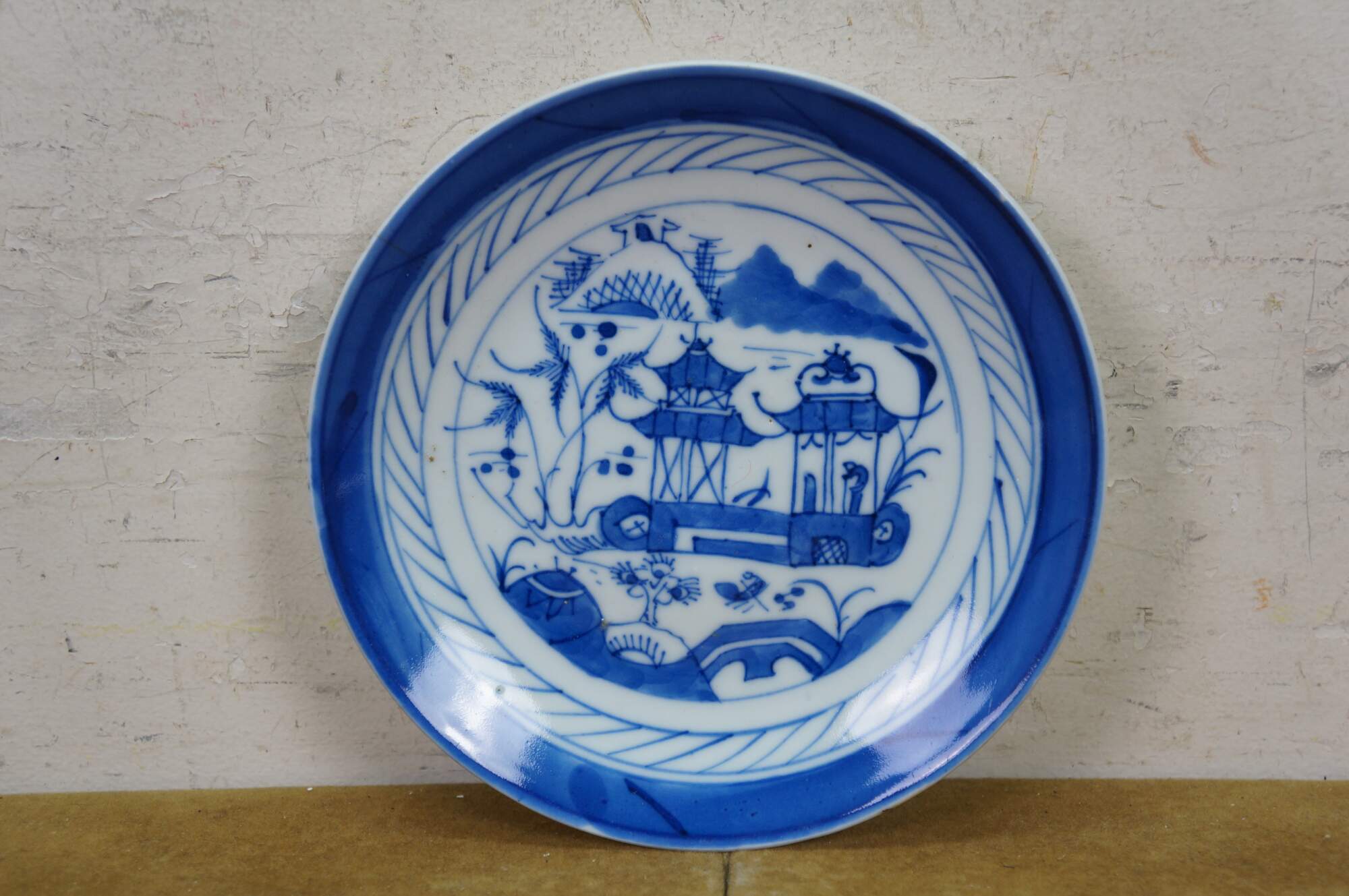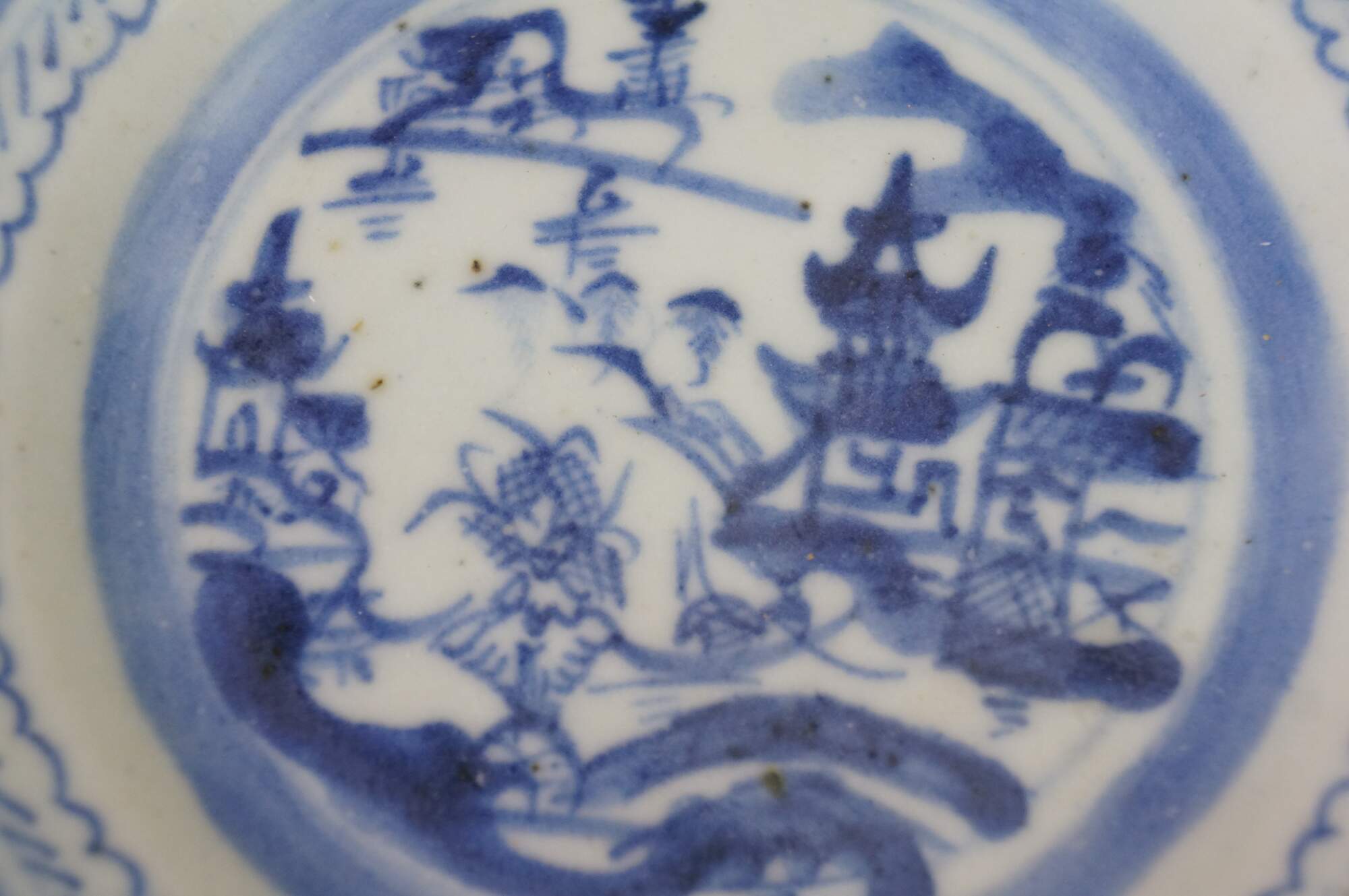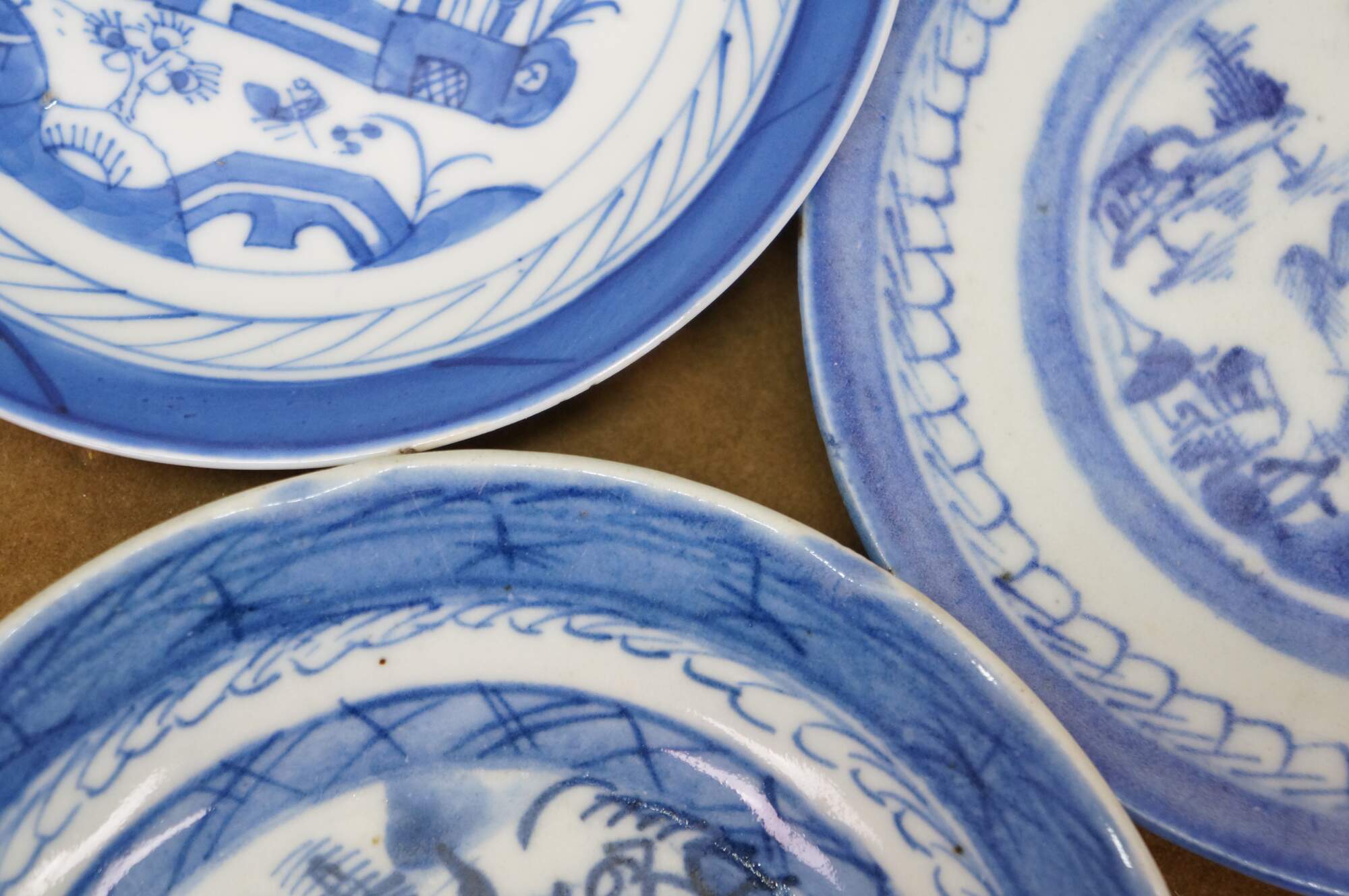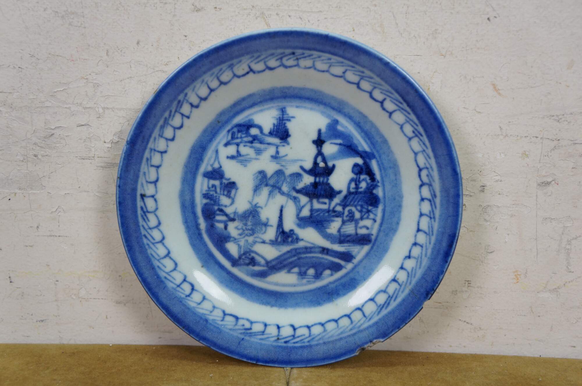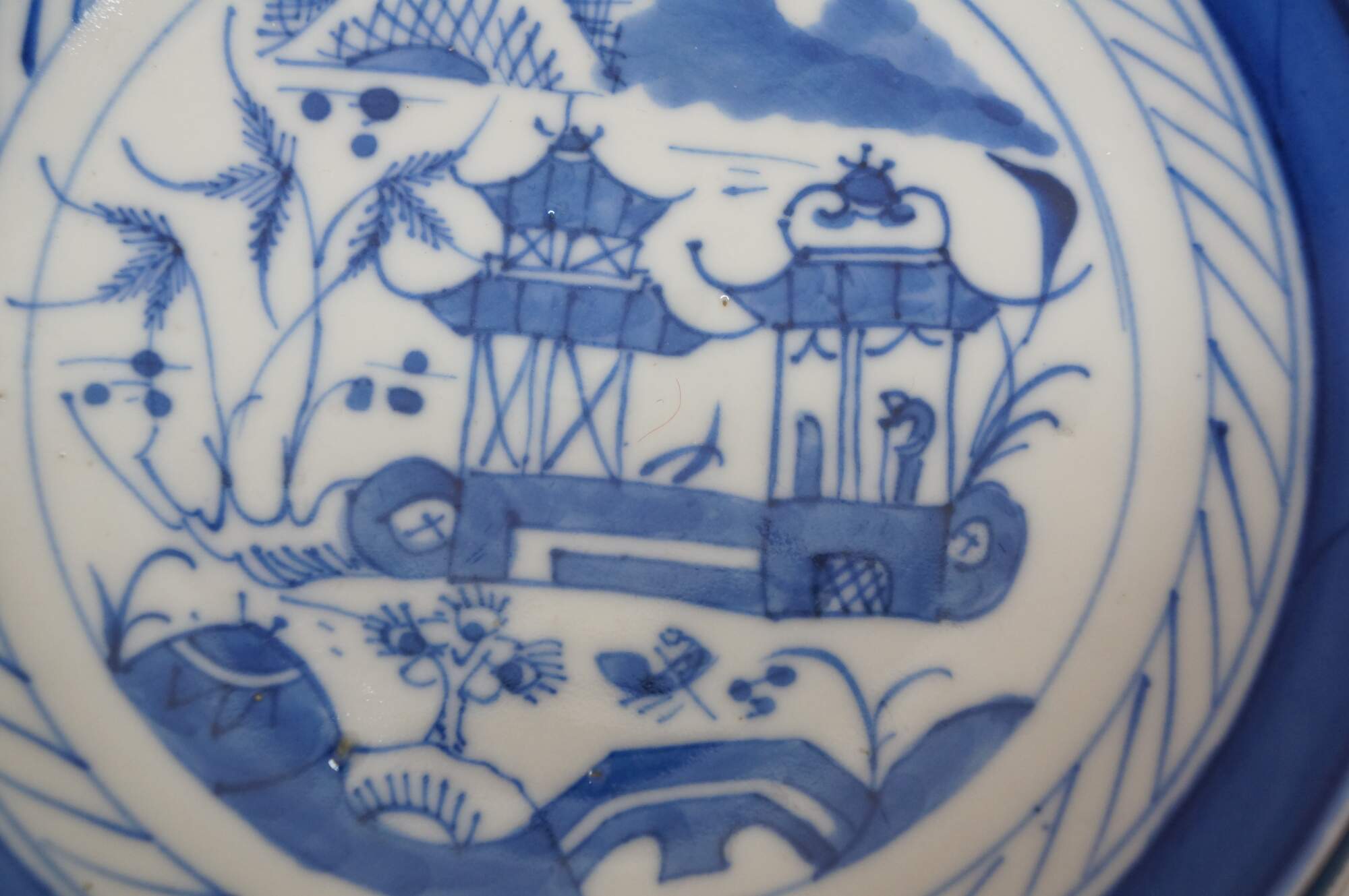 Fifteen antique mid to early 19th century Chinese Canton blue and white porcelain bread and butter or dessert plates. Produced in Guangzhou (historically known as Canton), specifically for export to western markets.� Features a central medallion depicting a Chinese garden scene with pagodas, bridges, boats, mountains and willow trees surrounded by a characteristic lattice / criss-cross border.