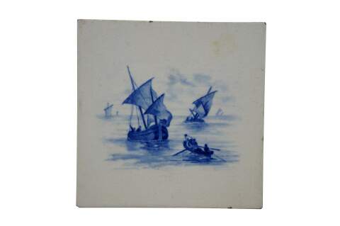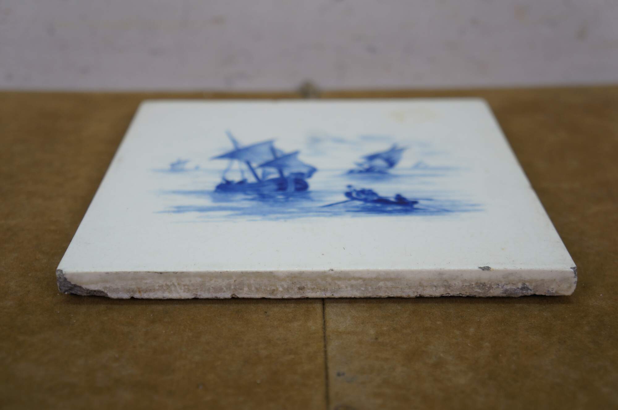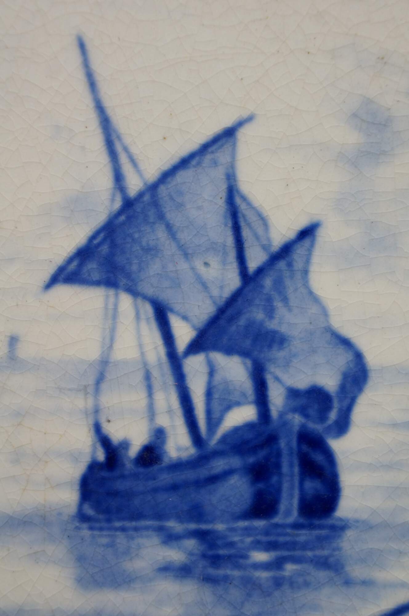 Antique 18th century Dutch Delft cobalt blue ceramic tile featuring a maritime scene with ships / boats / sailboats.� Origin: Netherlands.