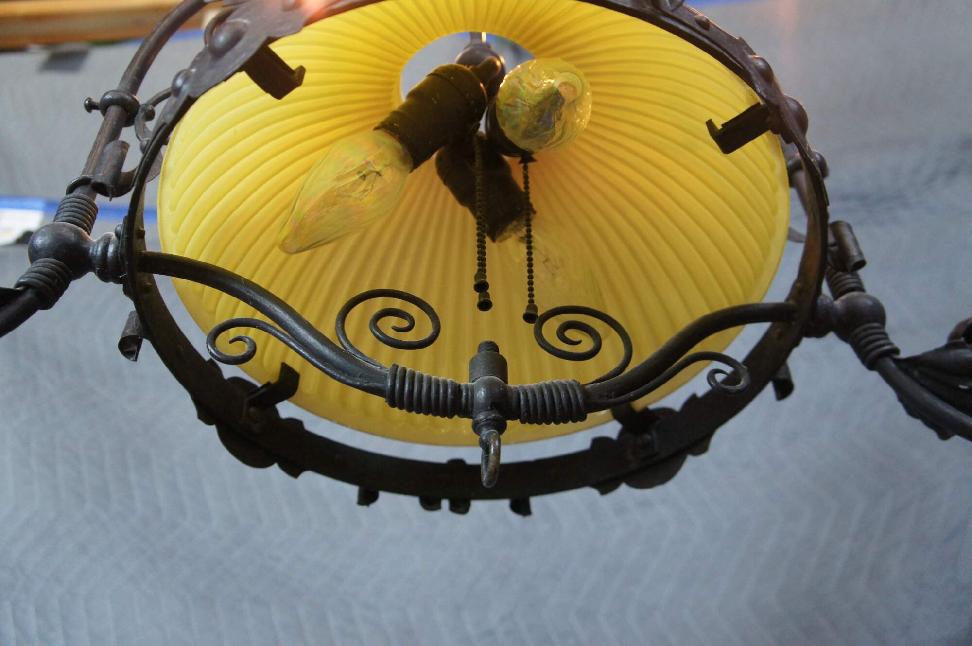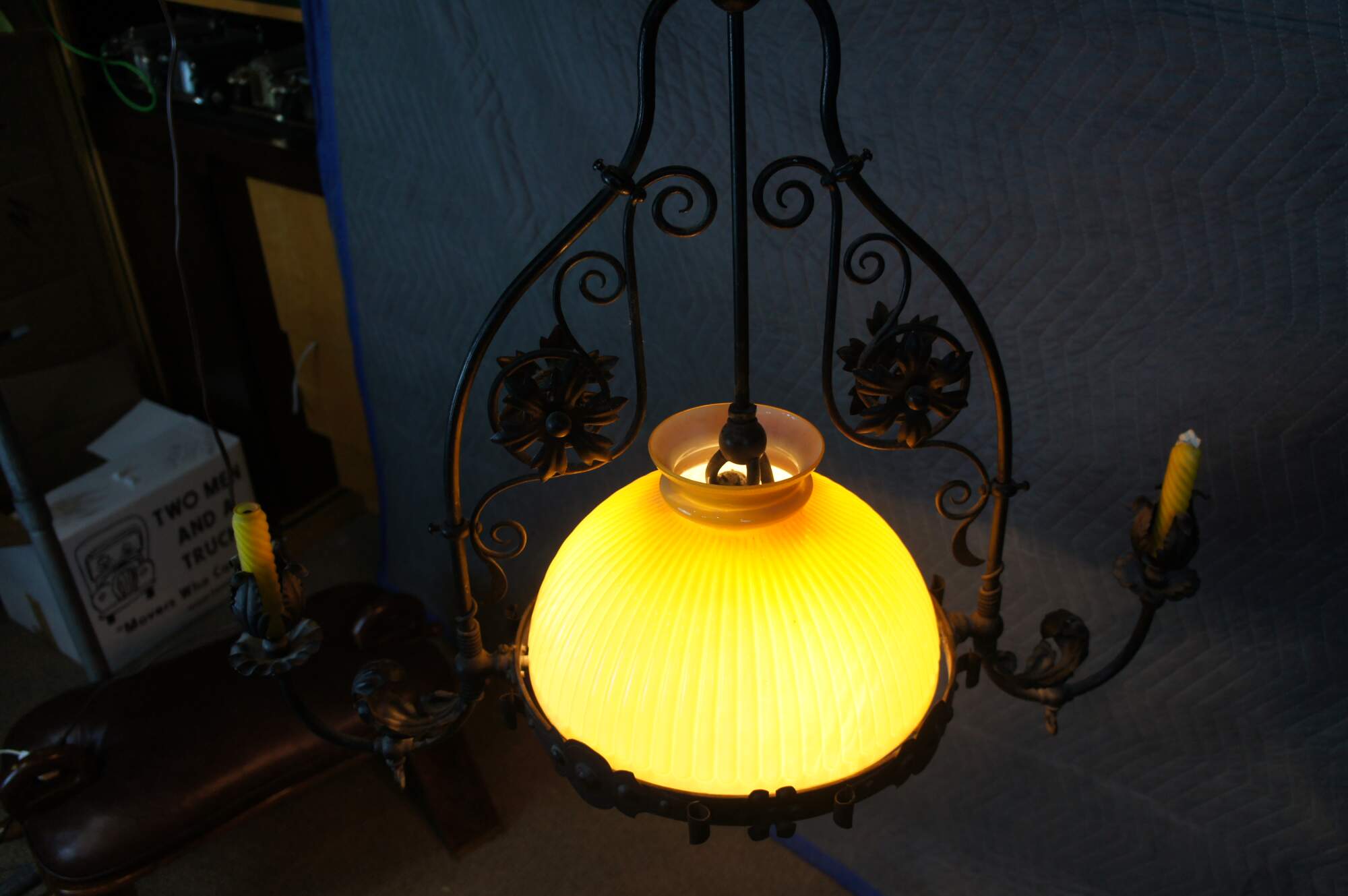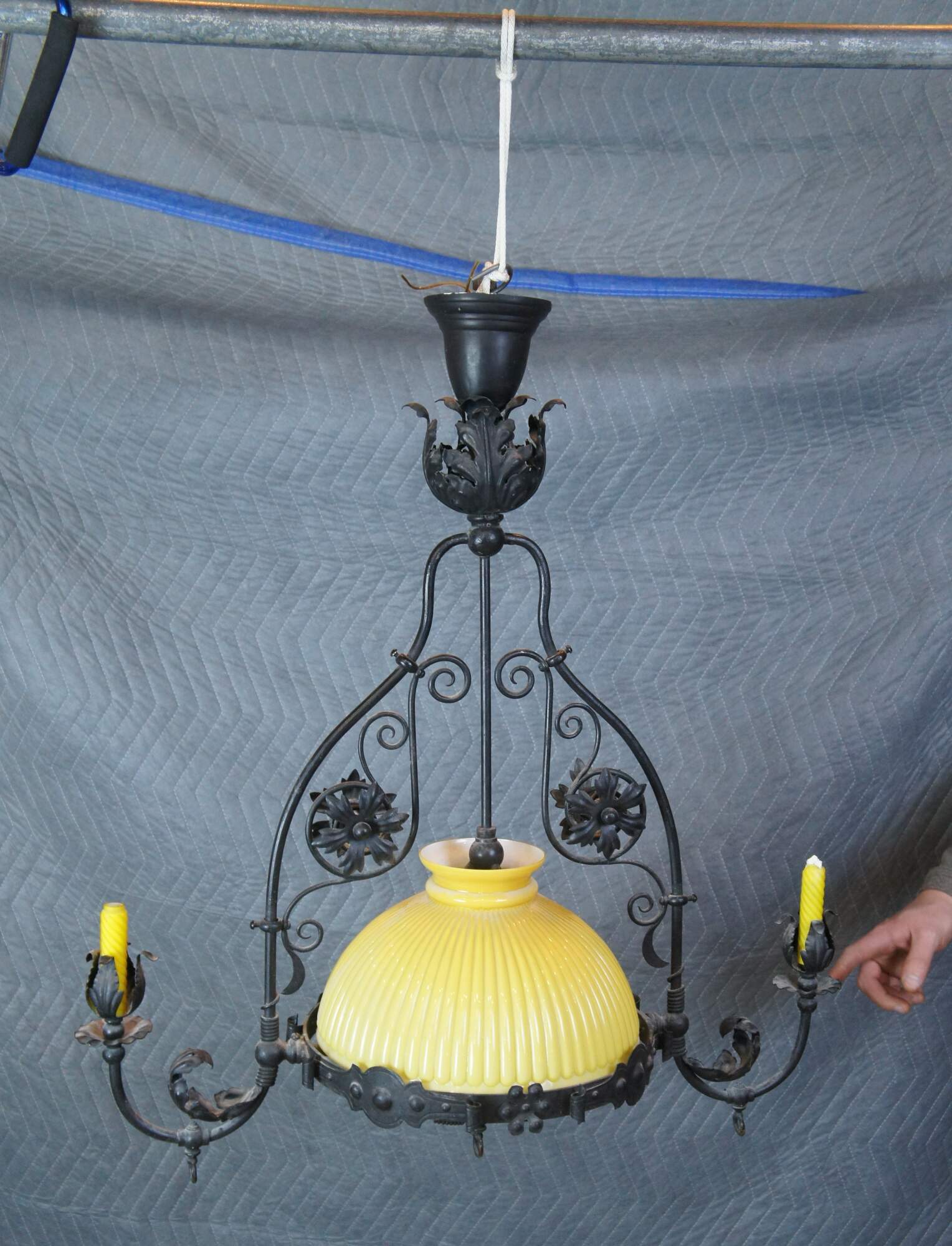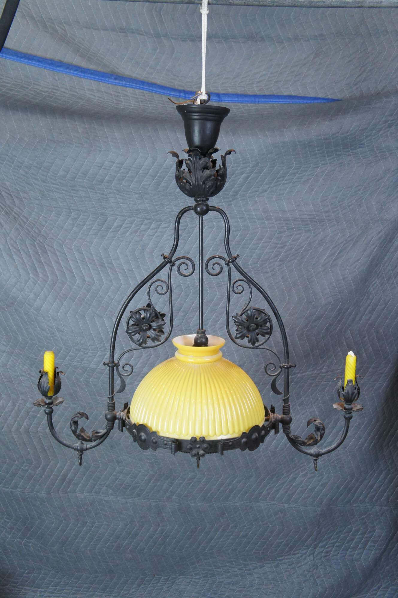 Antique Victorian converted gas 3 light parlor pendant / pool table chandelier. Made of scrolled wrought iron featuring Spanish styling with florets, acanthus leaves and yellow glass shade flanked by two candlesticks / candle holders.