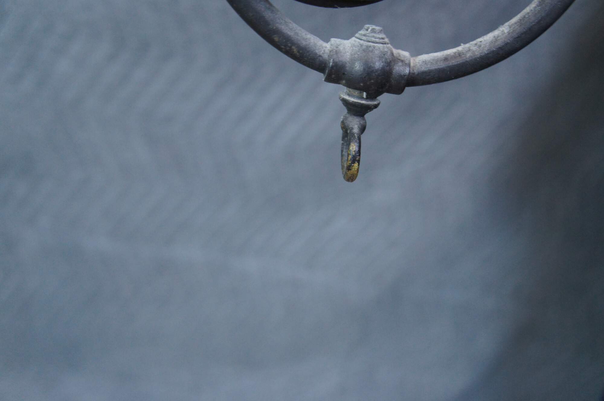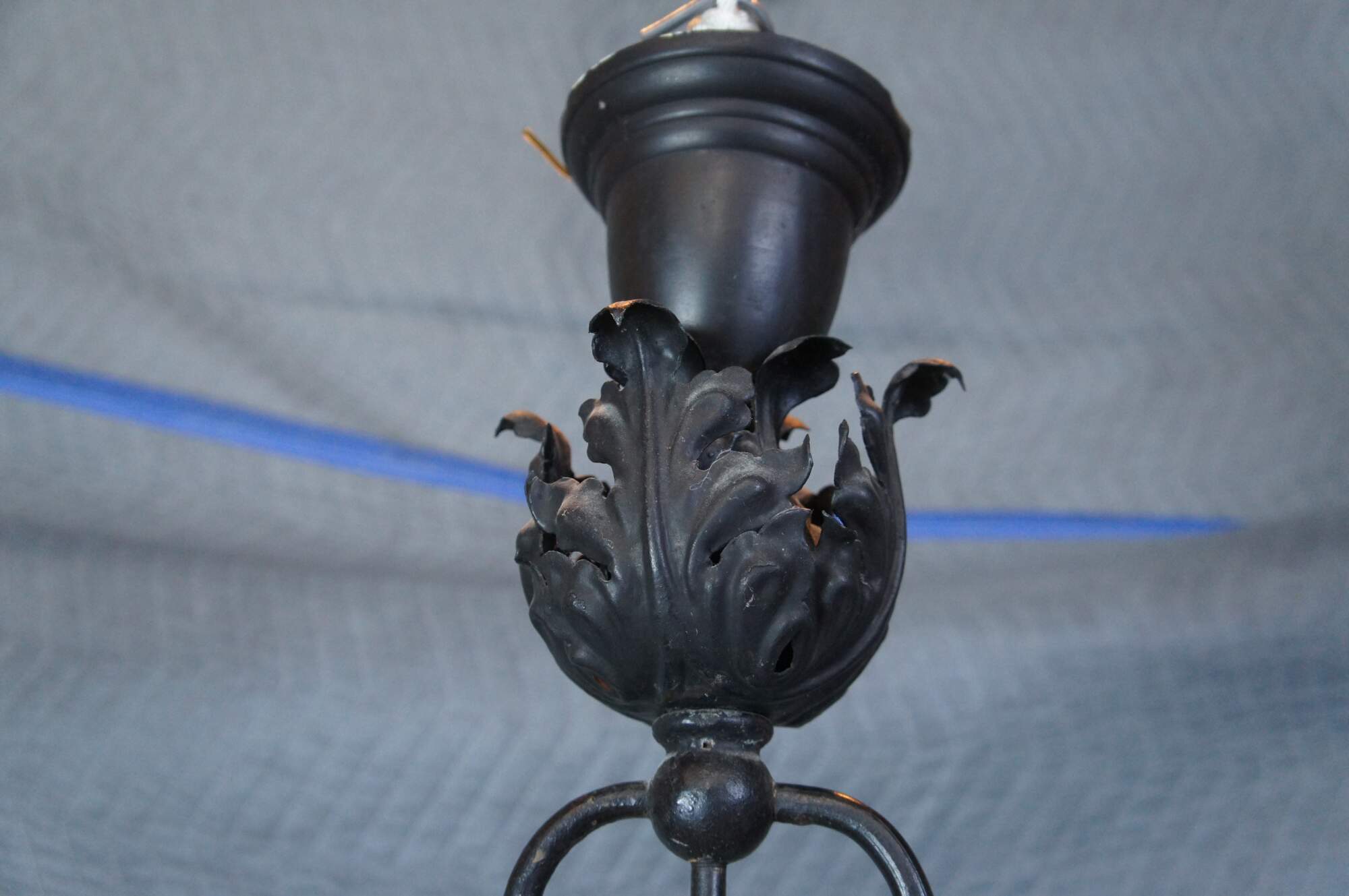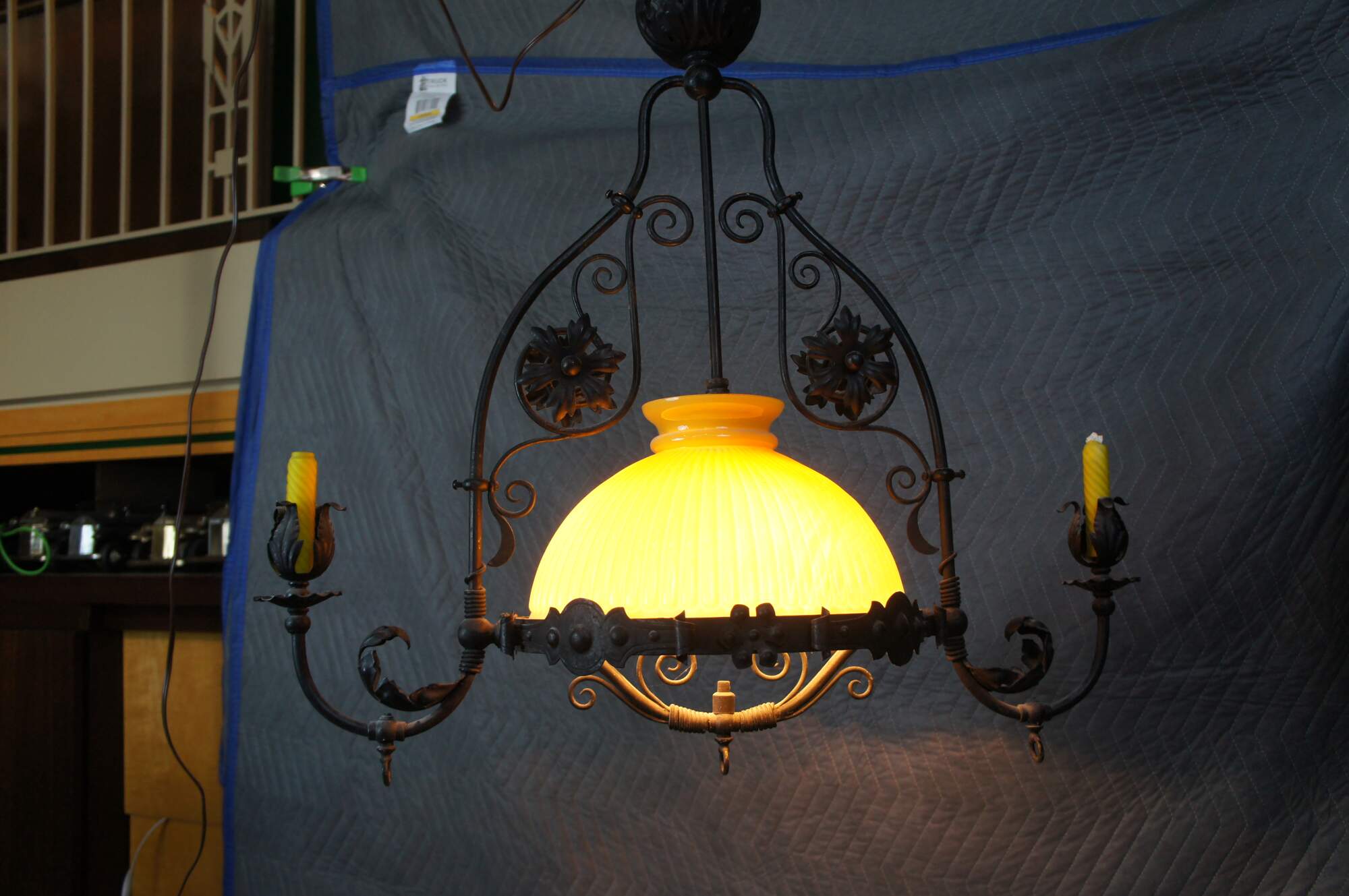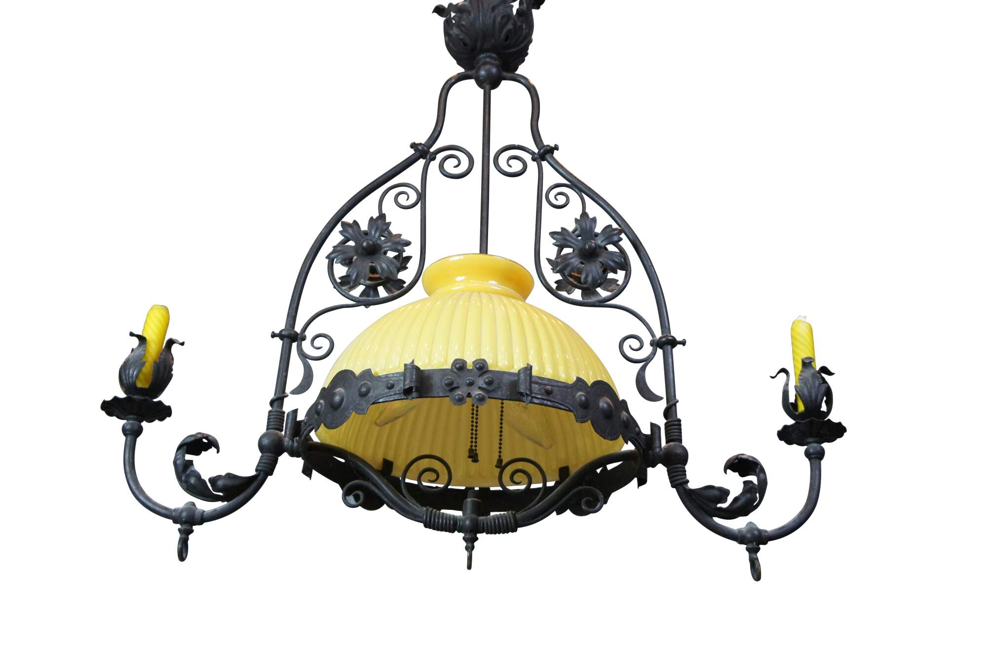 Antique Victorian converted gas 3 light parlor pendant / pool table chandelier. Made of scrolled wrought iron featuring Spanish styling with florets, acanthus leaves and yellow glass shade flanked by two candlesticks / candle holders.