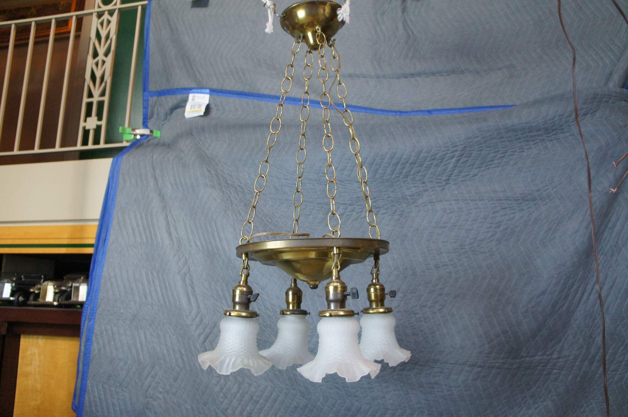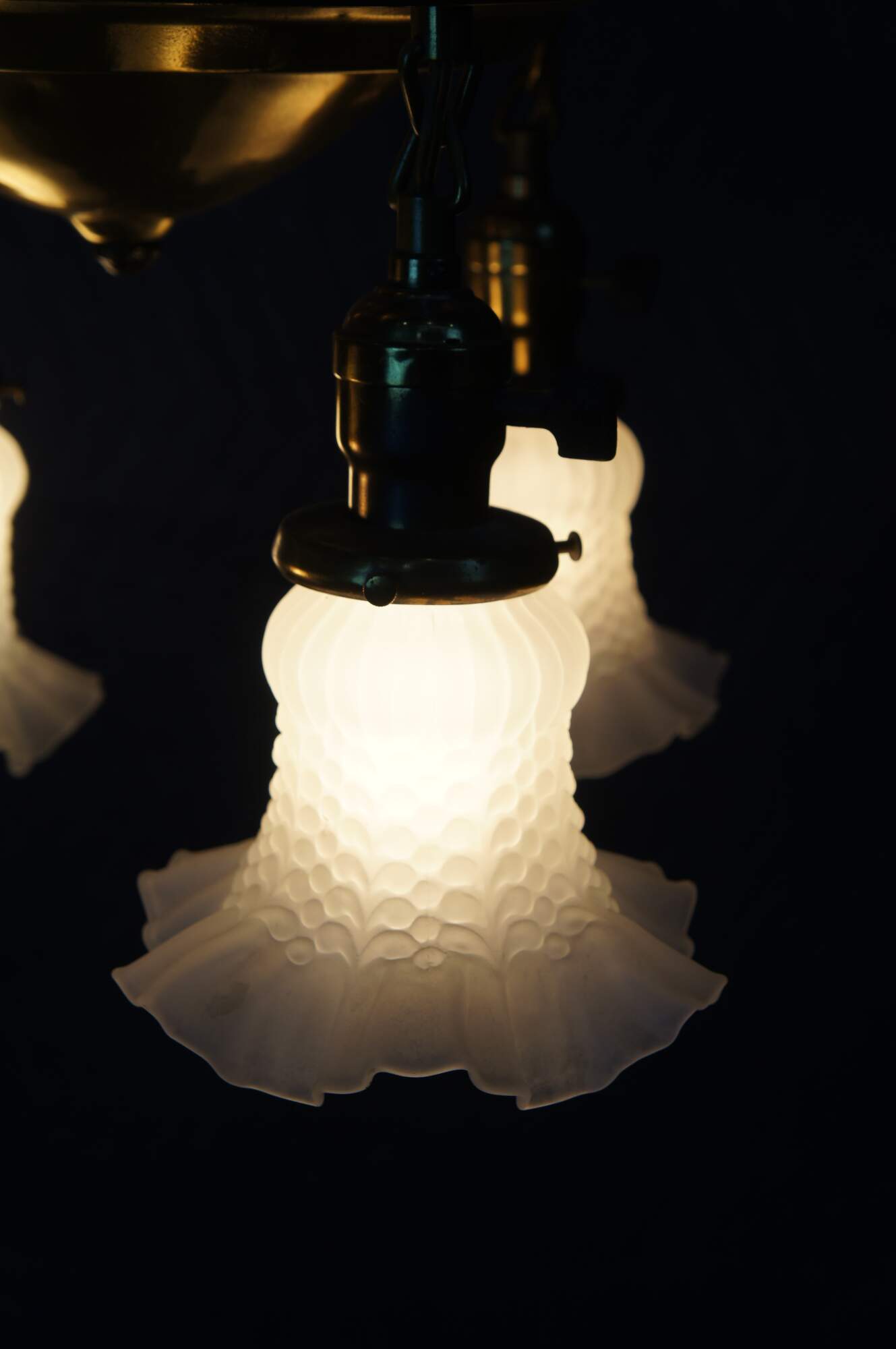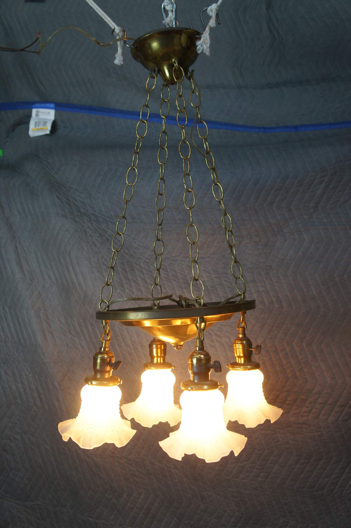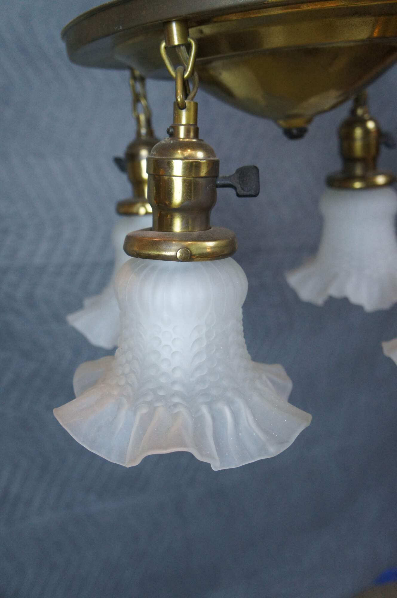 Antique drop light pendant chandelier. Made of brass featuring Victorian styling with four ruffled frosted / satin glass shades.