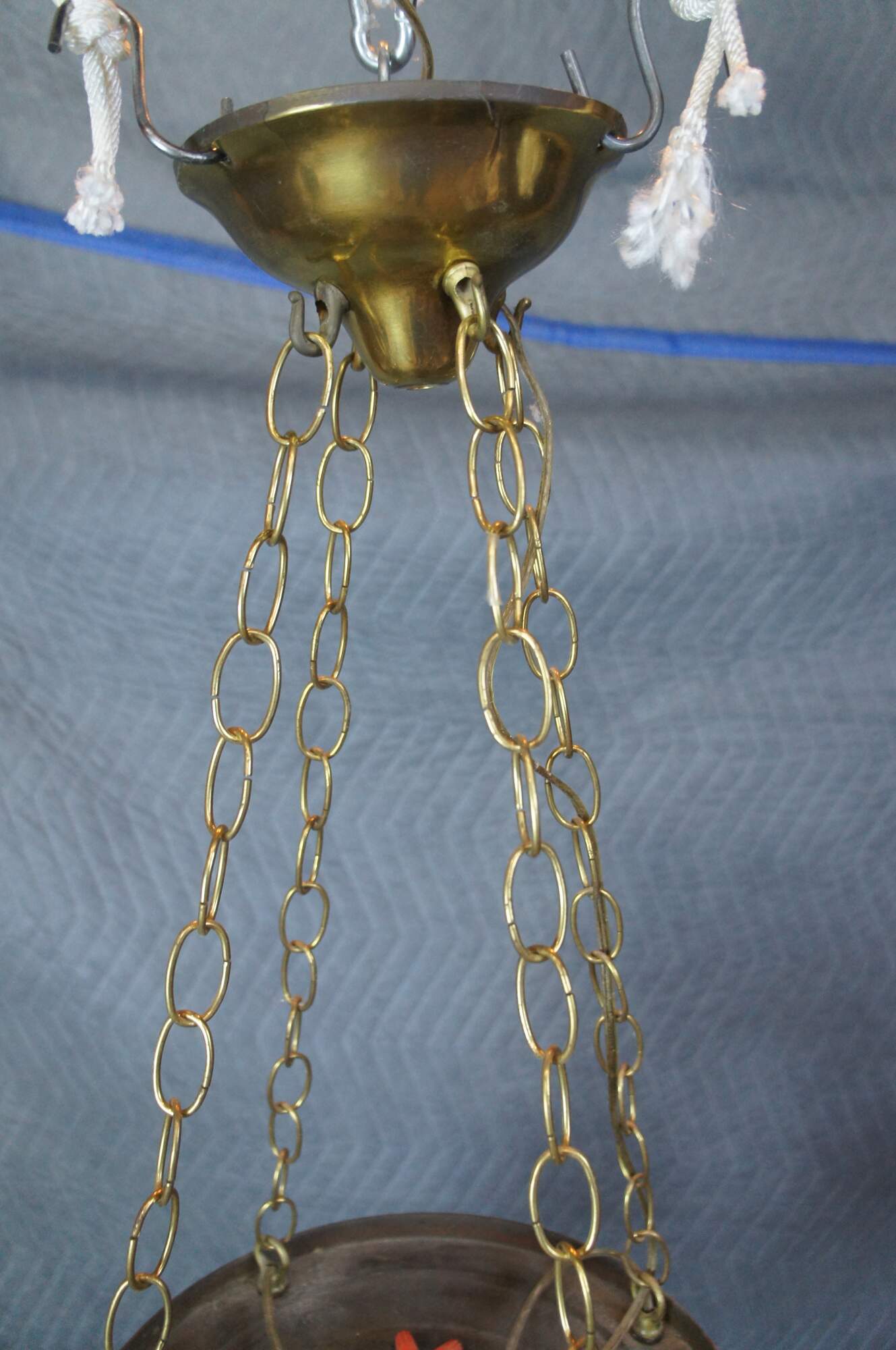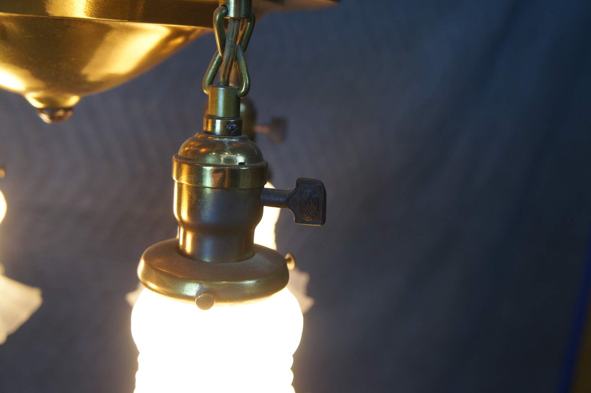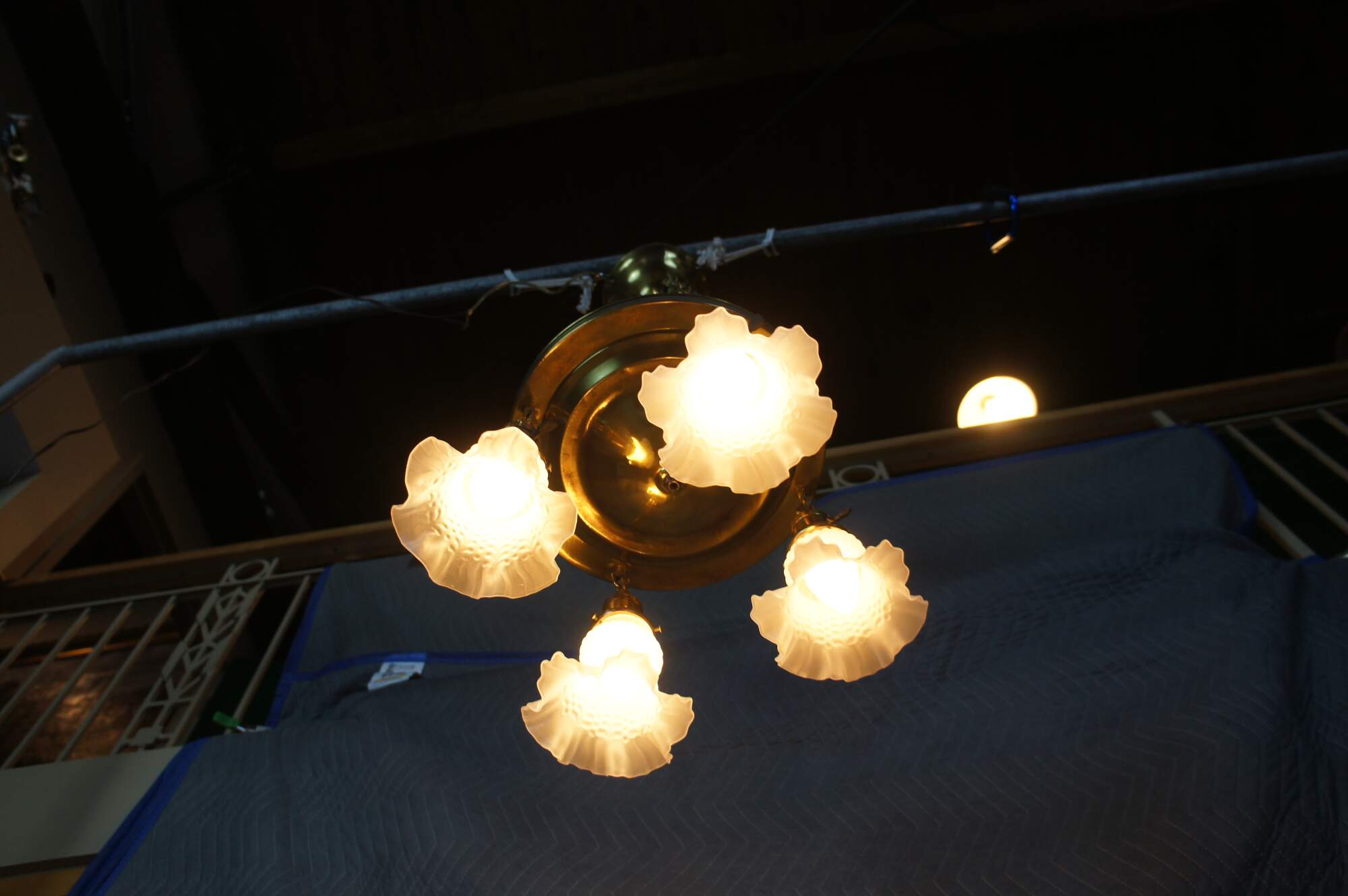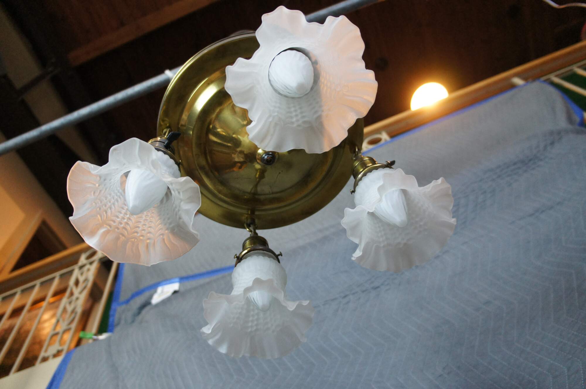 Antique drop light pendant chandelier. Made of brass featuring Victorian styling with four ruffled frosted / satin glass shades.