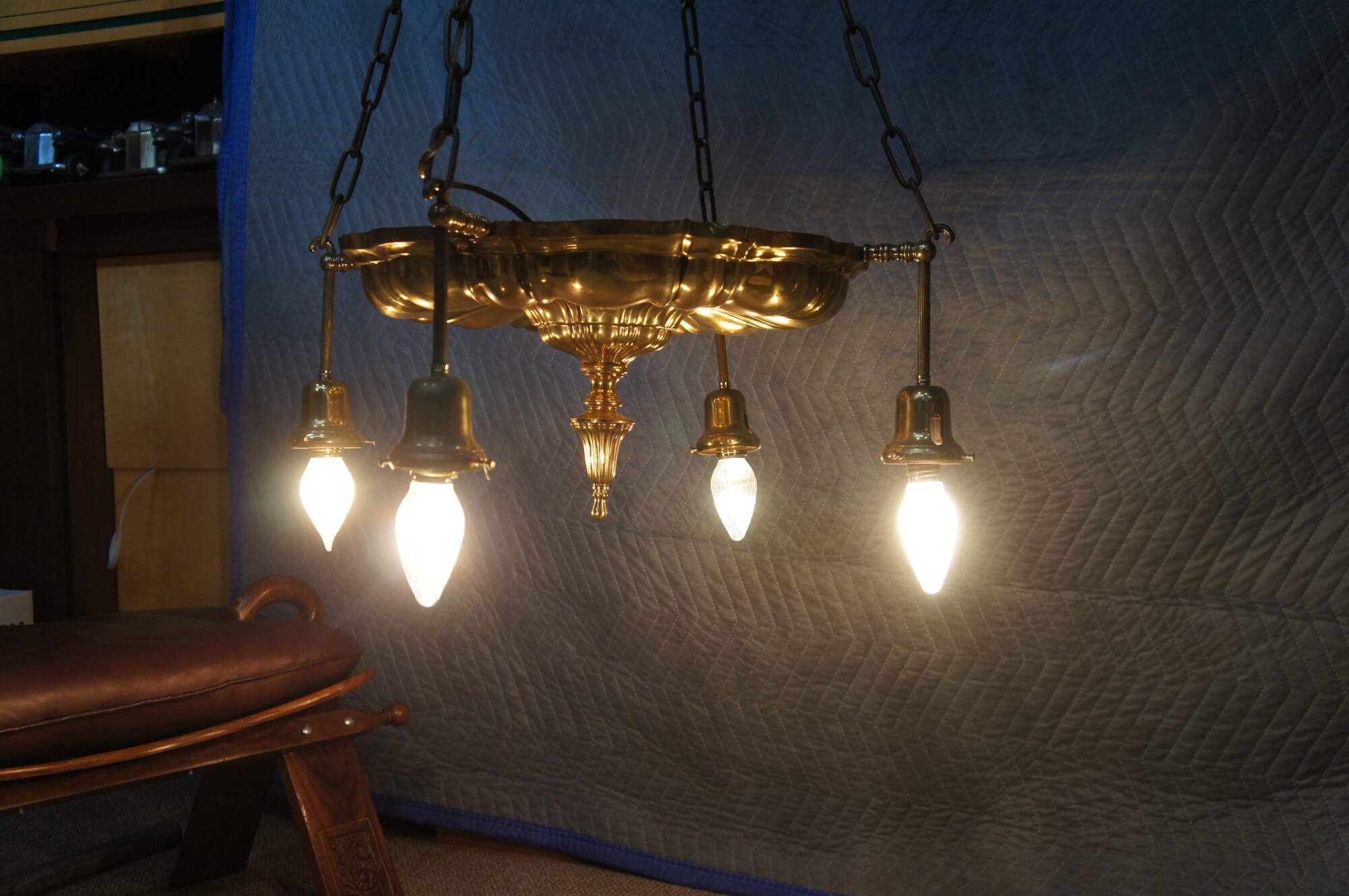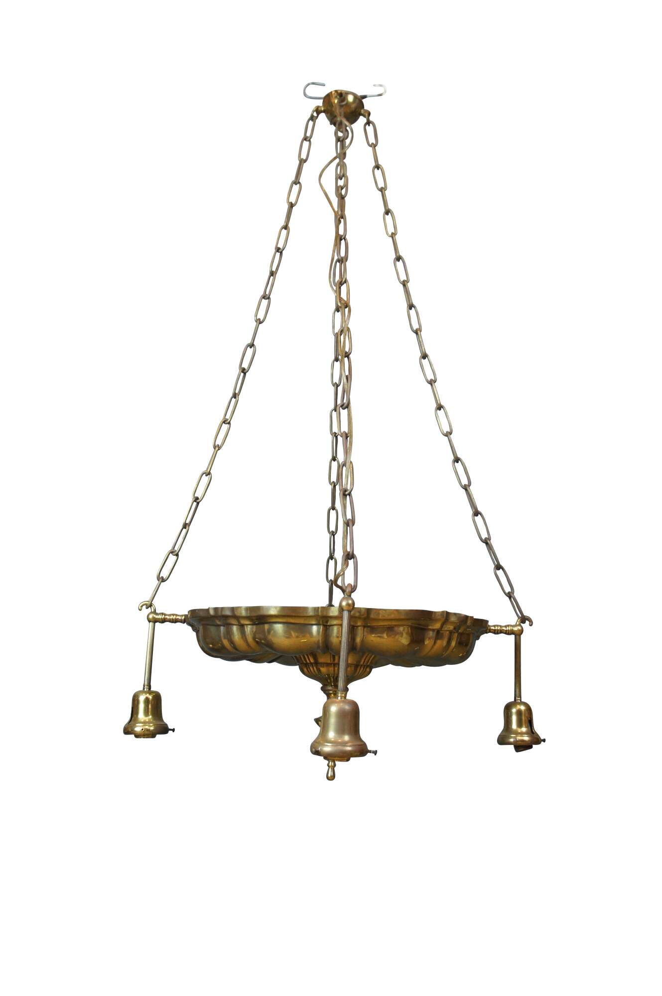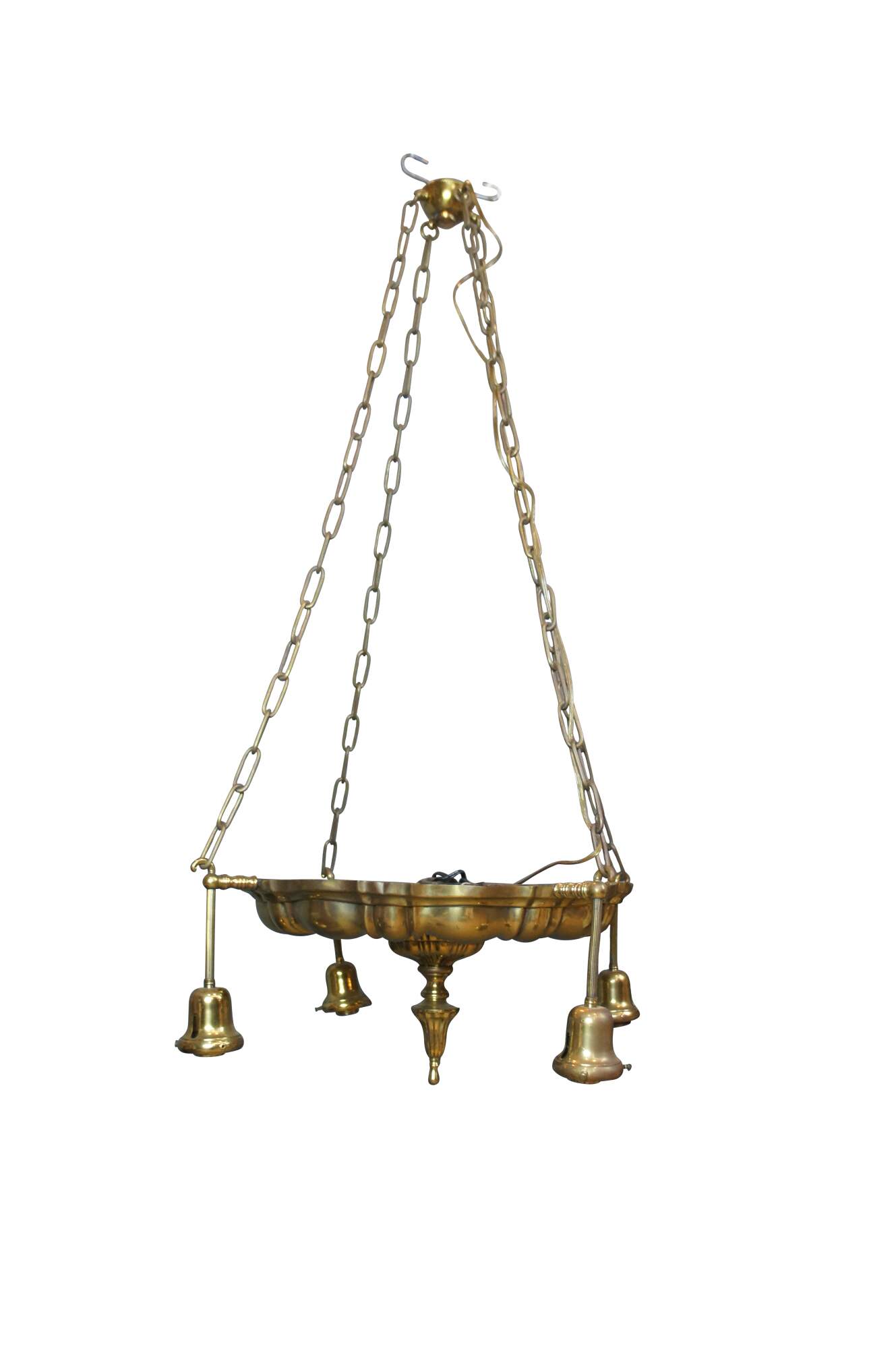 Antique Victorian drop light pendant chandelier. Made of brass featuring Hollywood Regency styling with four lights.