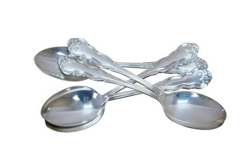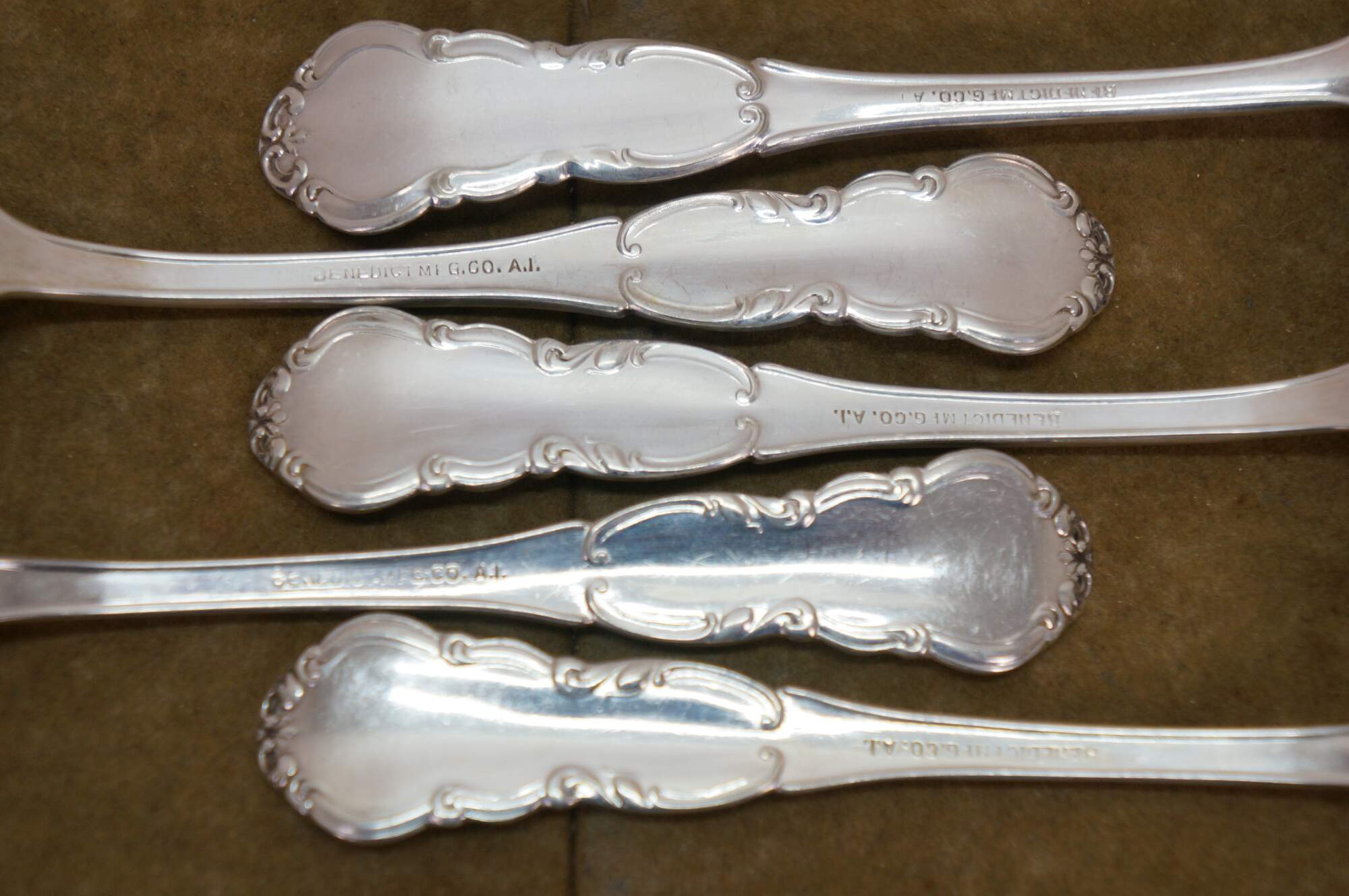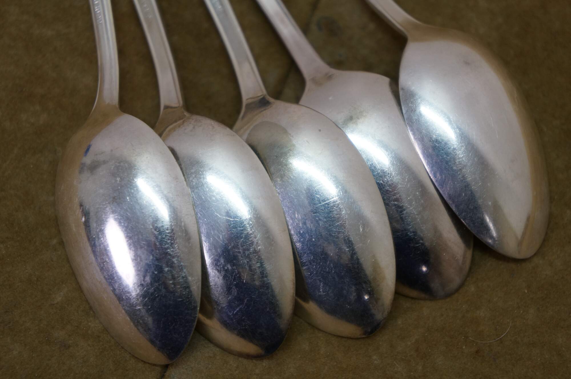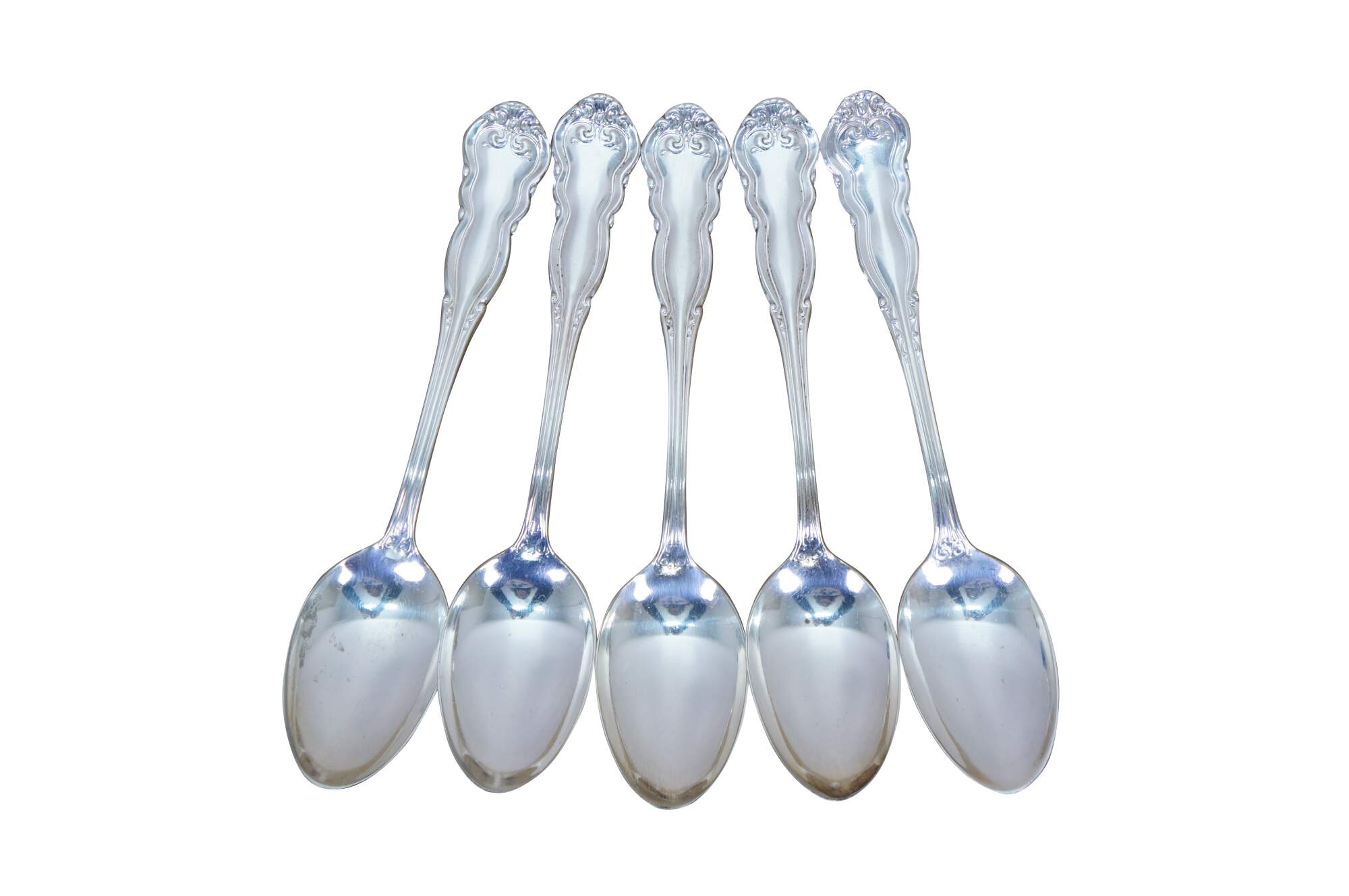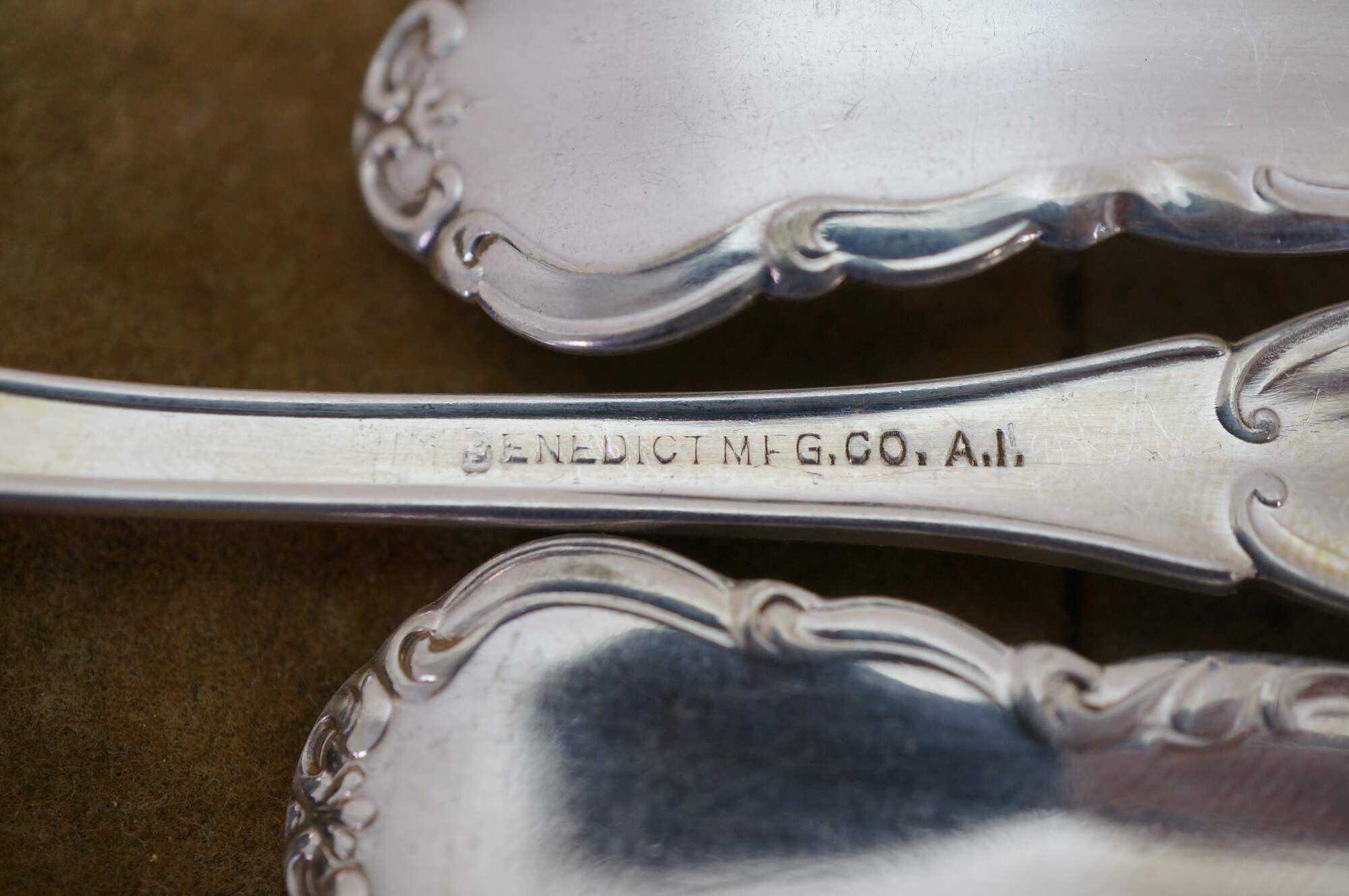 Five antique mid to early century Benedict Mfg Co high quality A1 silver plate flatware spoons. Benedict Mfg. Co., East Syracuse, New York 1894-1953.